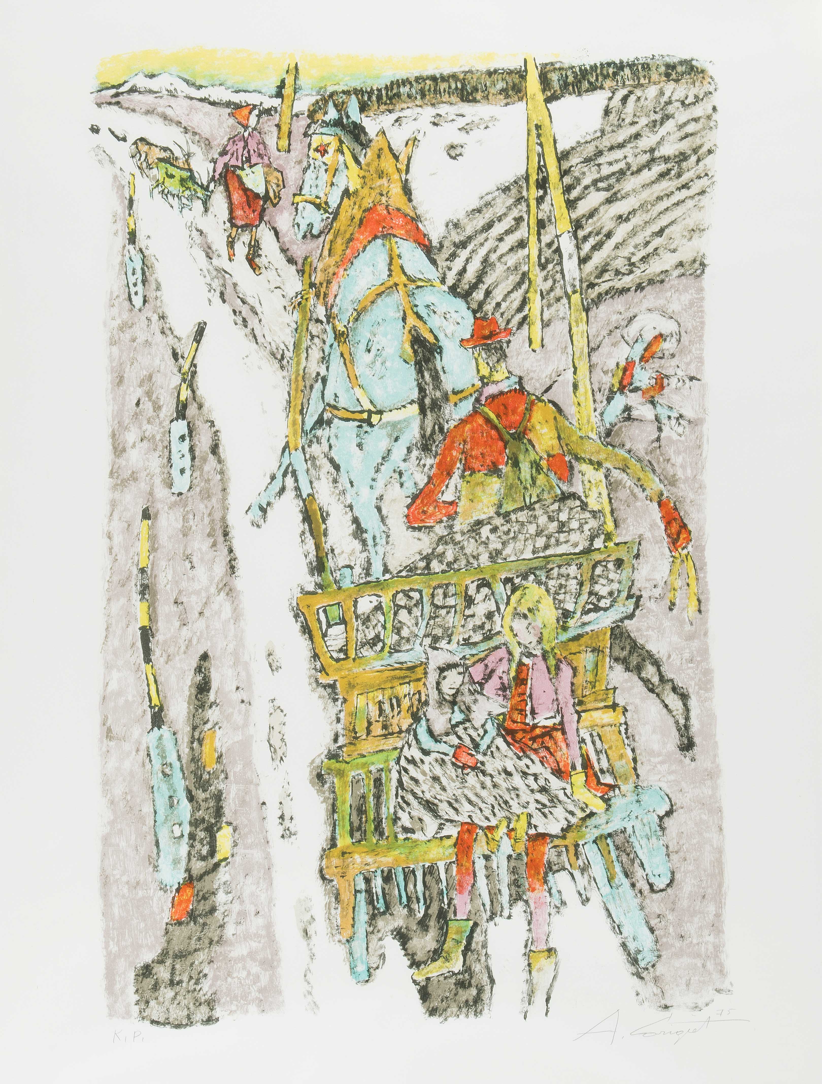 Kutschenfahrt. 1975. Farblithographie. K.P. Unten rechts in Bleistift signiert und datiert. Blattgrösse 76x55,5 cm. Gerahmt. -Blatt minimst gebräunt und wenig fleckig. Wenige Knitter. Ränder und Ecken bestossen.