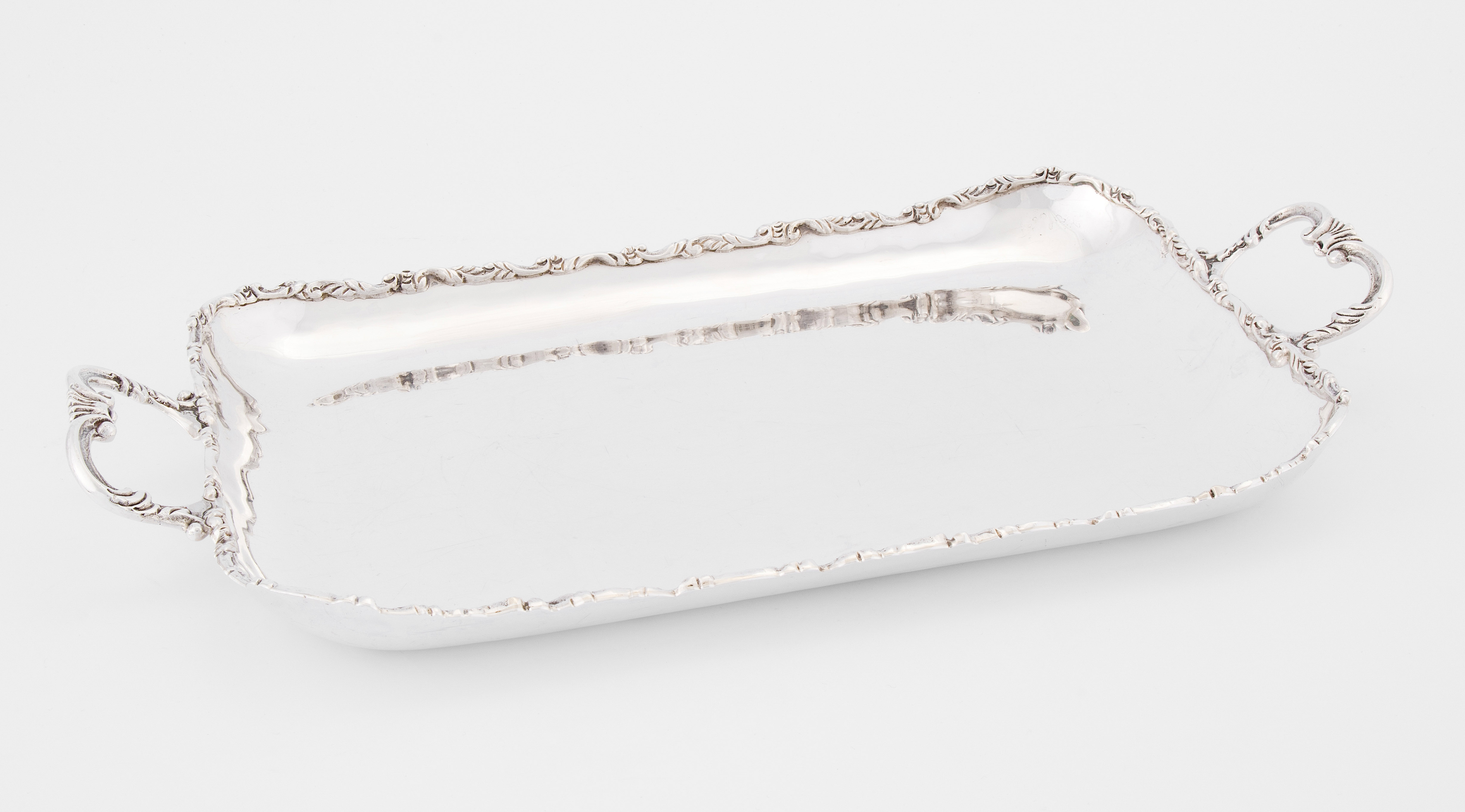 Mexiko, 20.Jh. Silber. Herstellermarke Anfer. Gerundete Rechteckform mit Blattbordüre und Rocaillenhenkeln. Gemarkt, Feingehalt 925. 34,5x23,5 cm, ca. 970 g.