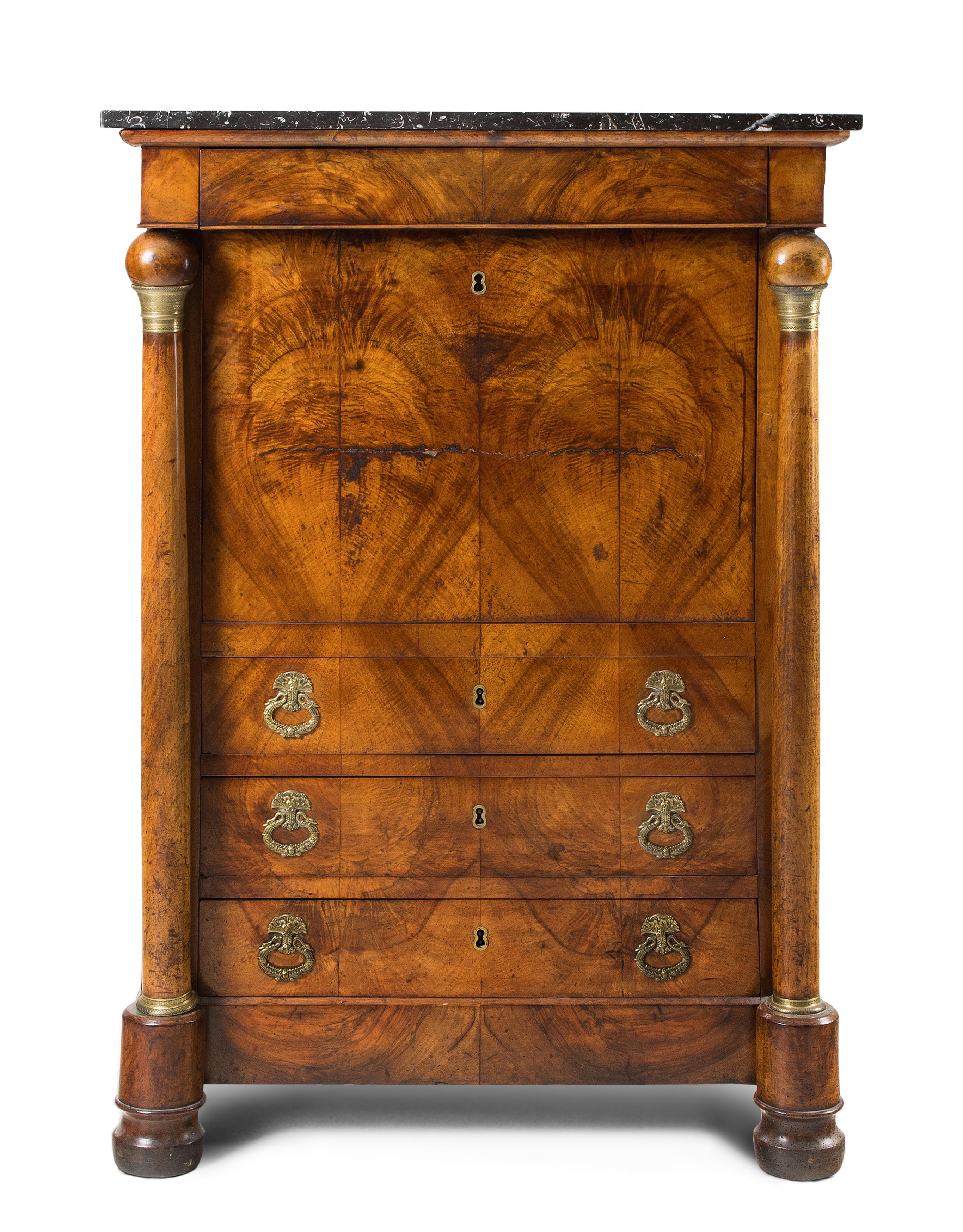 Biedermeier ca. 1820. Nussbaum, Marmor. Vierschübiger, rechteckiger Korpus auf runden Füssen. Beidseitig mit Vollsäulen mit Kugelabschluss. Schreibklappe vor mehrschübigem Innenausbau. Zu restaurieren. 87x49x145 cm.