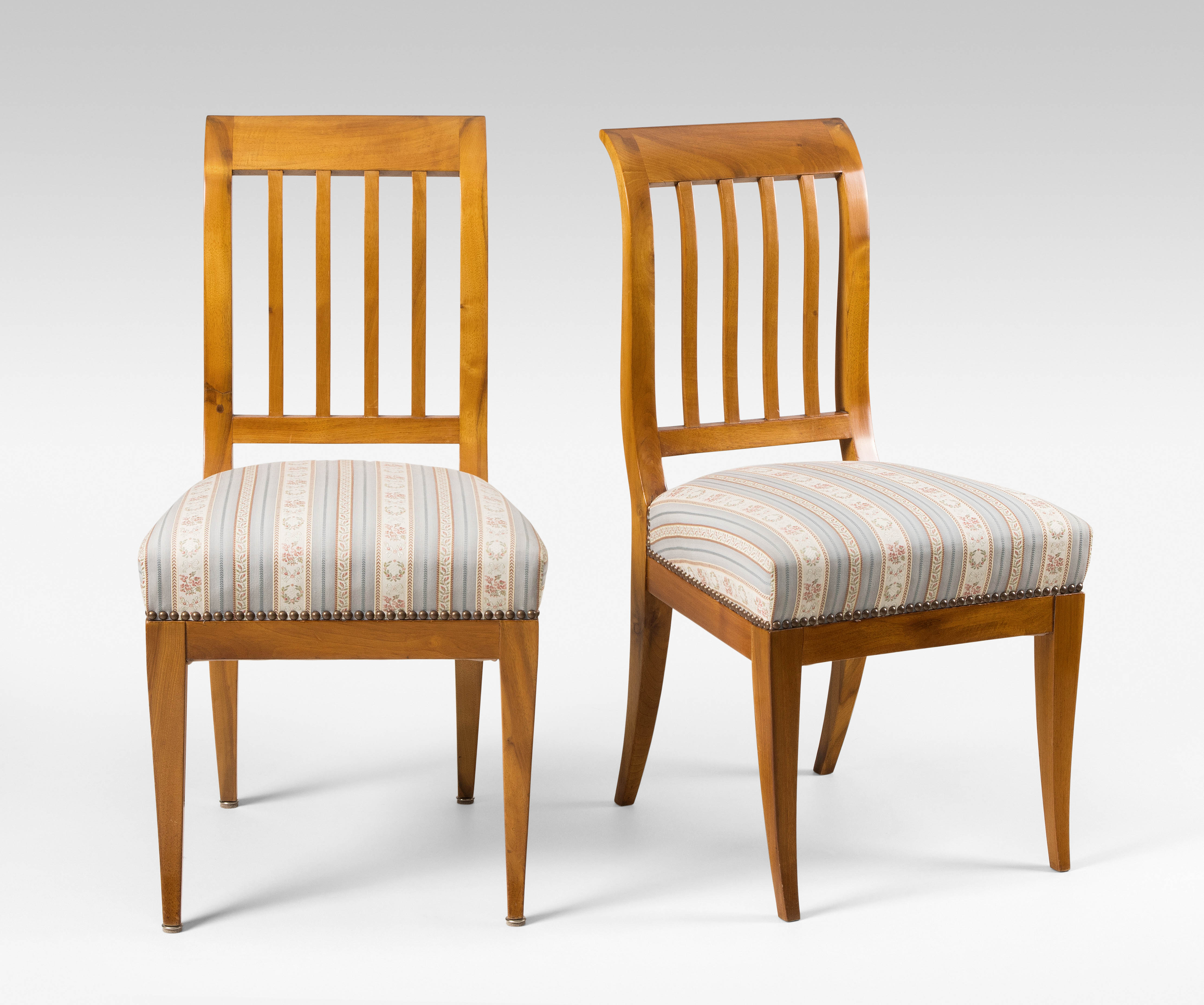 Biedermeier-Stil 20. Jh. Nussbaum. Trapezförmiges Gestell auf hohen konischen Beinen mit versprosster Rückenlehne. Bezug: Weiss-Blau gestreift. Guter Zustand. 46x52x90 cm.
