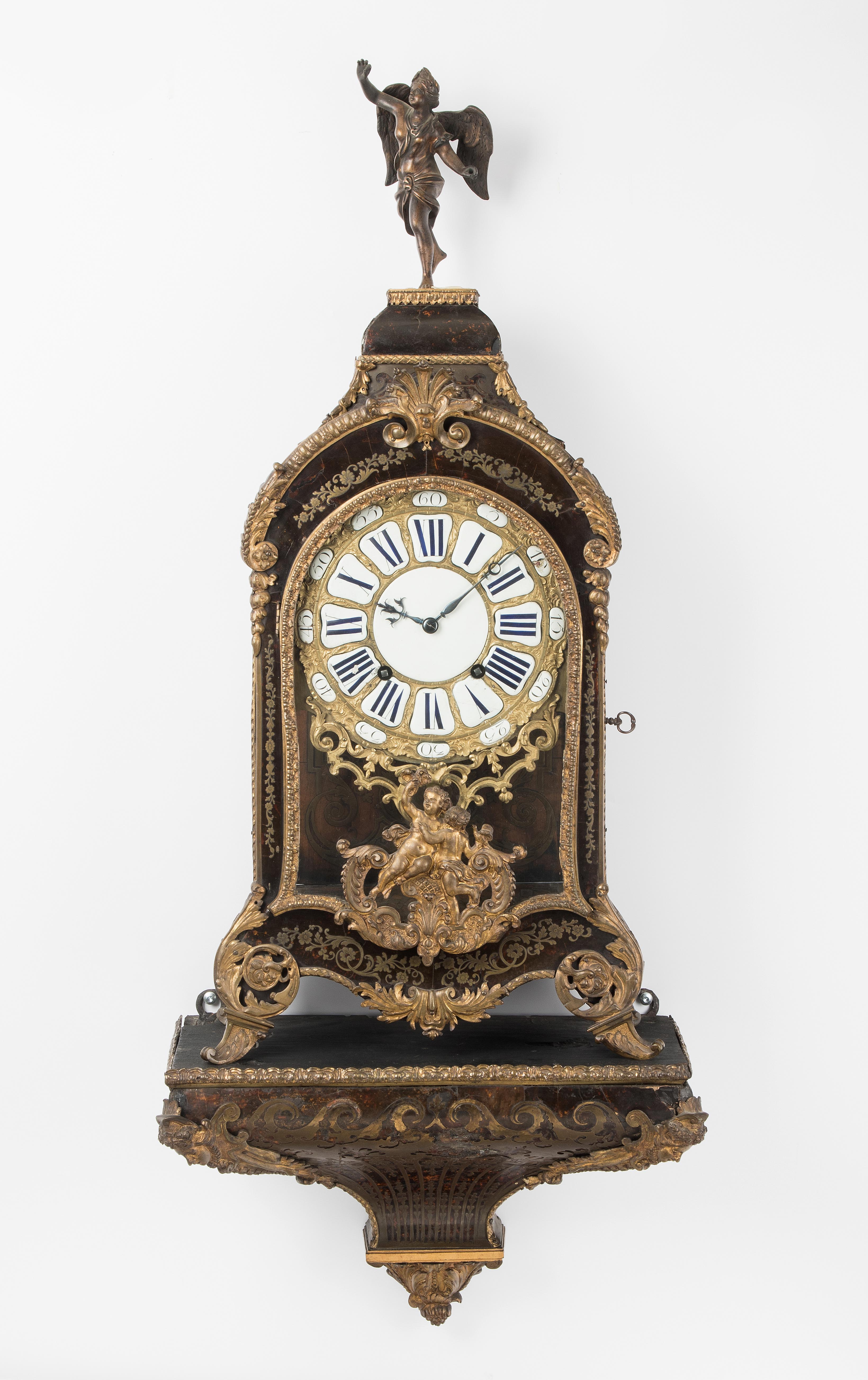 Frankreich, 18.Jh. Schildpattgehäuse mit eingelegtem Messing. Messing ist teilweise abgelöst, Gebrauchsspuren. Konturen und Füsse sind mit massivem Bronzeguss verziert. Die verglaste Fronttüre ist in massiver, verzierter Bronzeumrandung gefasst. Vor der Pendelsicht ziert ein Kinderpaar in Bronze die Fronttüre. Beidseitig verglaste Werksicht. Stehende Engelsfigur in massivem Bronzeguss auf dem Uhrenaufsatz. Zierfeder fehlt. Emailkartuschen mit römischen Stunden- und arabischen Minutenzahlen. Beschädigungen bei 8 Uhr und 2 Uhr. Emailzentrum. Ziffern und Zentrum sind in massivem, reich verziertem Bronzezifferblatt eingelassen. Spindelwerk mit Hinterpendel an Fadenaufhängung. Halbstunden- und Stundenschlag auf Glocke. Zu revidieren. 85x38 cm, ohne Sockel gemessen. Zwei Schlüssel beigegeben.