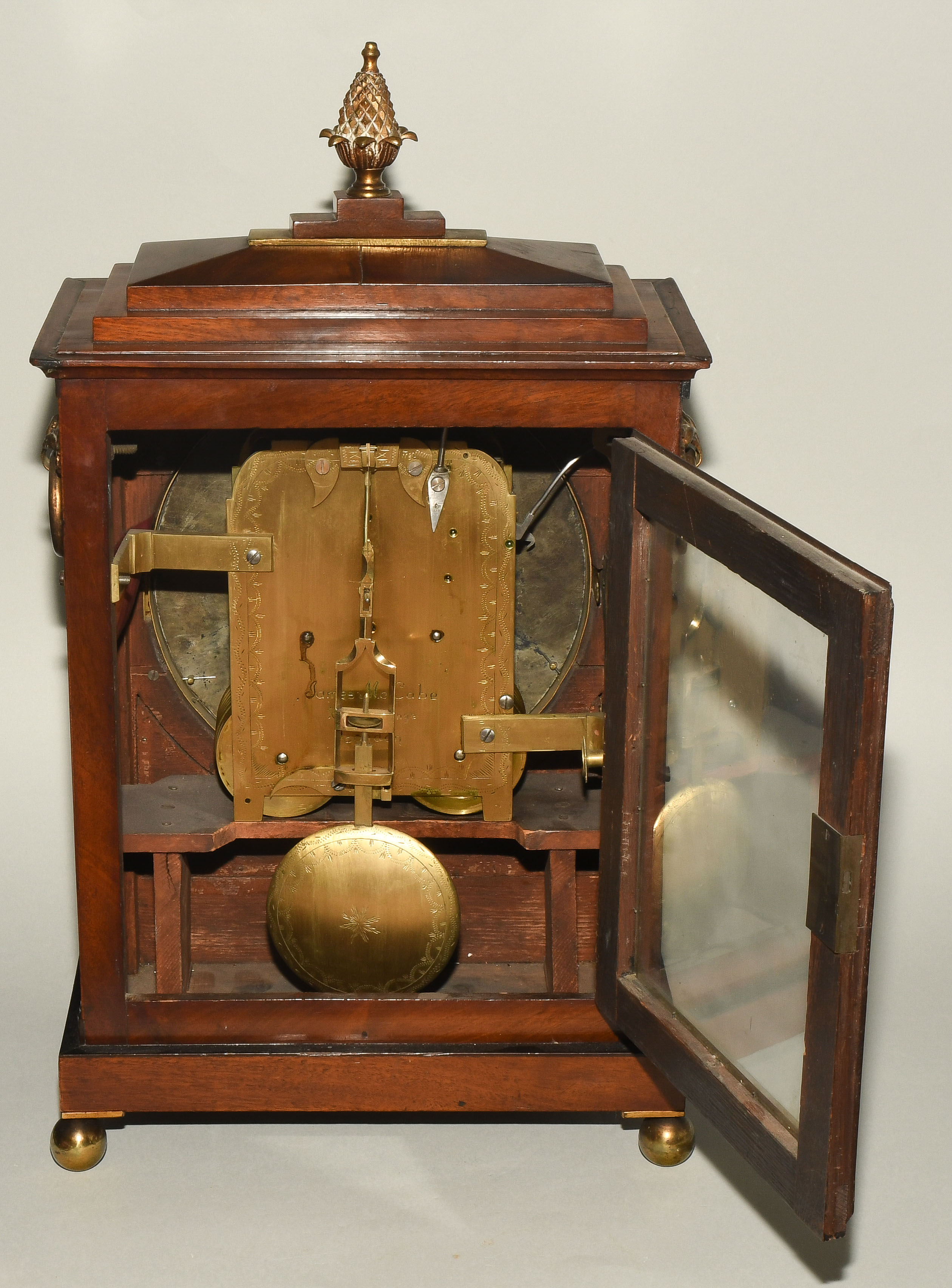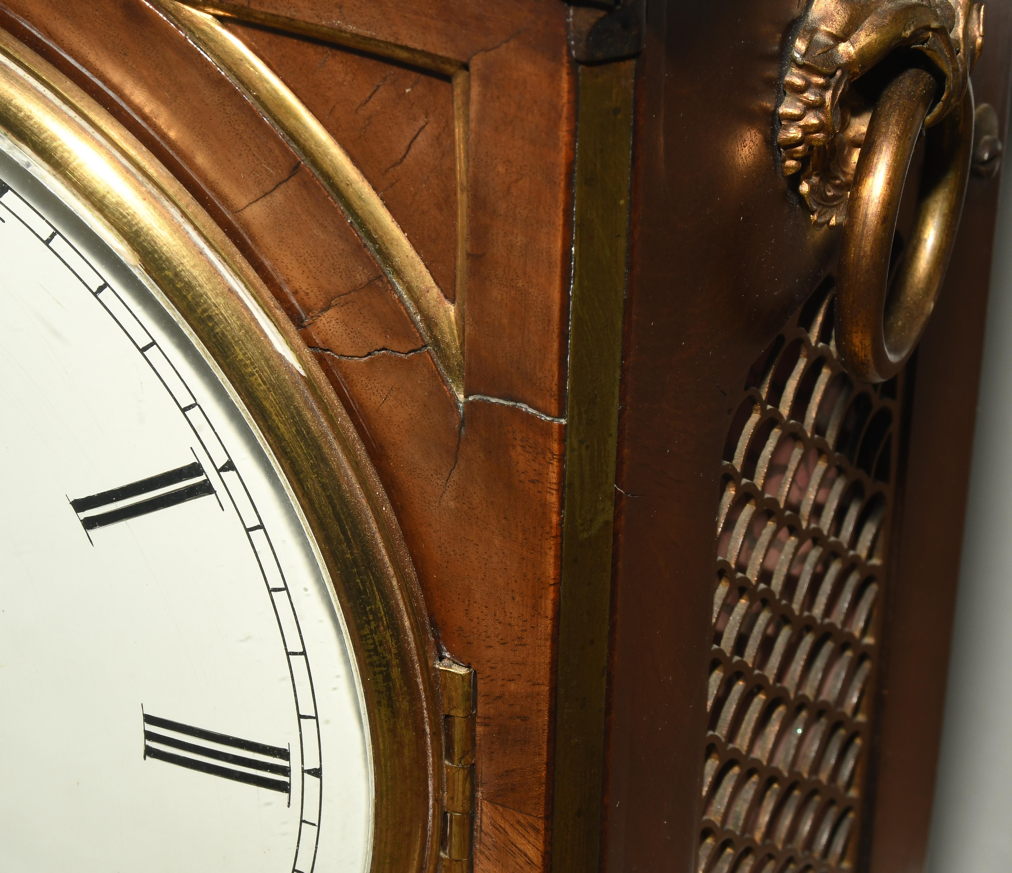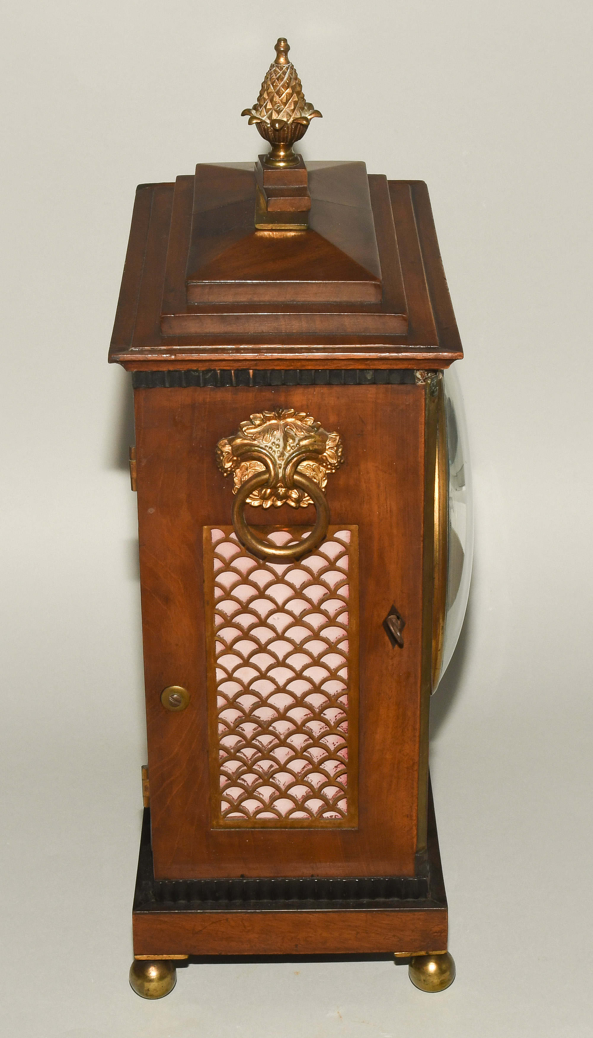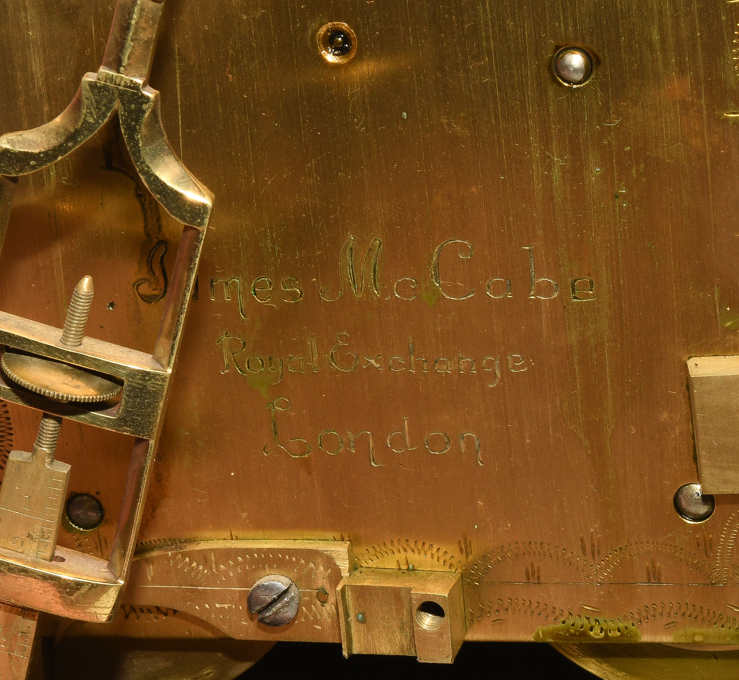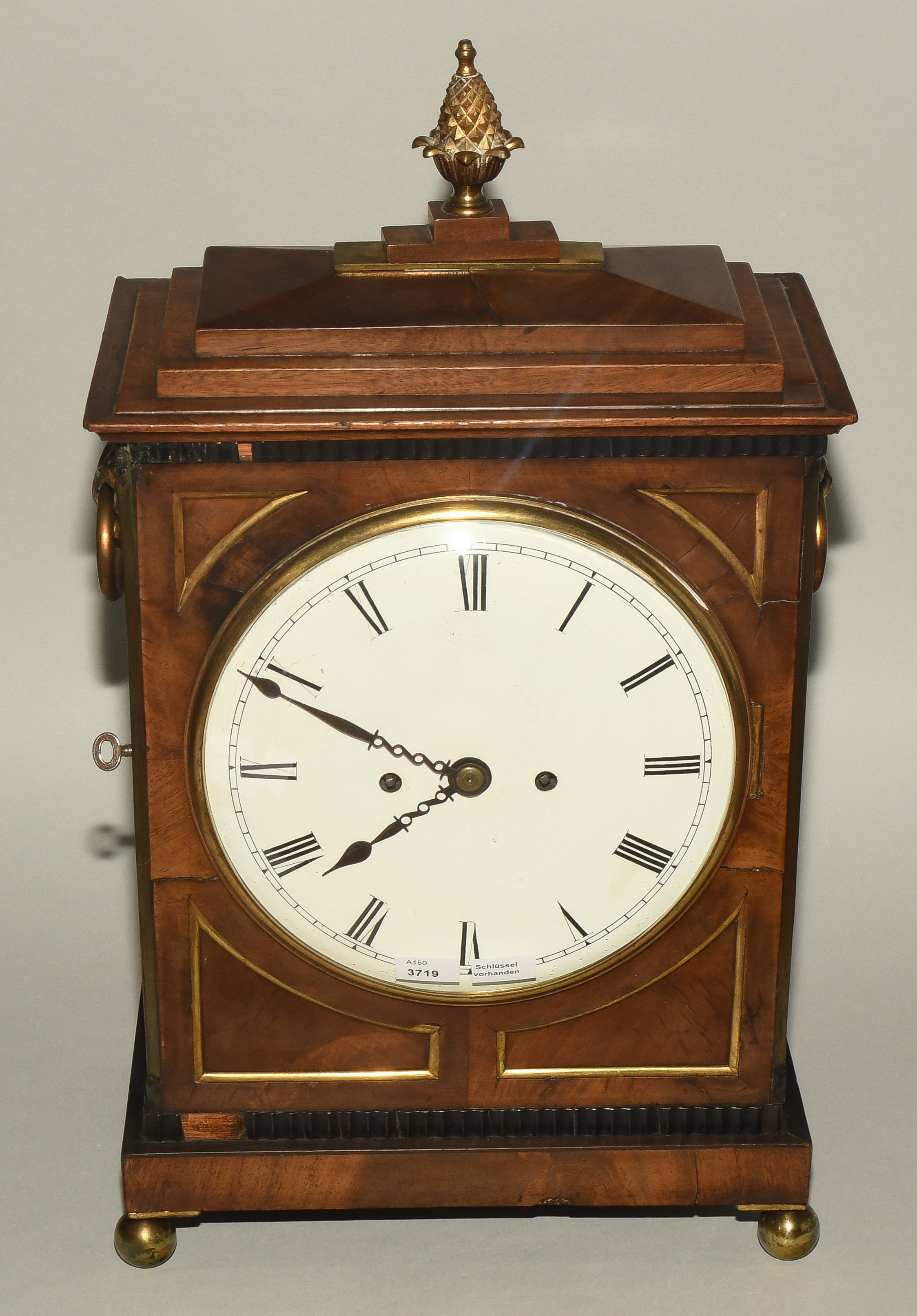 England, 2.Hälfte 18.Jh. Holzgehäuse mit Einlegearbeiten. Seitliche bronzene Traggriffe und Bronzeverzierung als Krönung. In Messig gefasses, verglastes Ziffertürchen. Verglastes Werkstürchen. Emailzifferblatt mit römischen Stundenzahlen. Ankerwerk mit schwerem Hinterpendel an Federaufhängung. Signierte Werksplatte "James Mc.Cabe Royal Exchange London". Stundenschlag auf Glocke. Werksplatte und Pendel mit feinen Ritzarbeiten. Gehfähig. 49x28 cm. Schlüssel beigegeben.