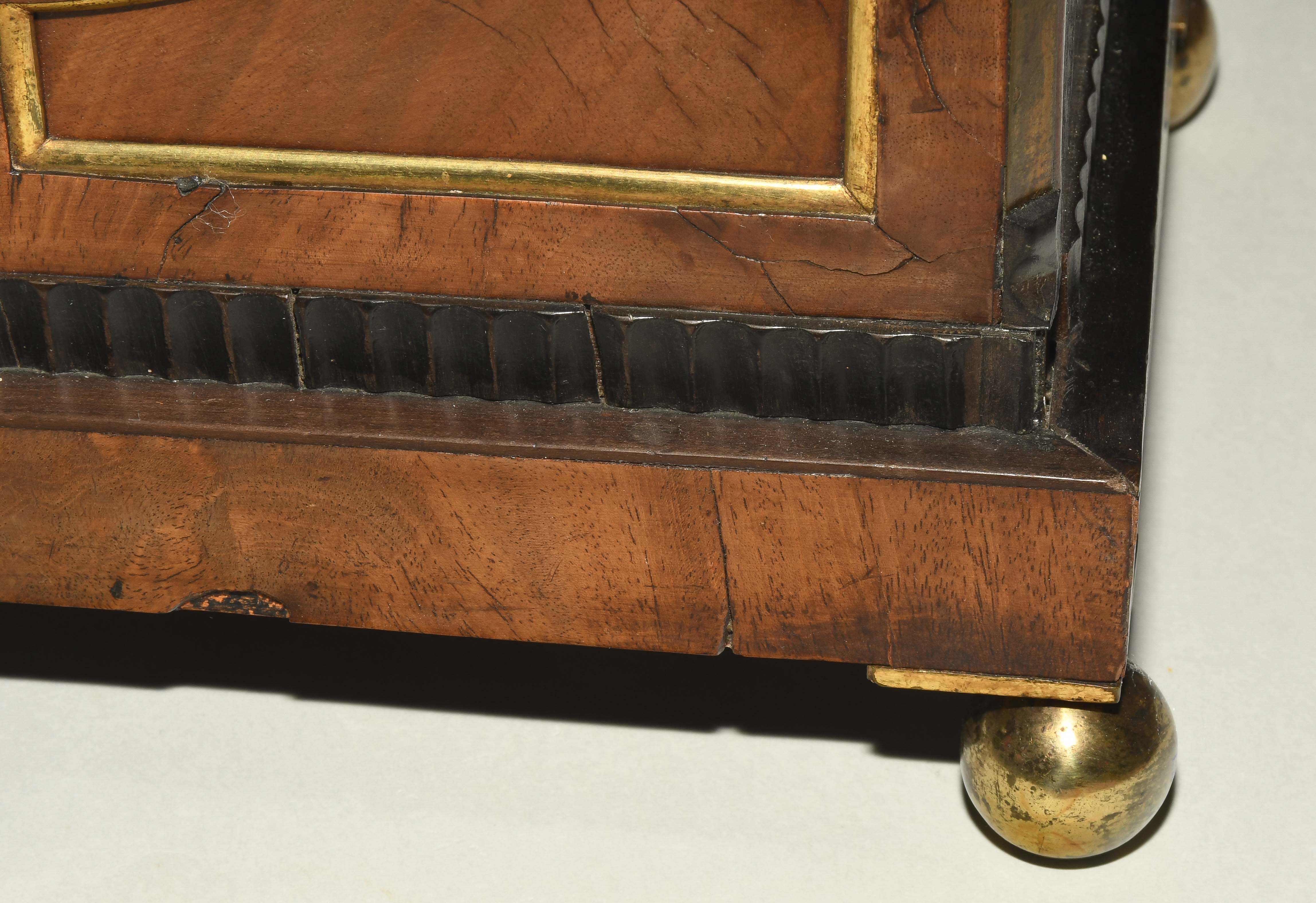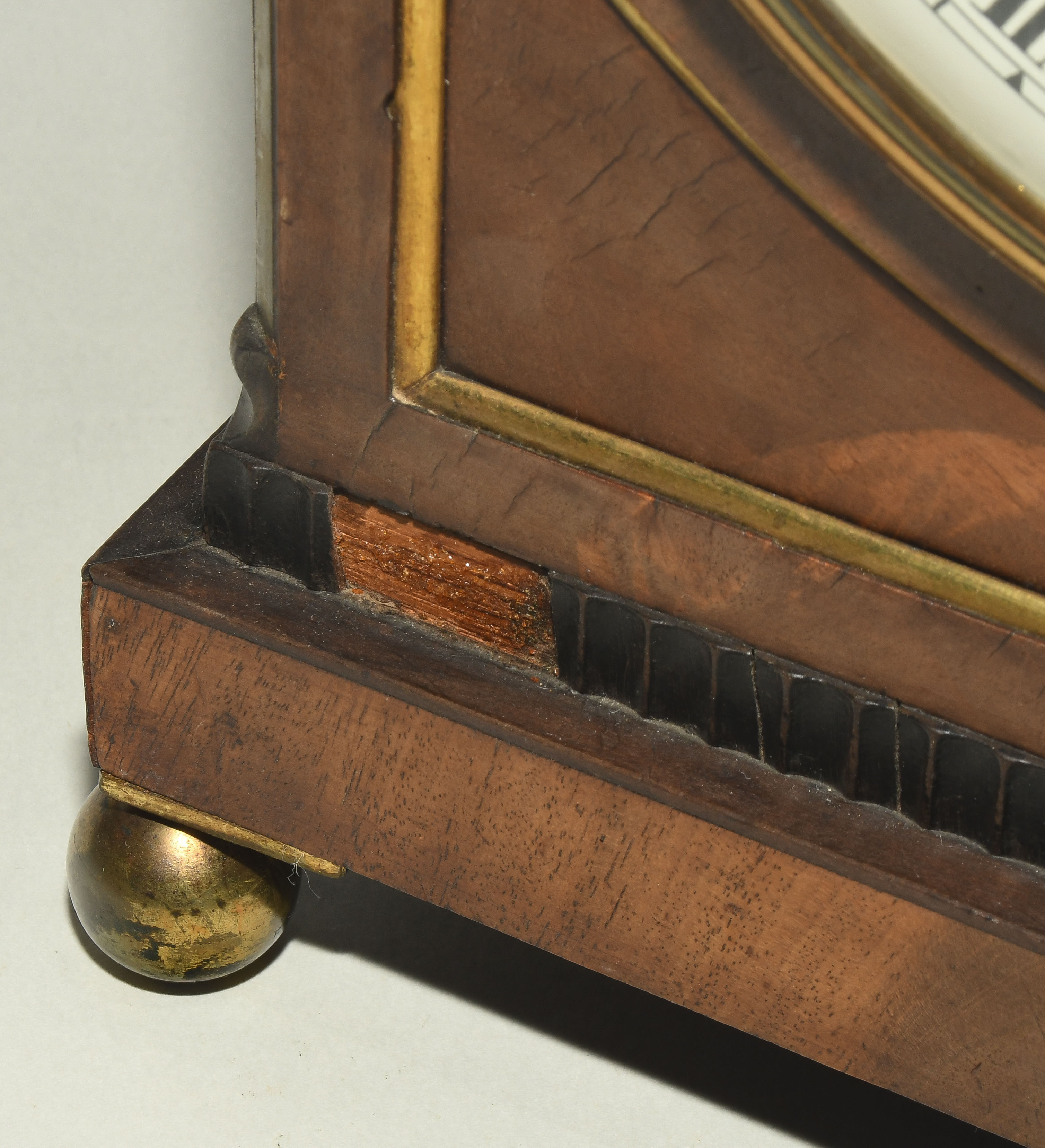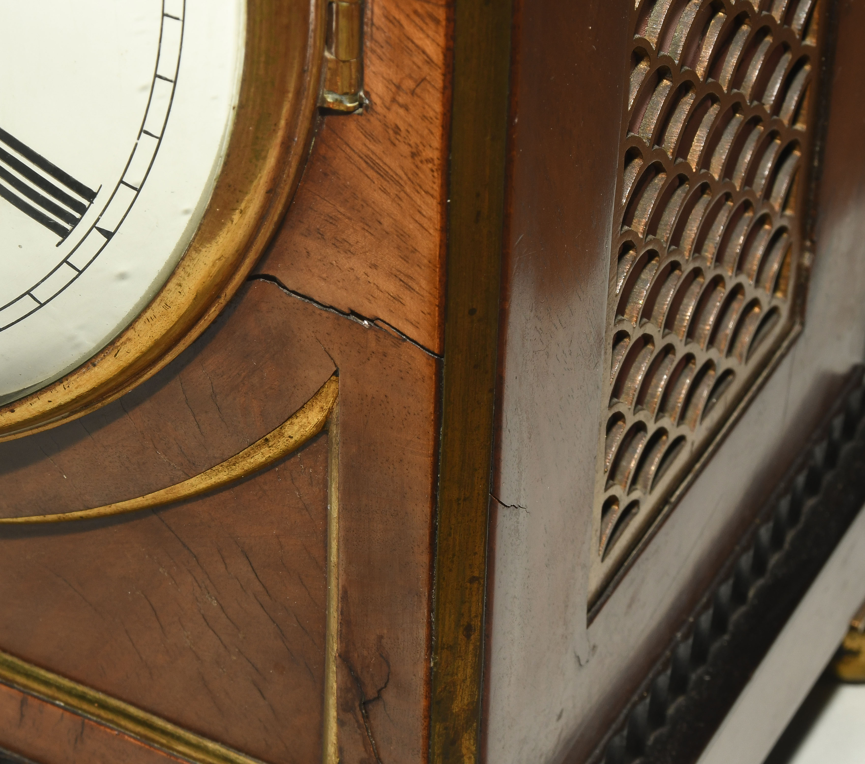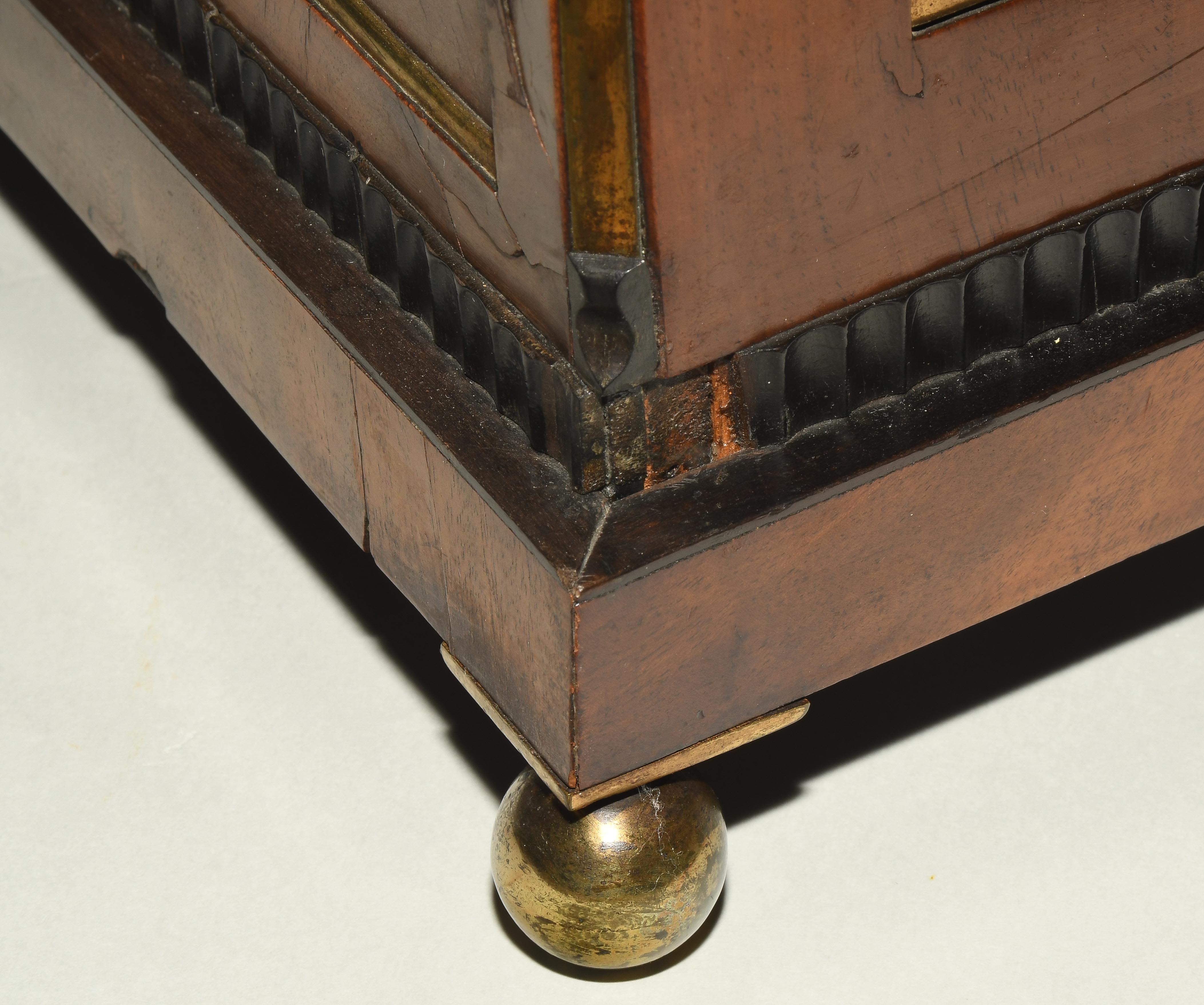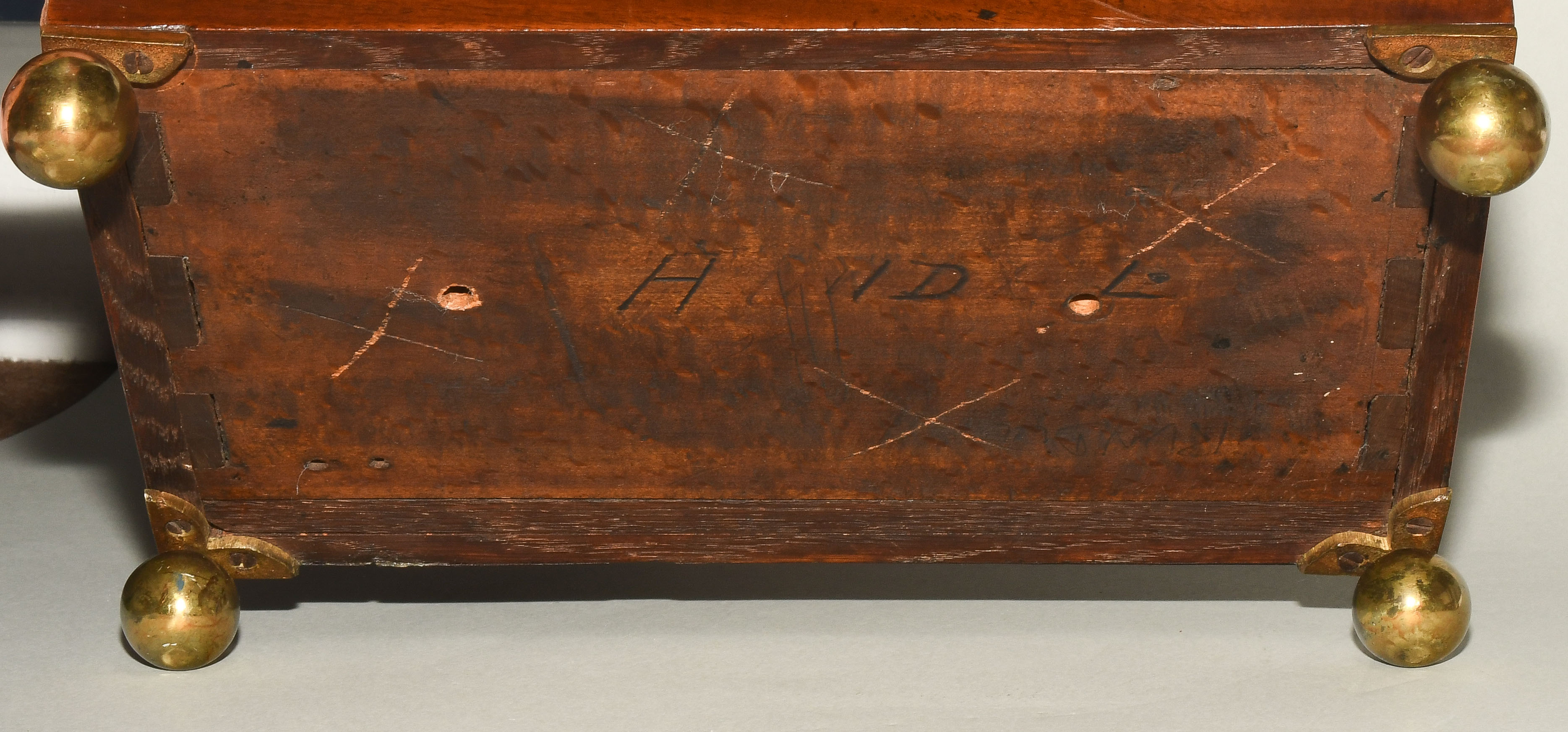 England, 2.Hälfte 18.Jh. Holzgehäuse mit Einlegearbeiten. Seitliche bronzene Traggriffe und Bronzeverzierung als Krönung. In Messig gefasses, verglastes Ziffertürchen. Verglastes Werkstürchen. Emailzifferblatt mit römischen Stundenzahlen. Ankerwerk mit schwerem Hinterpendel an Federaufhängung. Signierte Werksplatte "James Mc.Cabe Royal Exchange London". Stundenschlag auf Glocke. Werksplatte und Pendel mit feinen Ritzarbeiten. Gehfähig. 49x28 cm. Schlüssel beigegeben.