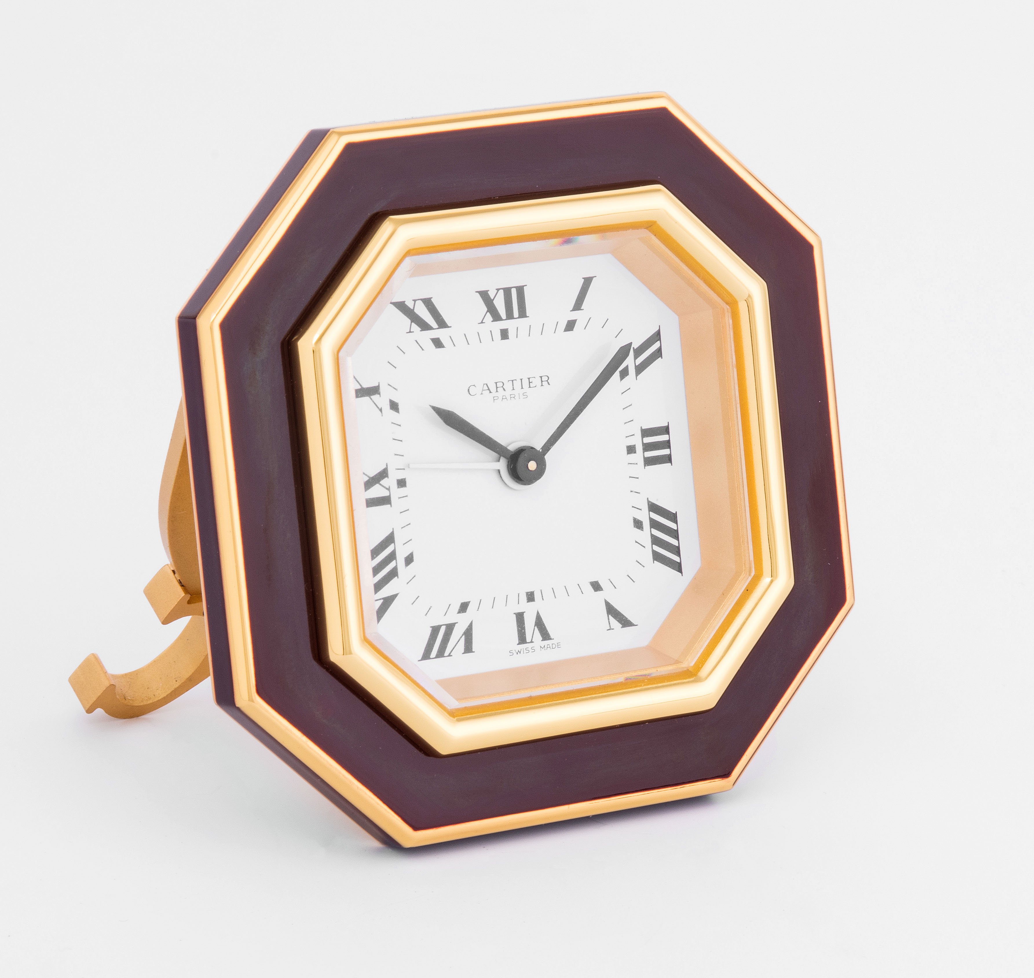 Schweiz, 20.Jh. Achteckiges-, vergoldetes Messinggehäuse mit rotem Stein besetzt. Weisses Zifferblatt mit römischen Zahlen und Signatur "Cartier Paris". Achttage-Unruhewerk mit Weckerfunktion. Gehfähig. 7,5x7,5 cm.