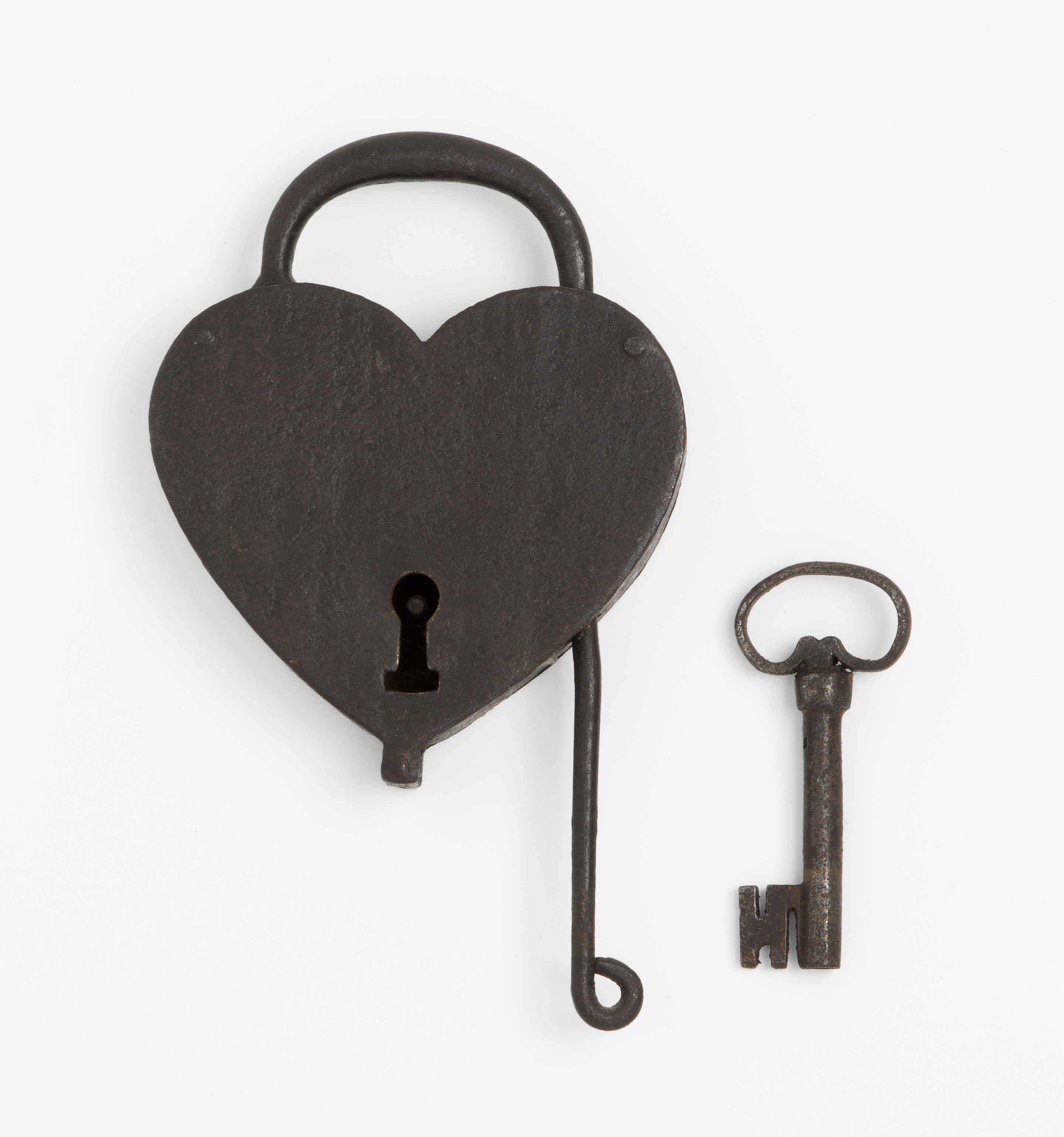 18.Jh. Eisen. Herzform. Bügel mit verlängertem Arretierungsstab. Hohldornschlüssel assortiert, nicht passgenau. H 16,5 cm.