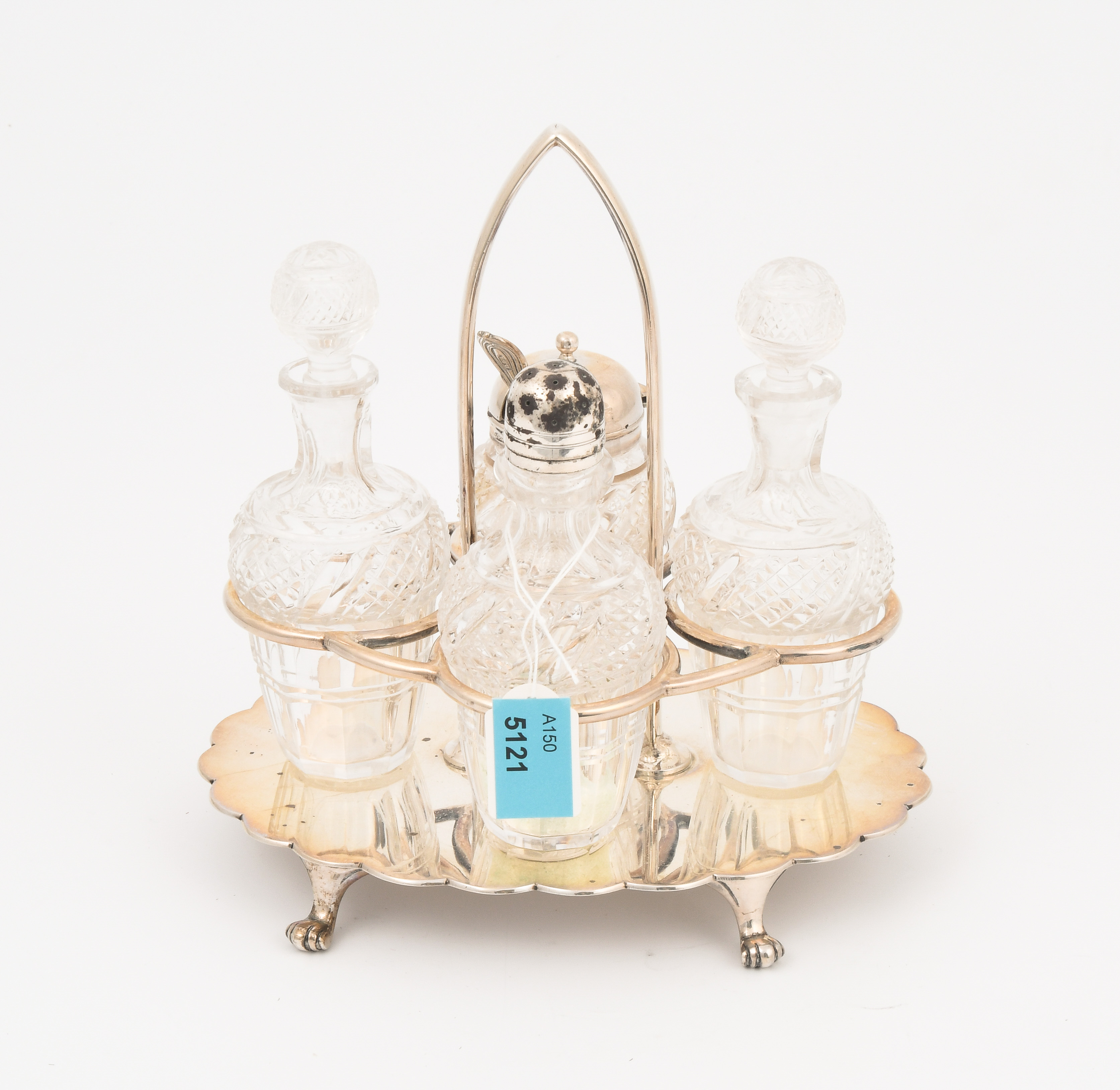 Sheffield, 1910. Silber/Glas. Herstellermarke Walker & Hall. Passige Plattform auf Tatzenfüsschen, darauf Ständer mit zentralem Griff, darin 2 Karaffen, 1 Streuer und 1 Senftöpfchen. Gemarkt, Feingehalt 925. H 17 cm, ca. 390 g.