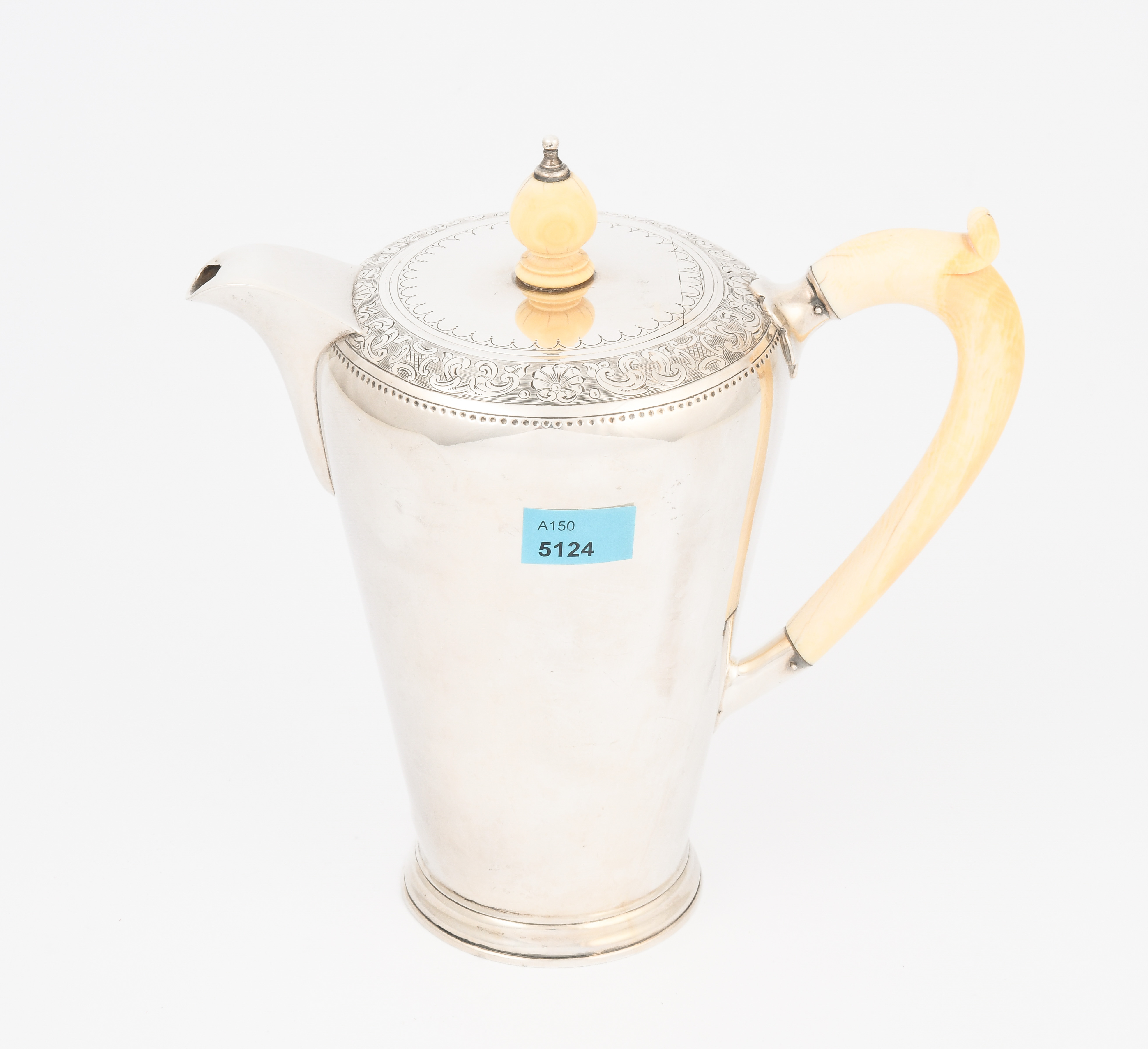 London, 1905. Silber. Herstellermarke Edward Barnard & Sons Ltd. Konische Zylinderform auf rundem Stand, Schnabelausguss, balusterförmiger Deckelknauf und C-Henkel. Schulterpartie ornamental graviert. Gemarkt, Feingehalt 925. H 20 cm, ca. 584 g.