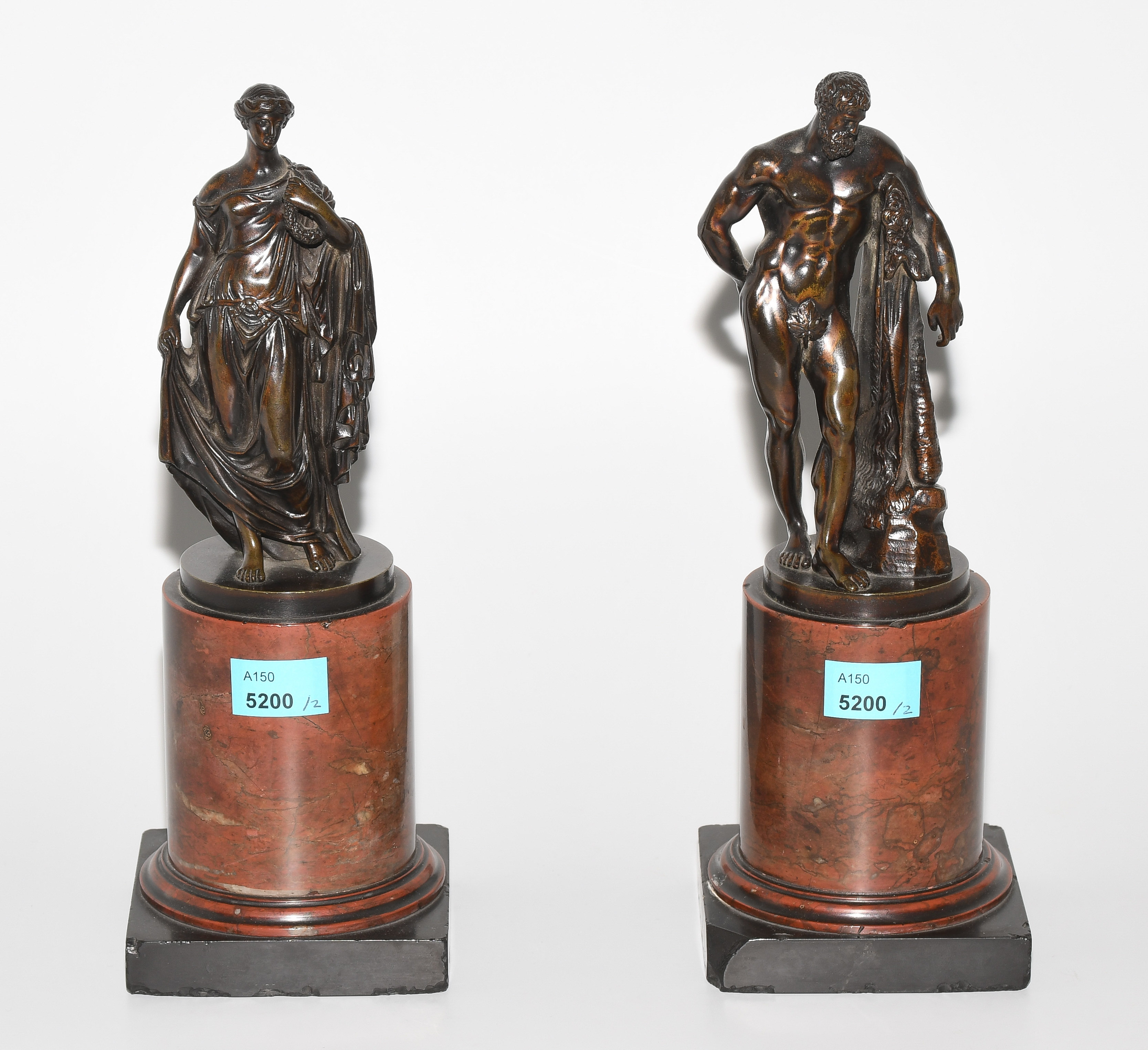 In der Art der Antike, um 1900. Bronze, dunkel patiniert. Herkules bzw. Minerva auf zylinderischem Steinsockel. H 23 cm.
