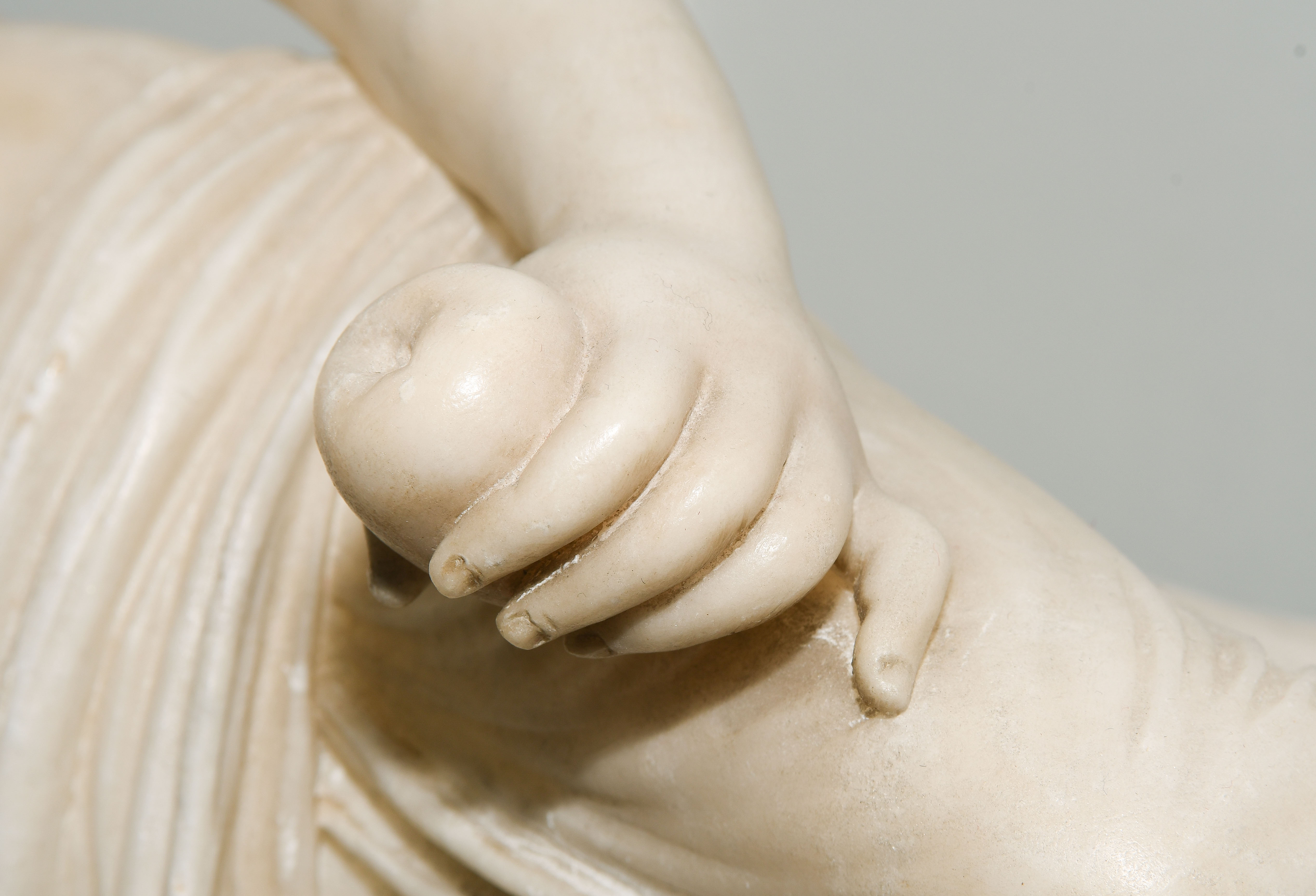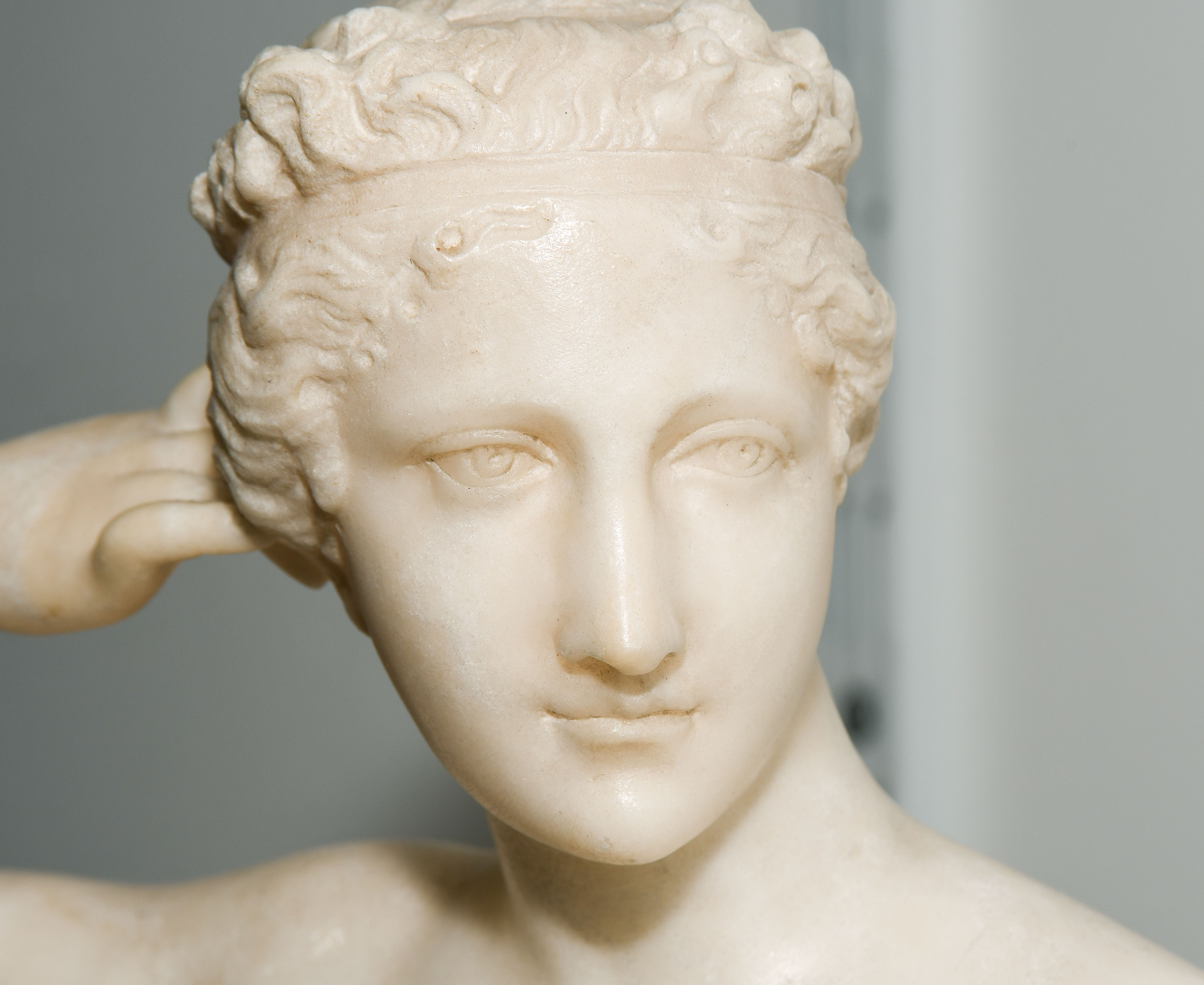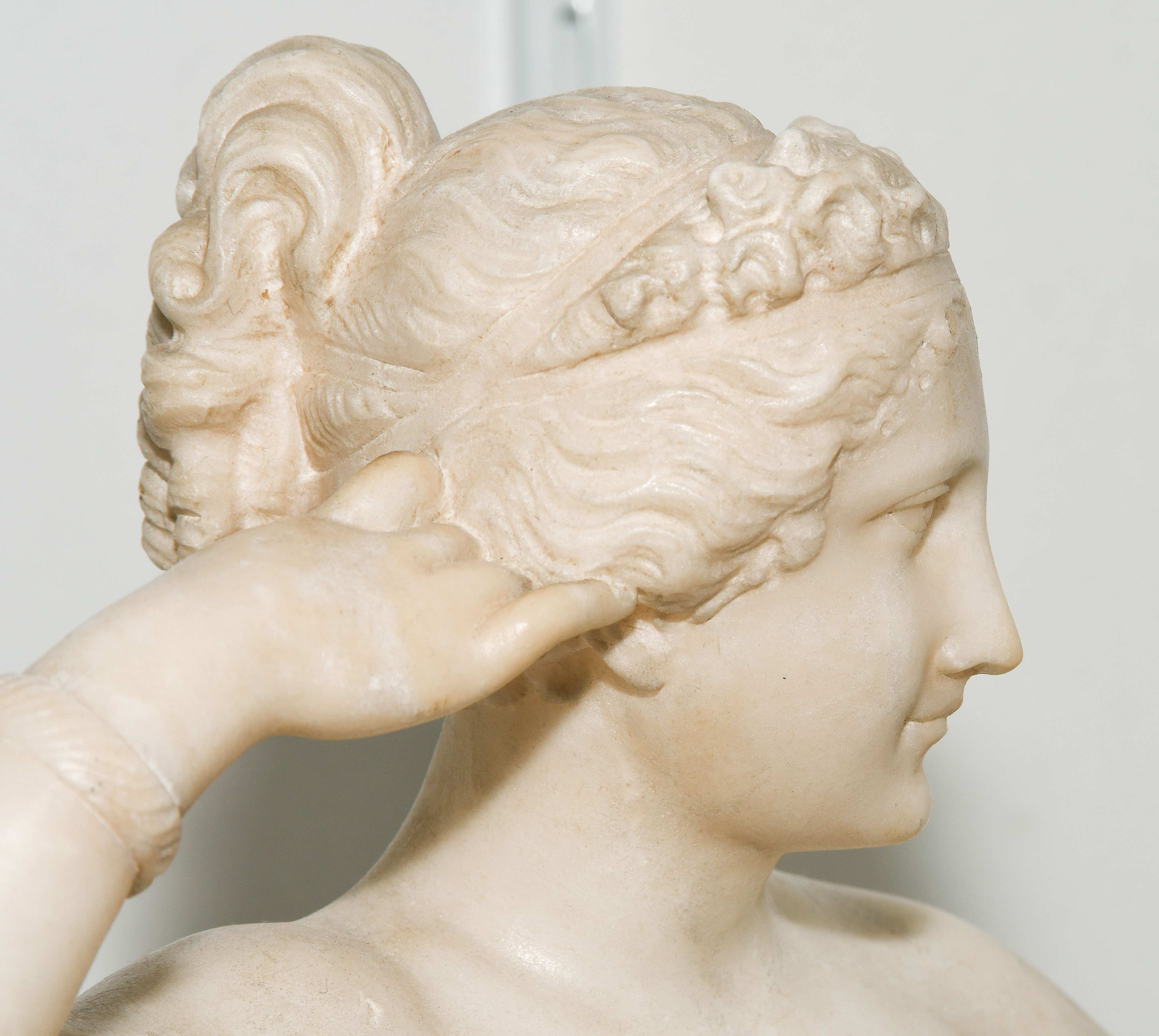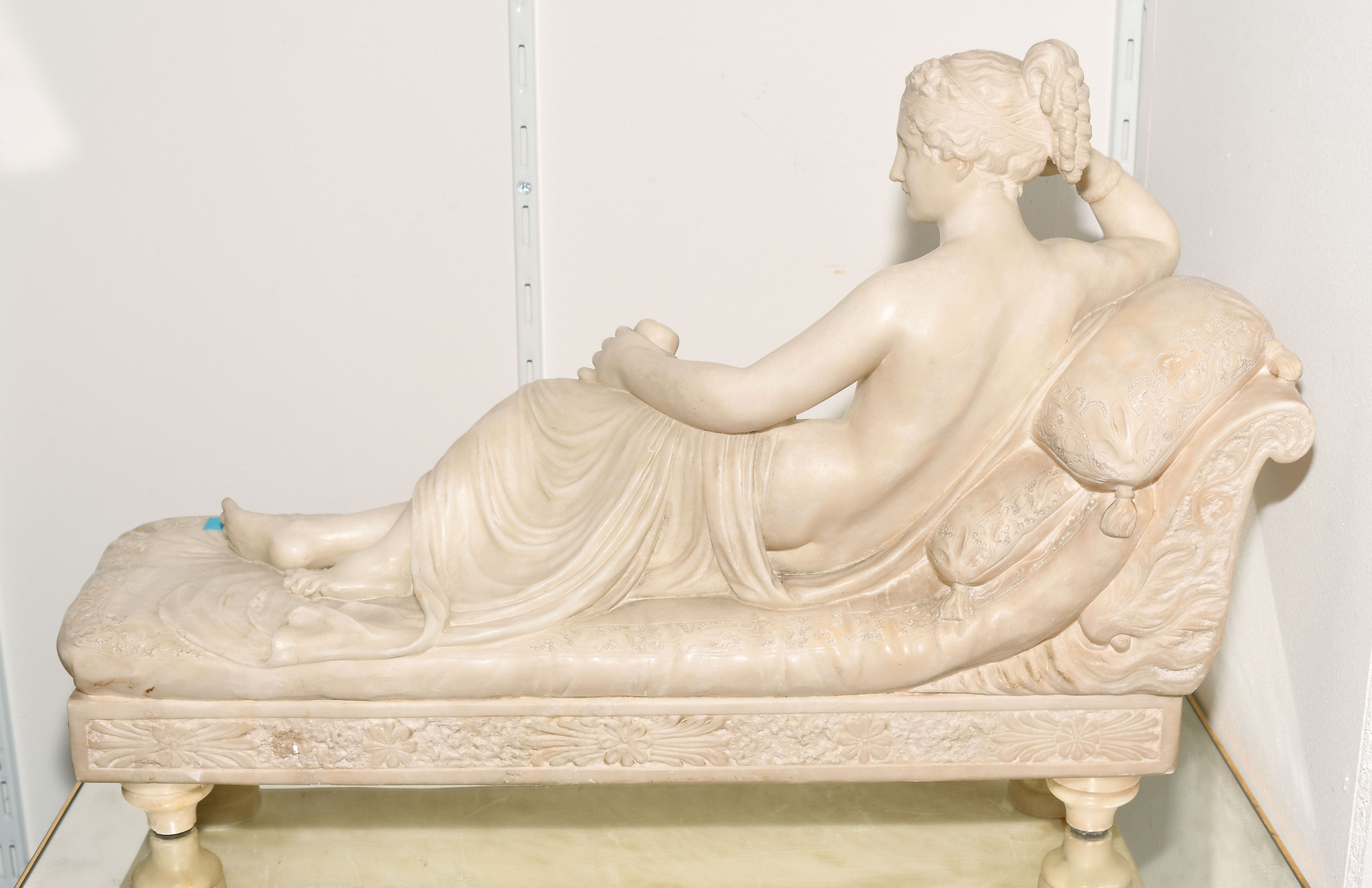 Um 1900. Unbezeichnet. Alabaster, weiss. Nach einem Modell von Antonio Canova "Ruhende Venus". L 57 cm.