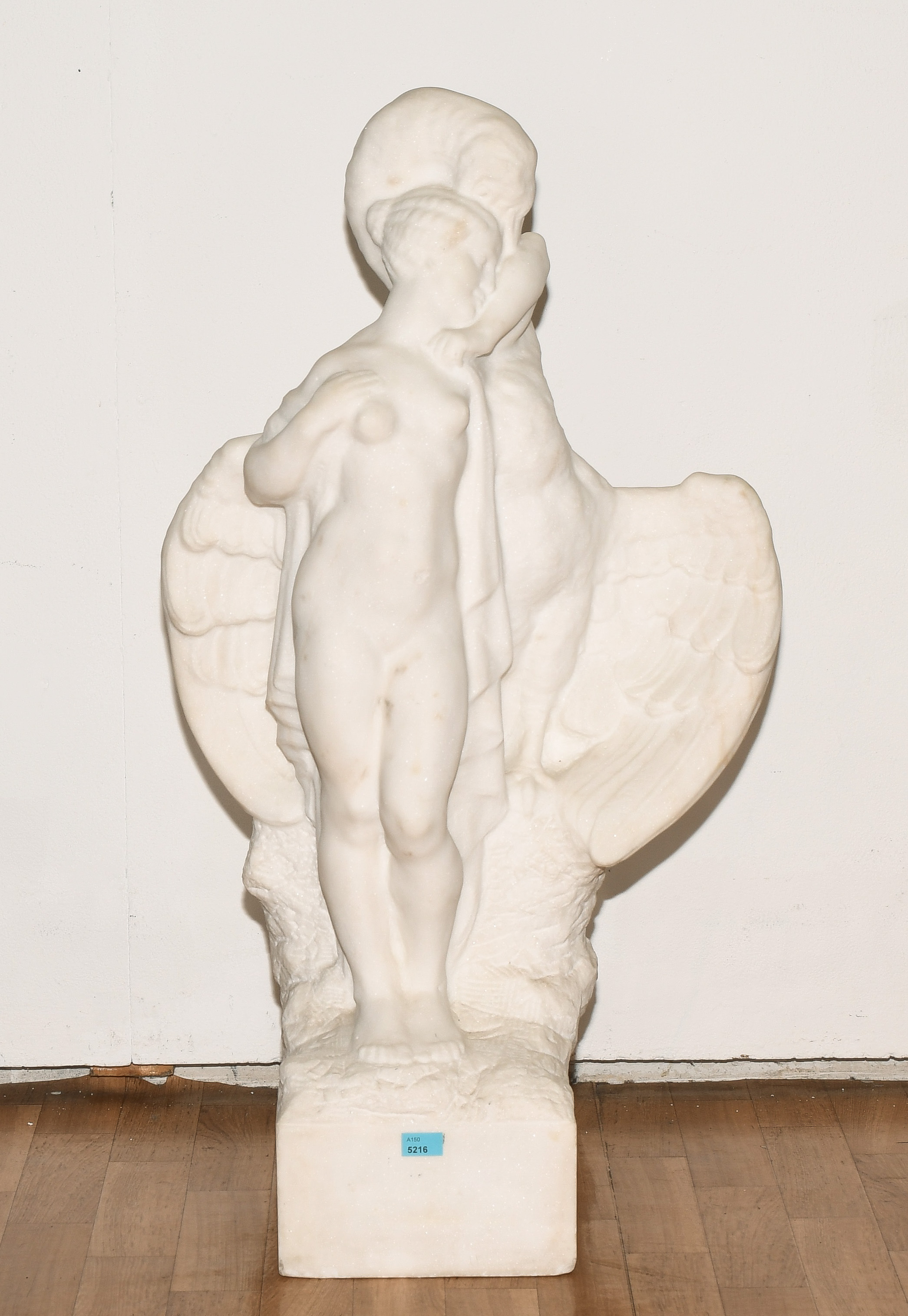 20.Jh. Marmor, weiss. Bezeichnet: "E. Moremon". Leda mit Schwan. Auf quadratischem Terrainsockel. H 72 cm.