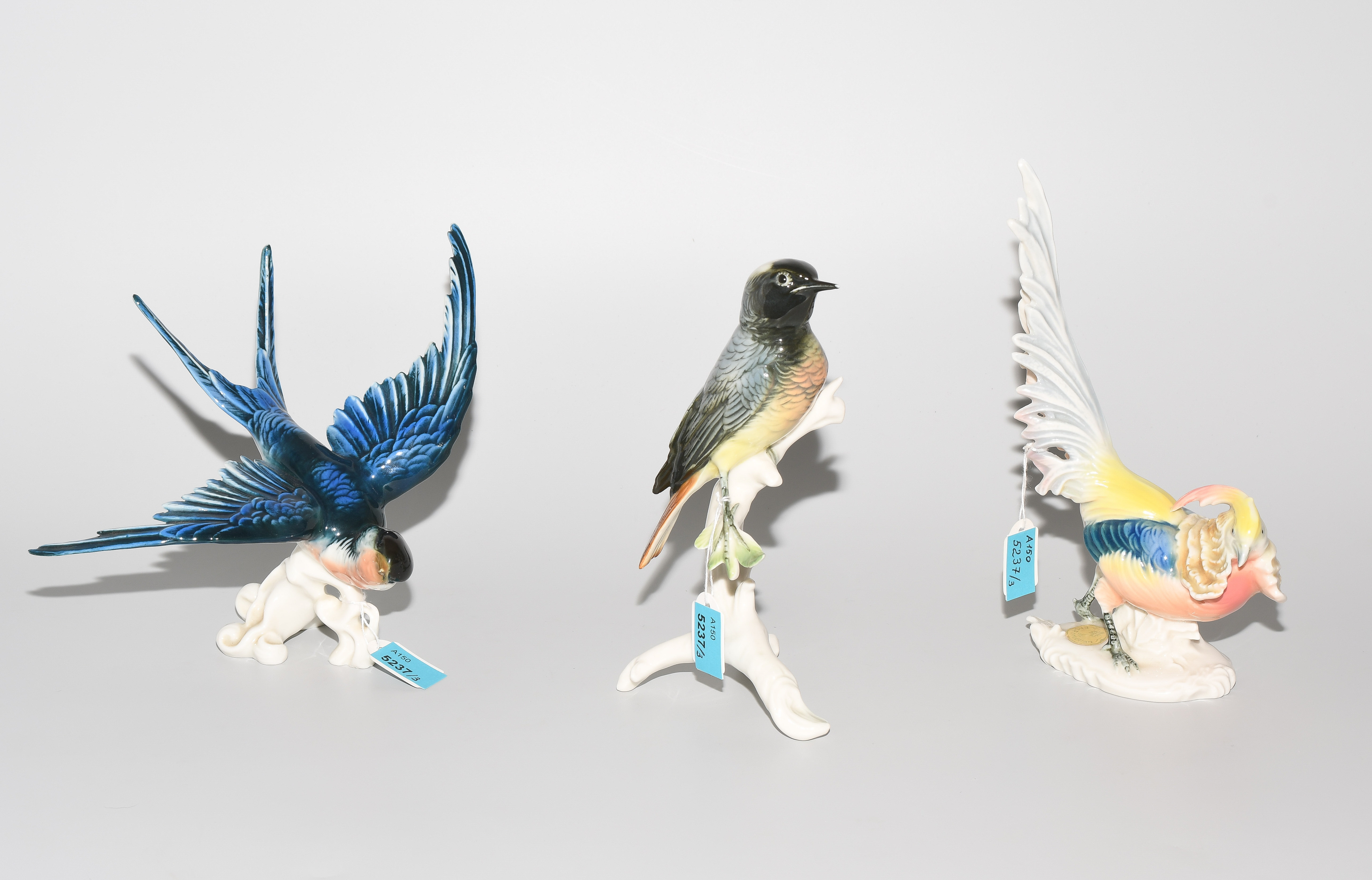 Ens, Rudolstadt, 20.Jh. Porzellan, polychrom bemalt. Schwalbe, Fink bzw. Fasan auf Ast bzw. auf Terrainsockel sitzend. H 14,5–19 cm.