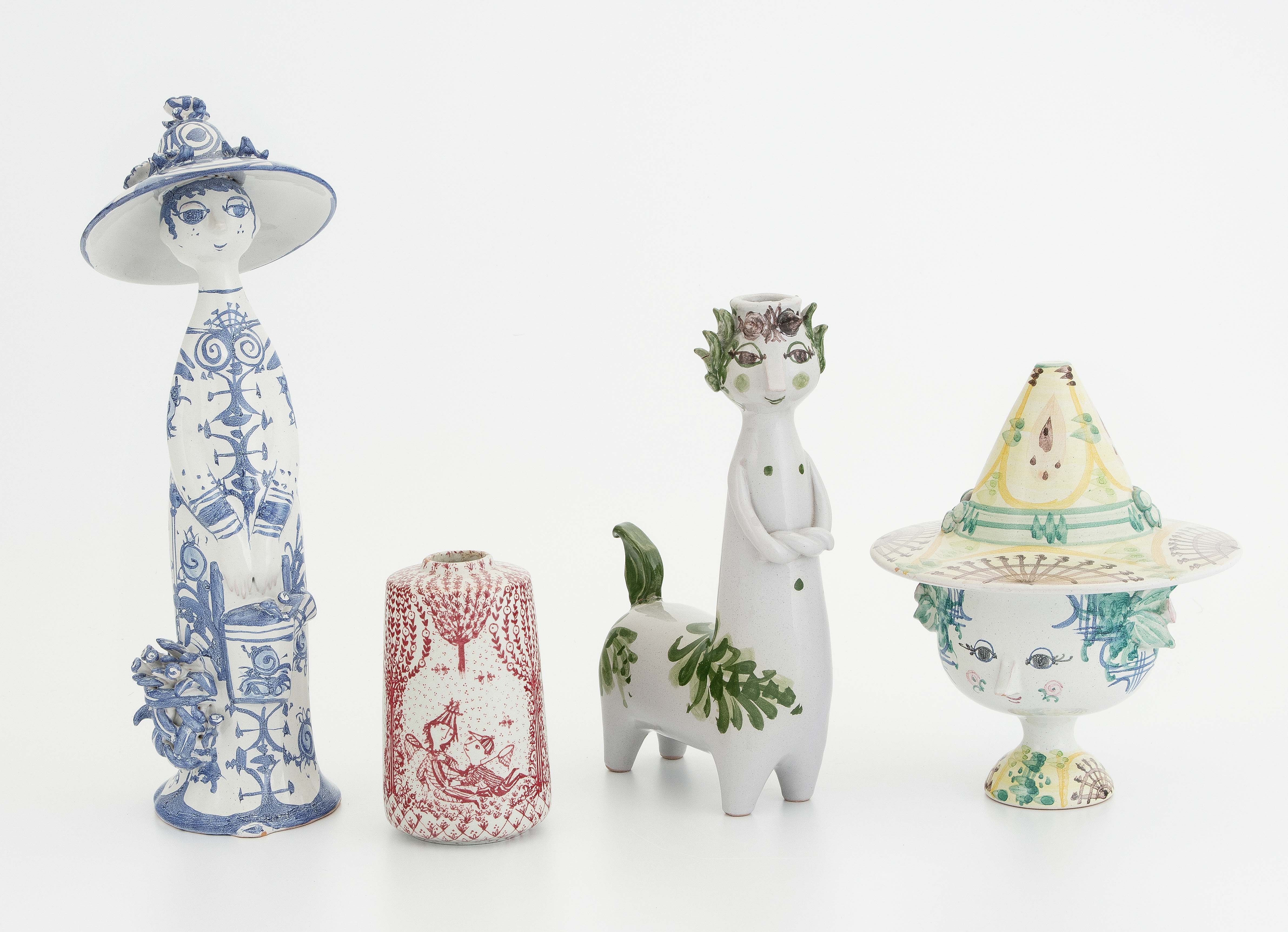 Denmark, um 1960–1970. Modell von Björn Wiinblad. Keramik, polychrom bemalt. Bestand: Figur "Sommer" in Blau, Kerzenstock "Zentaur" in Grün, figürliche Deckeldose polychrom staffiert bzw. Väschen "Prelude" in Rot. H 12–32,5 cm.