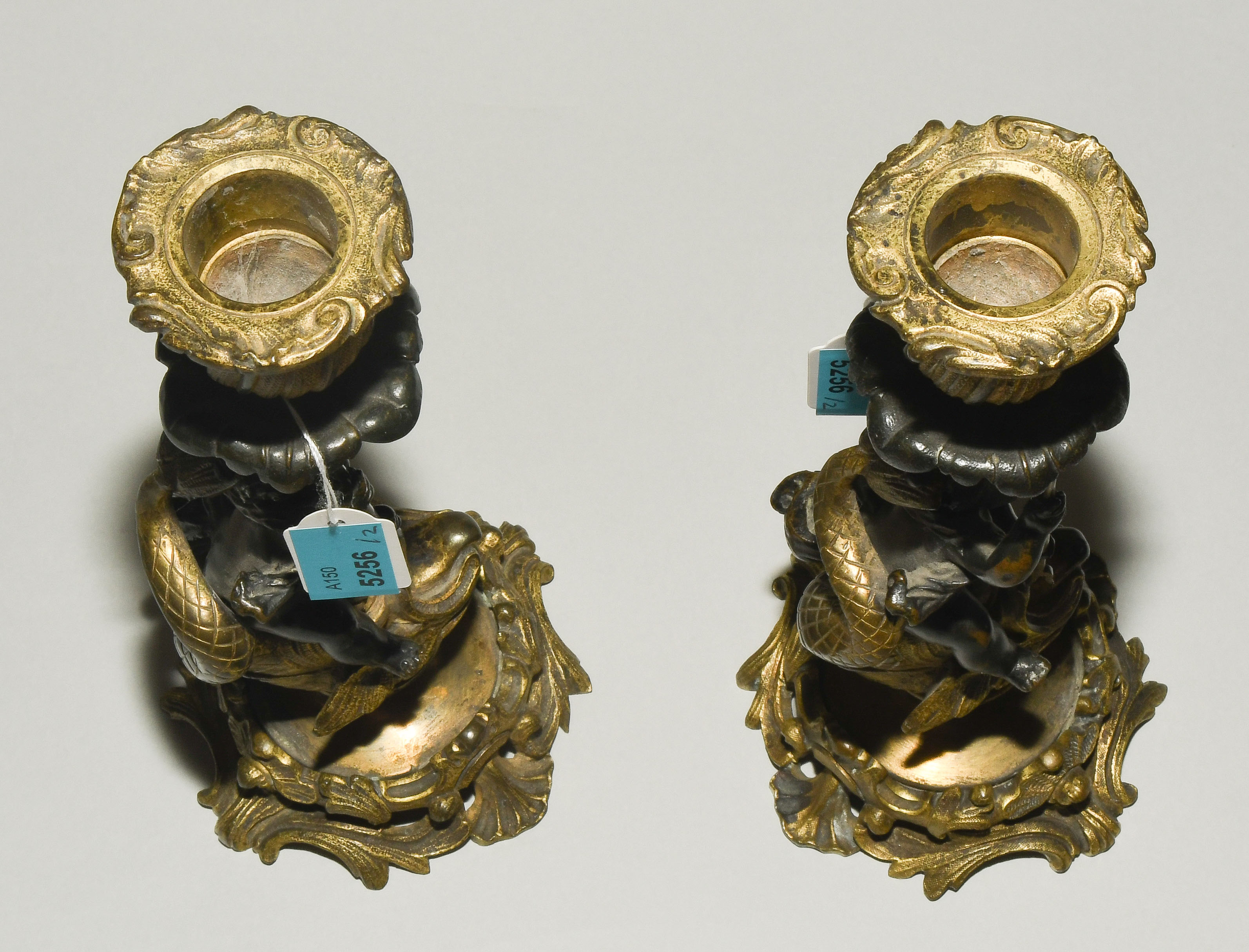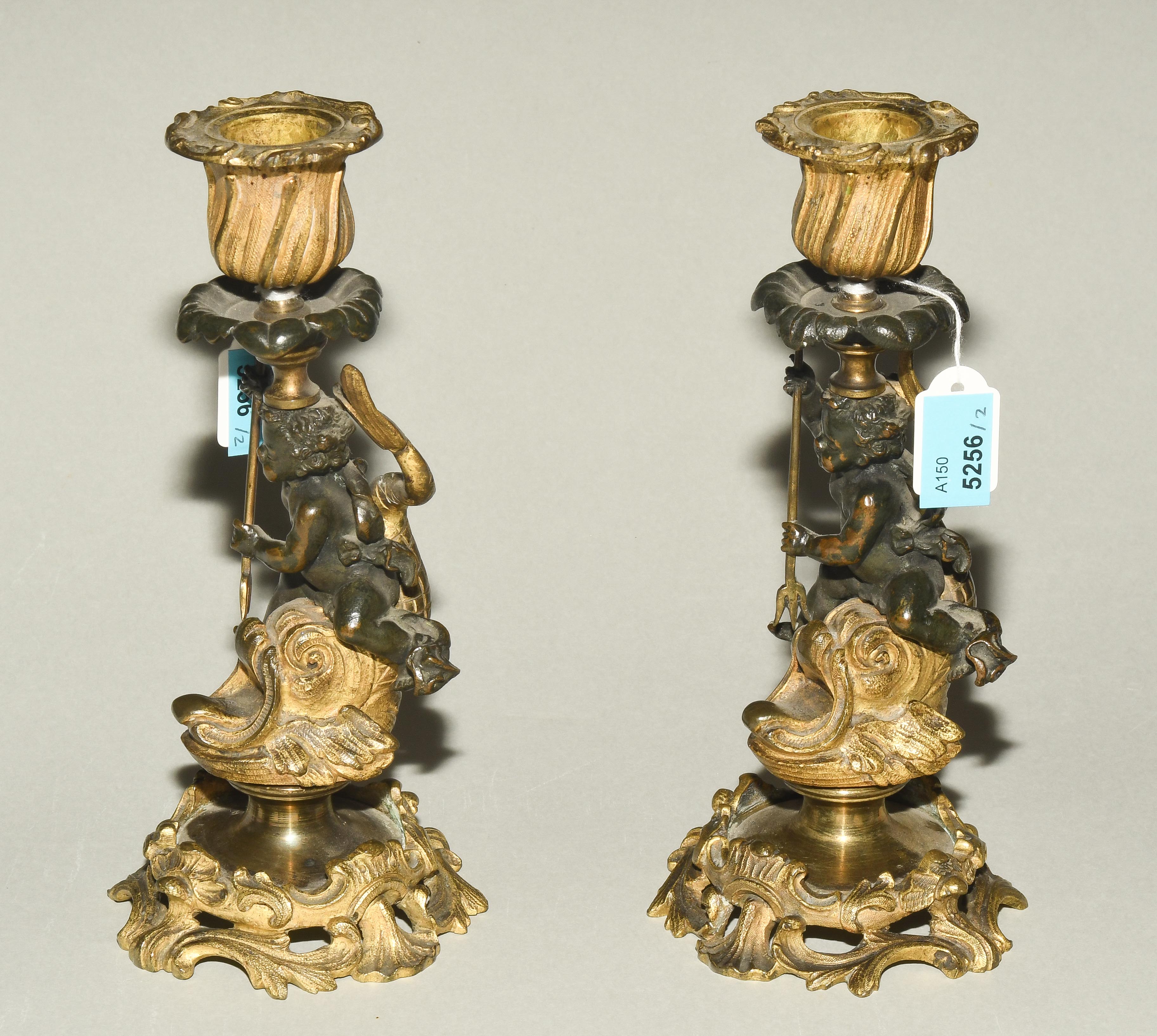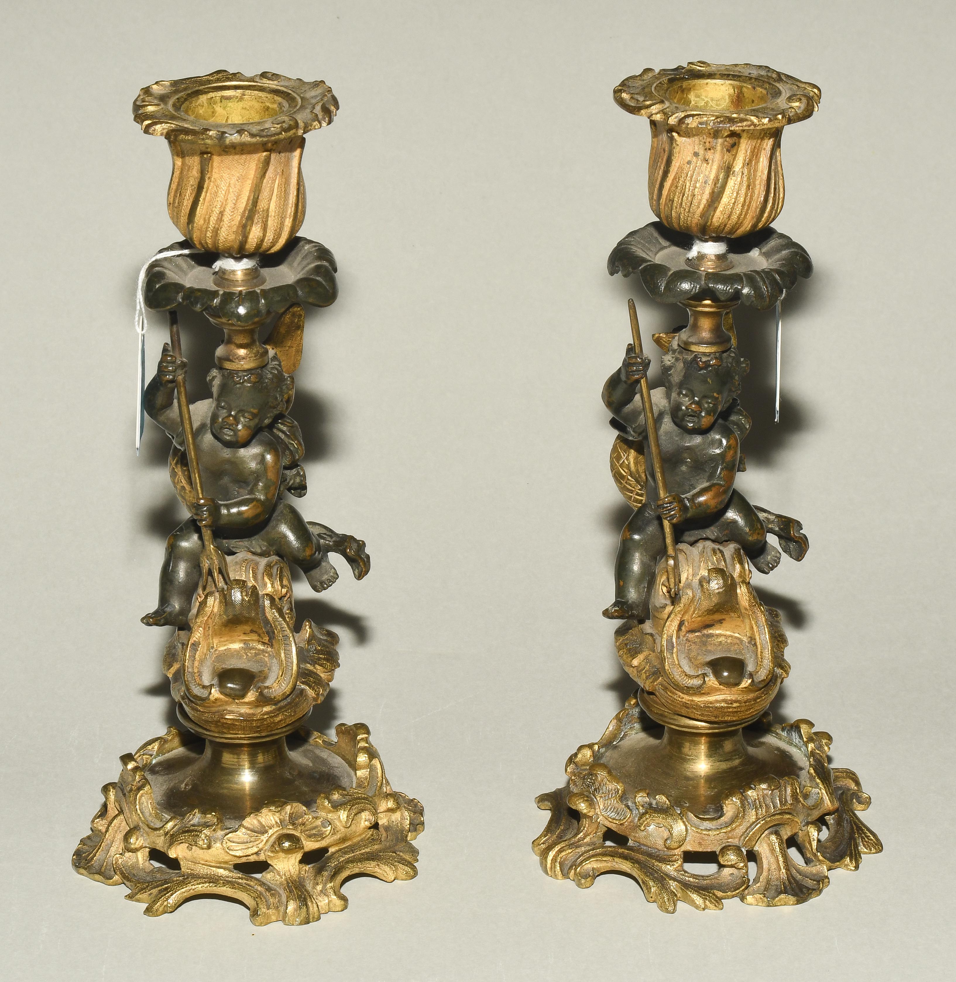 Louis XV-Stil. Bronze, tlw. patiniert. Auf Delfin reitender Putto als Schaft über Rundsockel. Vasentülle mit Tropfrand. H 18 cm.