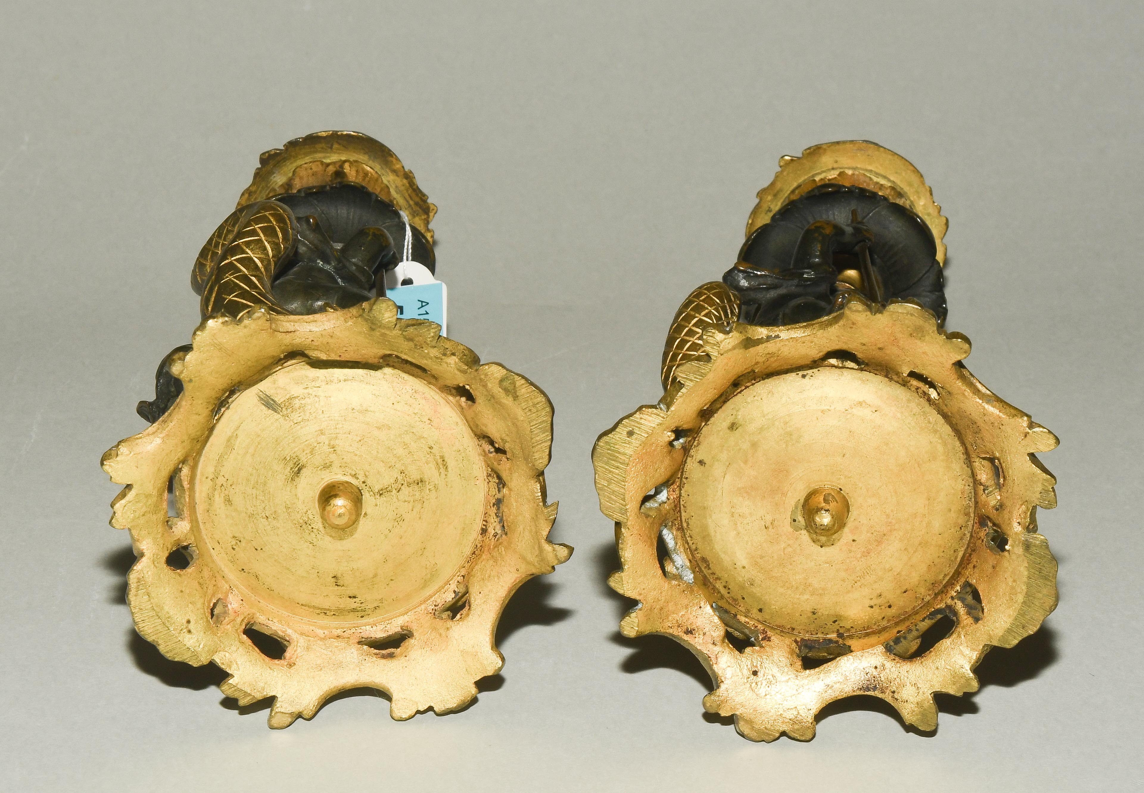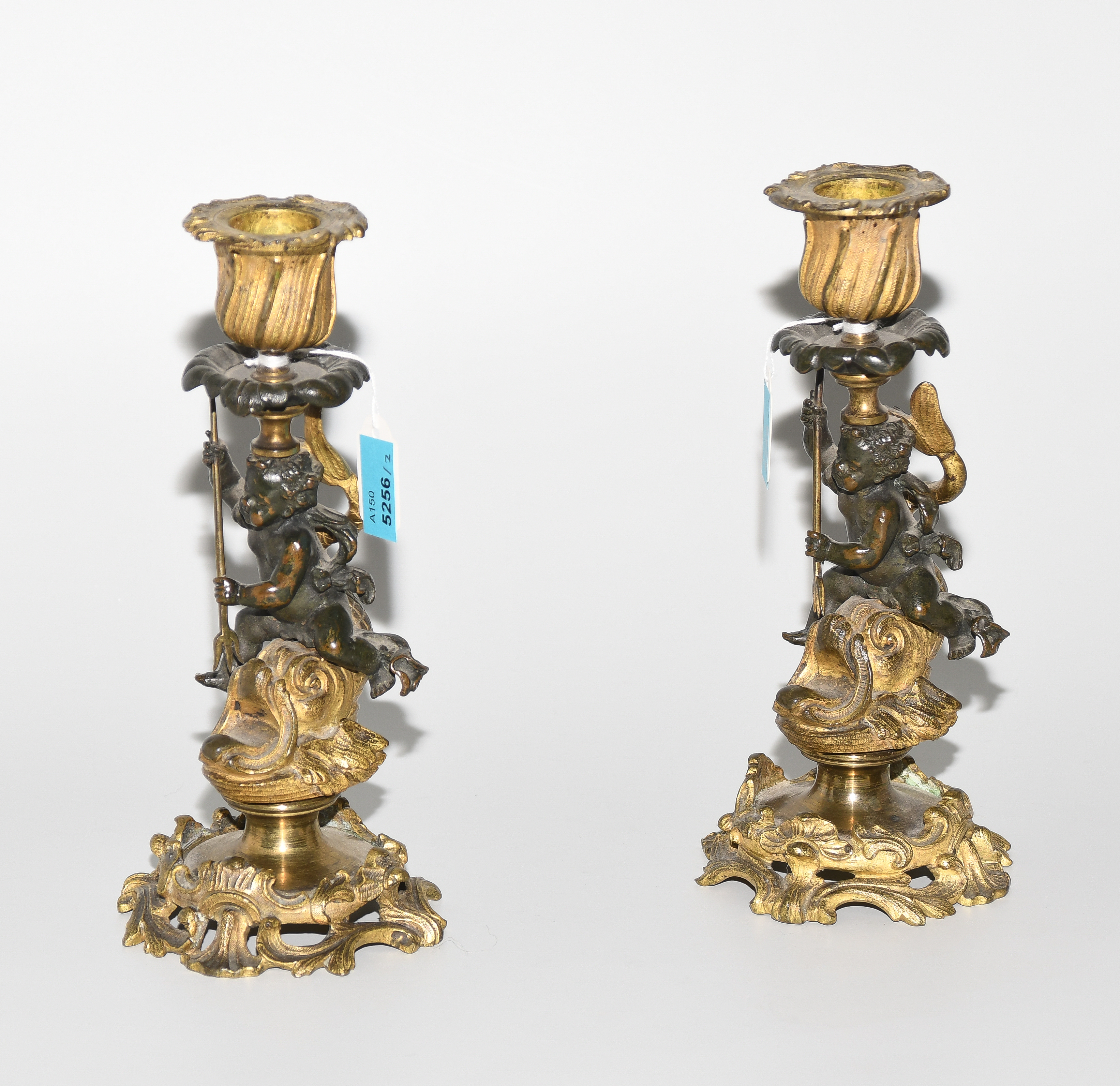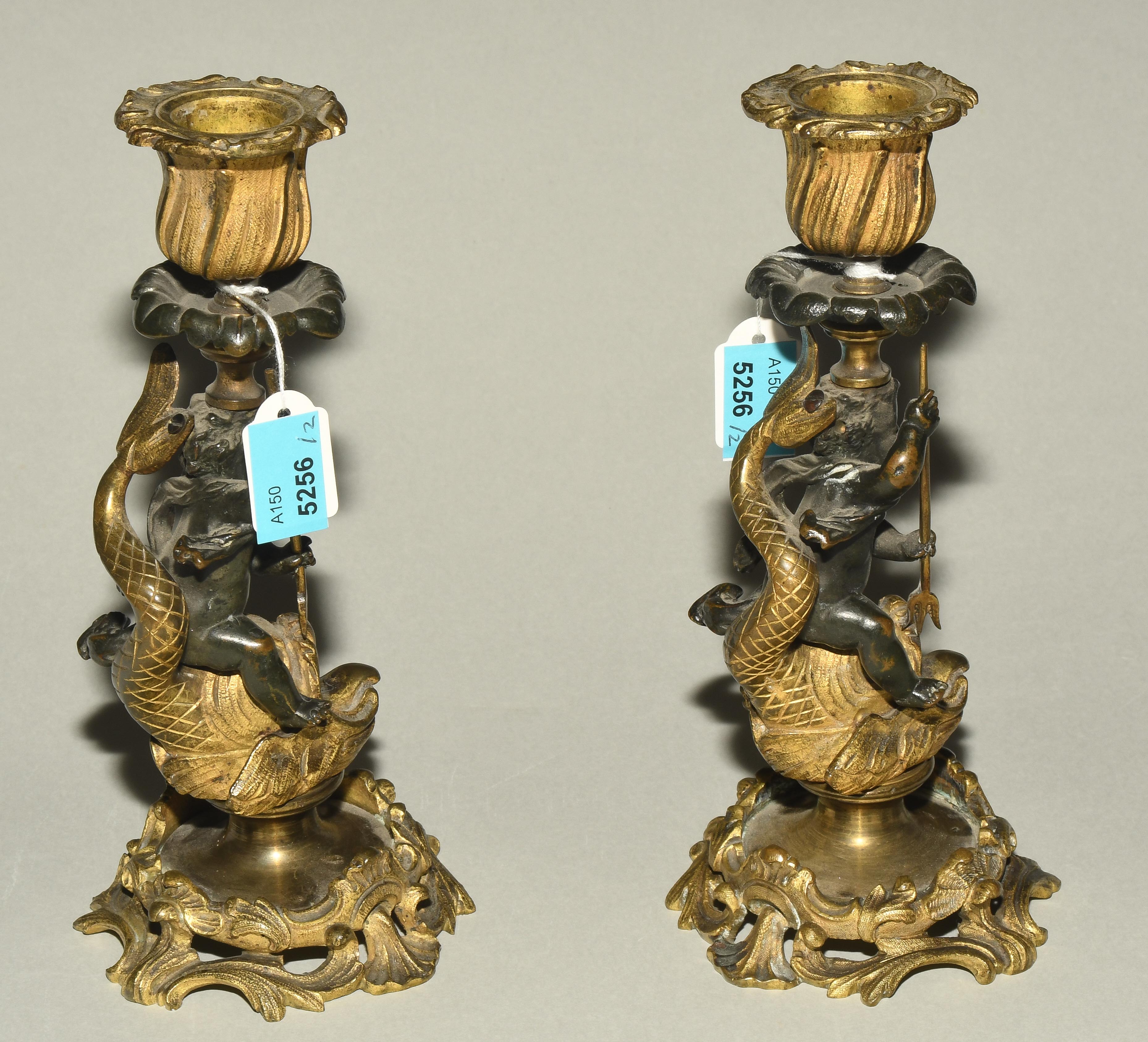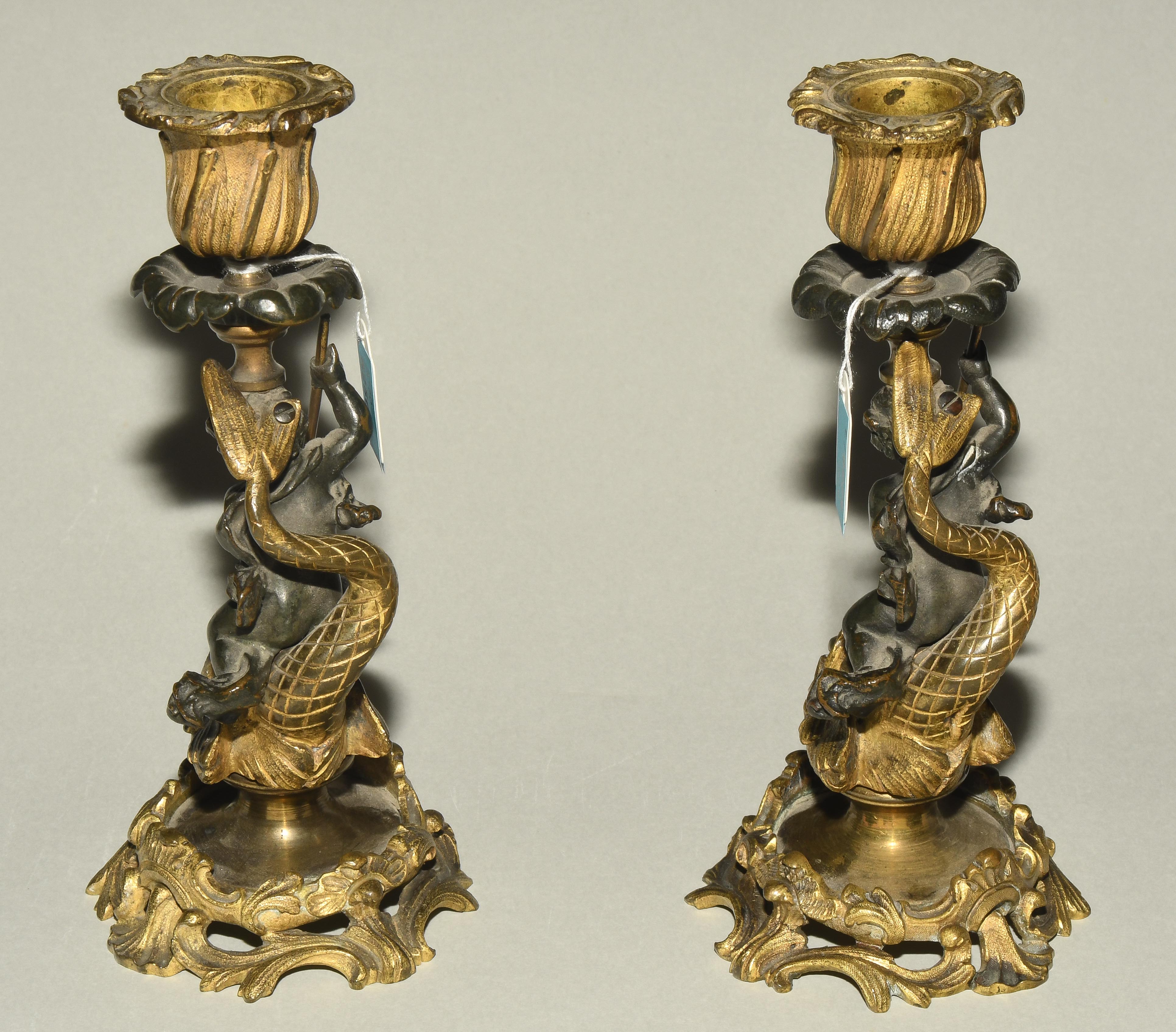 Louis XV-Stil. Bronze, tlw. patiniert. Auf Delfin reitender Putto als Schaft über Rundsockel. Vasentülle mit Tropfrand. H 18 cm.