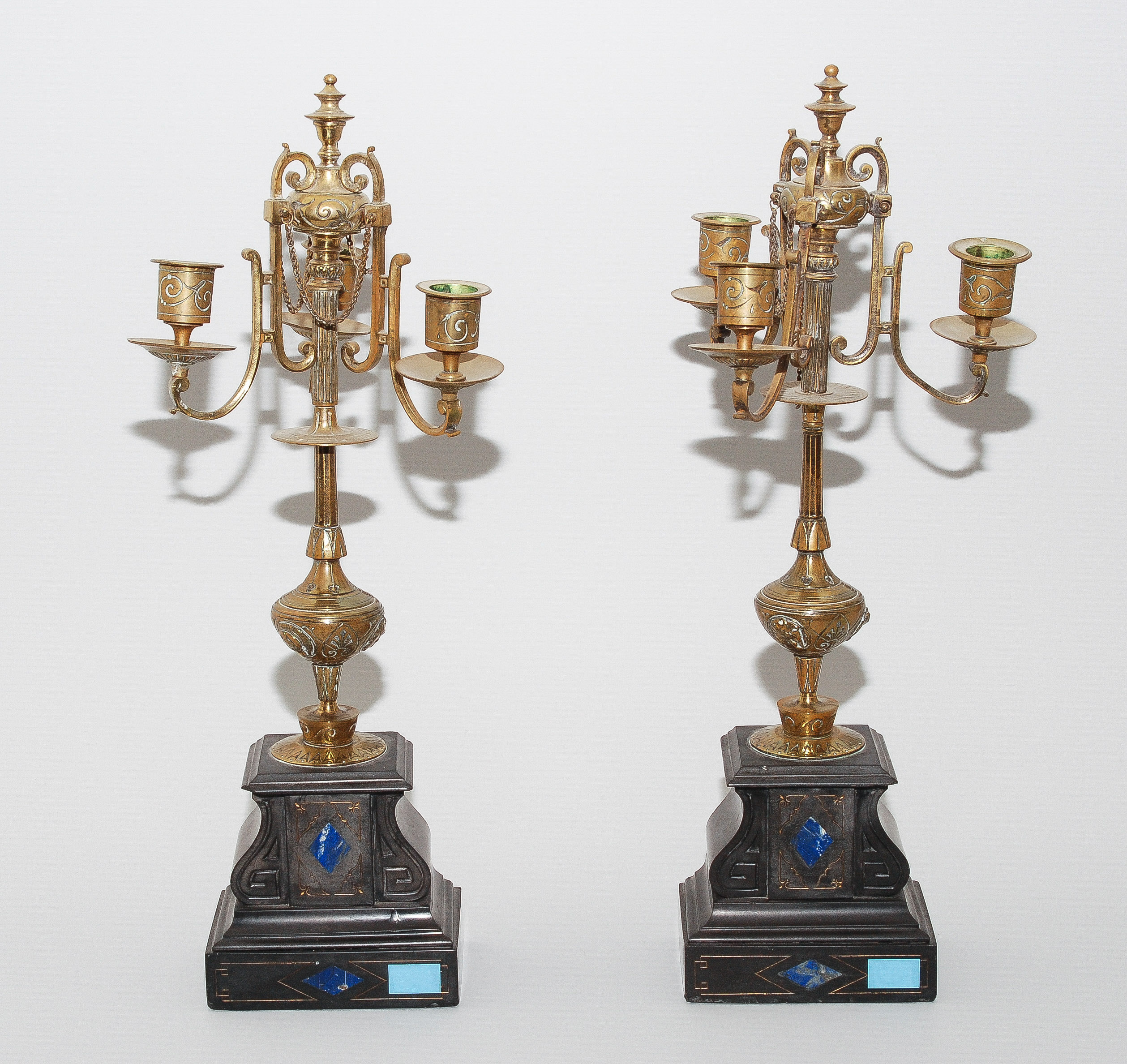 Napoléon III. Messing. 3-flammig. Mehrteiliger Balusterschaft über rechteckigem, getrepptem Steinsockel mit Lapislazuli-Einlagen. Geschwungene Leuchterarme mit zylindrischer Tülle und Tropfschale. Reliefdekor. H 45 cm.