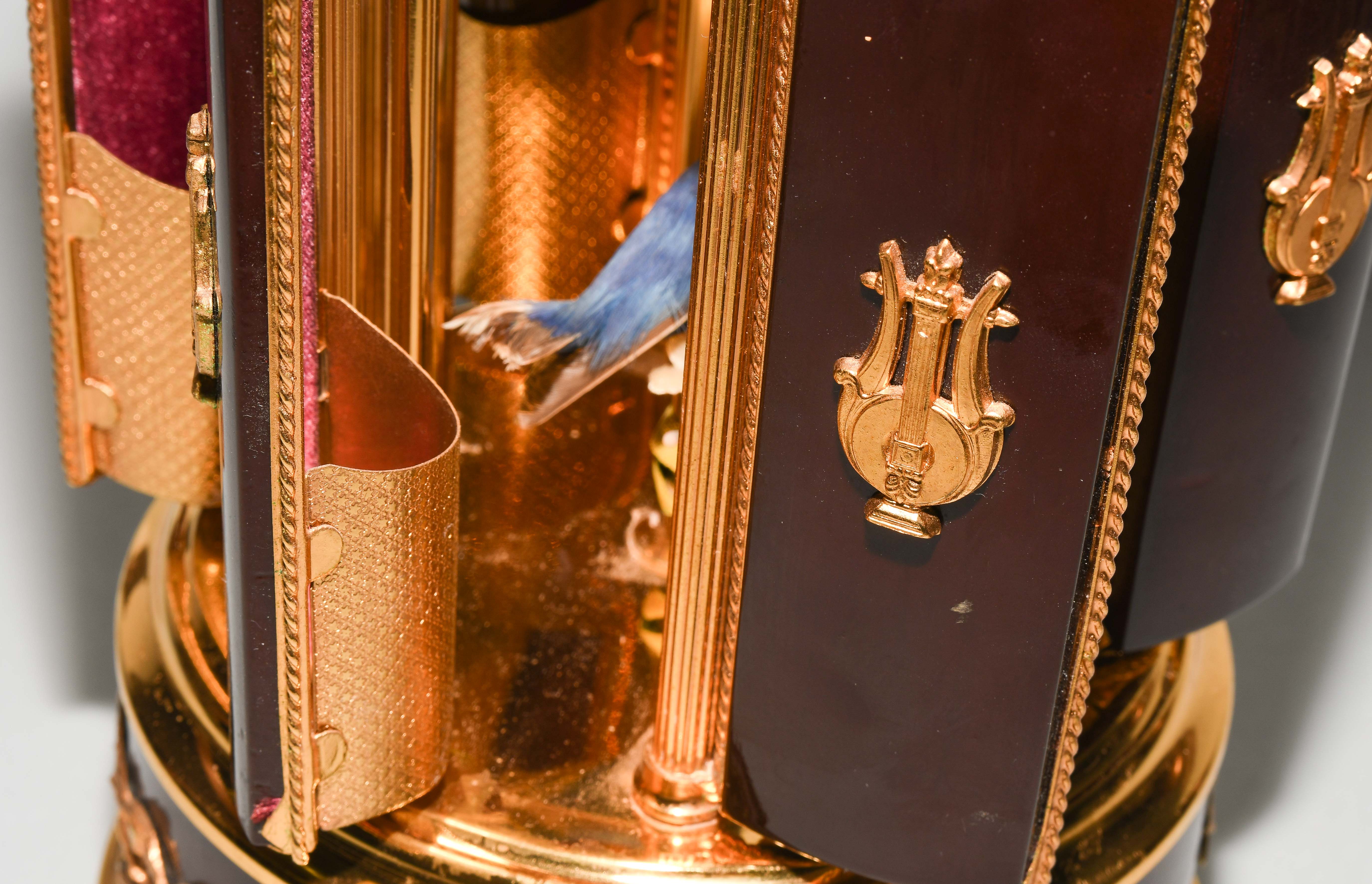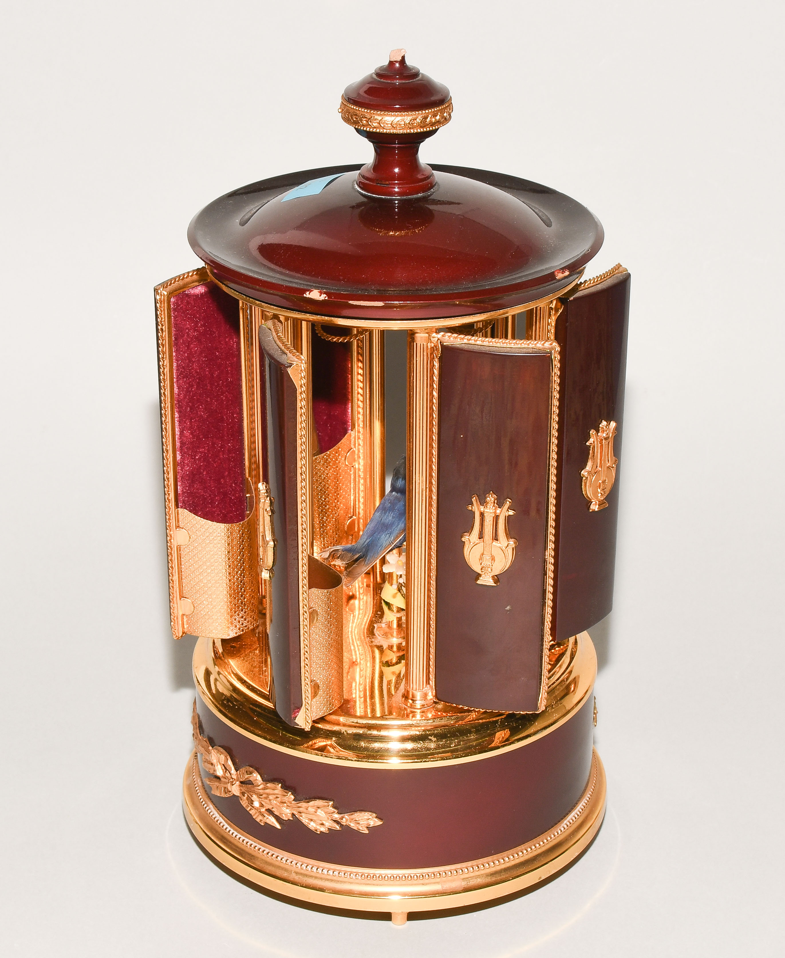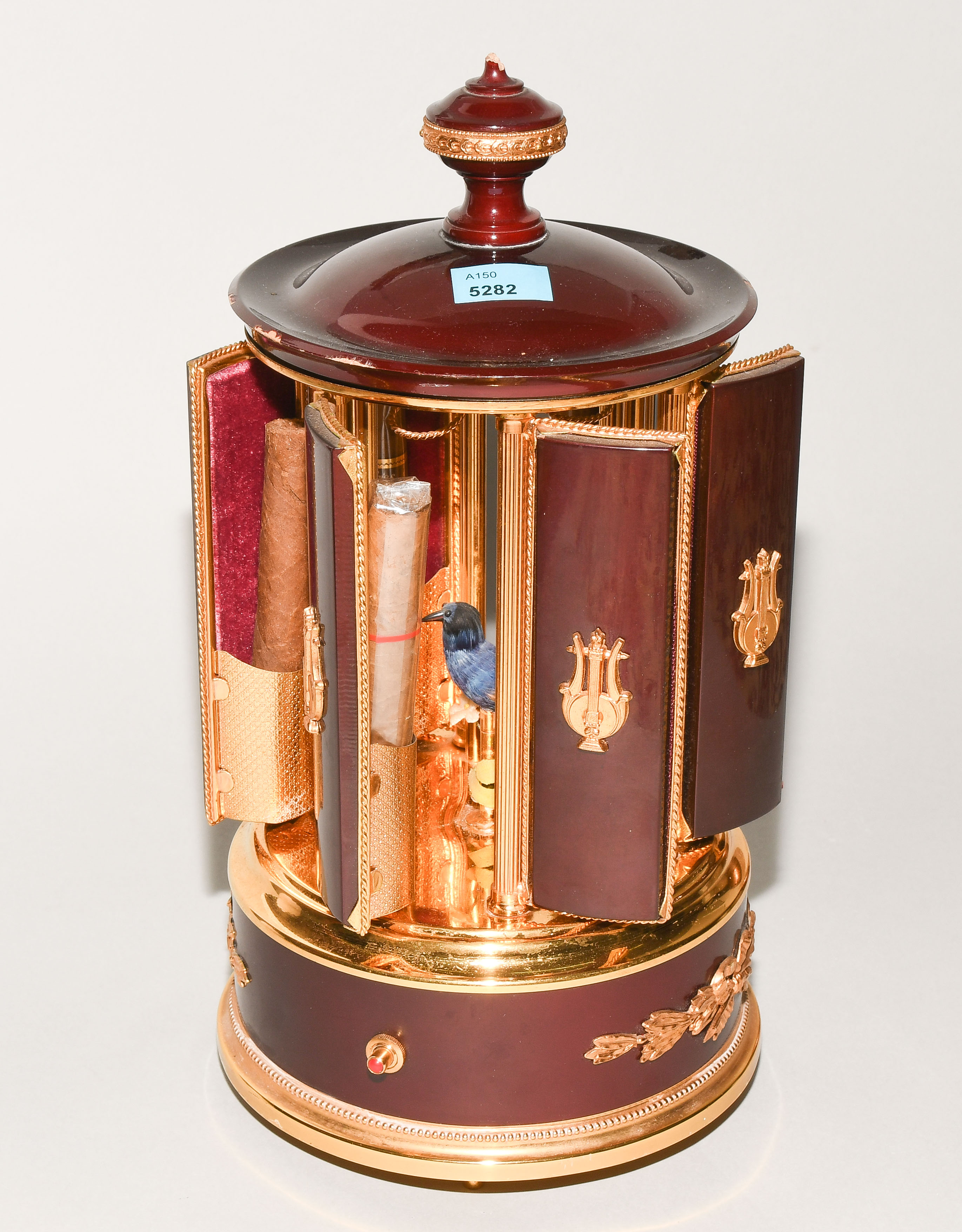 Schweiz, St.Croix, 20.Jh. Metall/Holz, lackiert. 6 Türchen mit Depot für Zigaretten. In der Mitte gefiederter Singvogel. Im Sockel Mechanik und Reuge-Werk. H 31 cm.