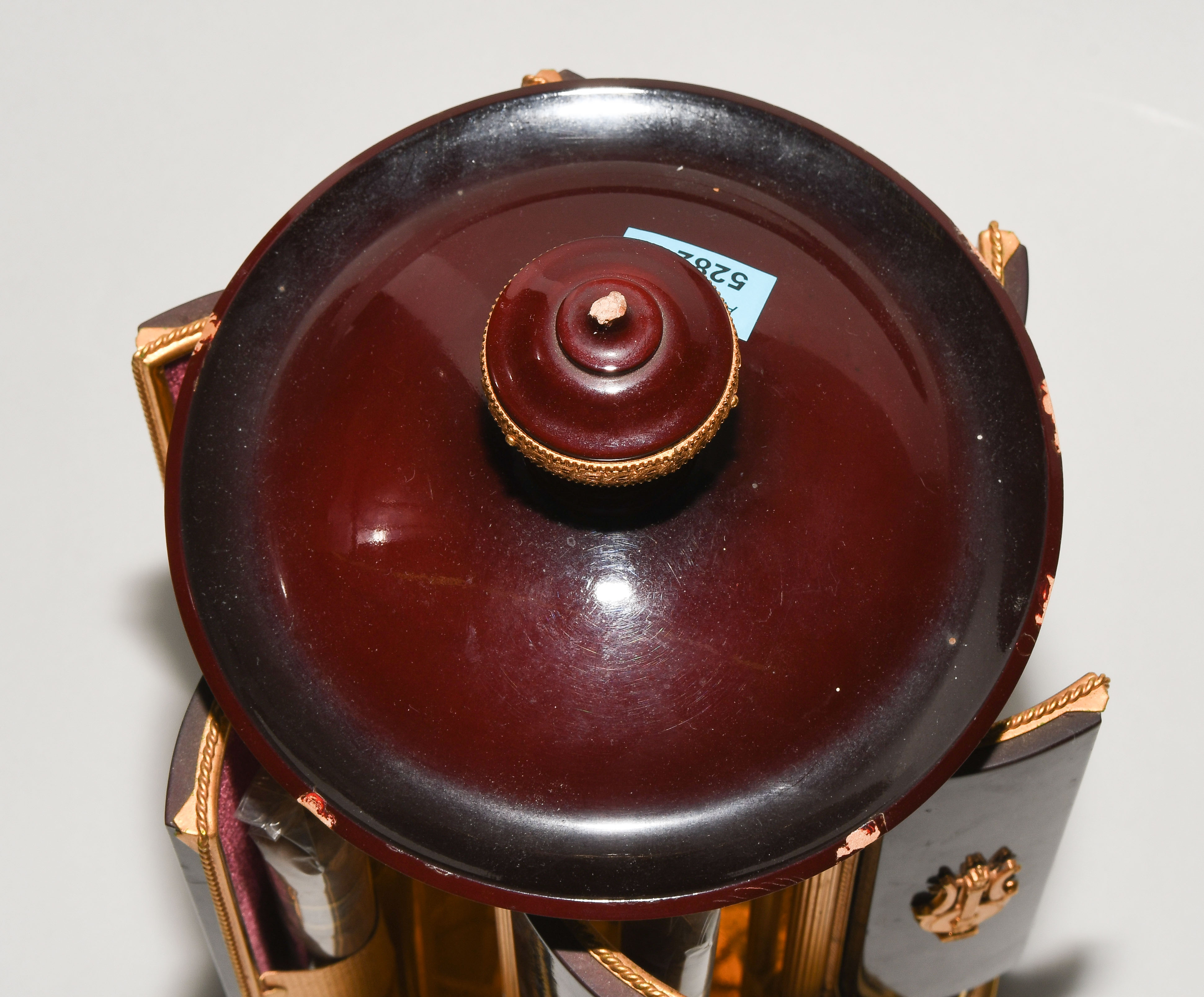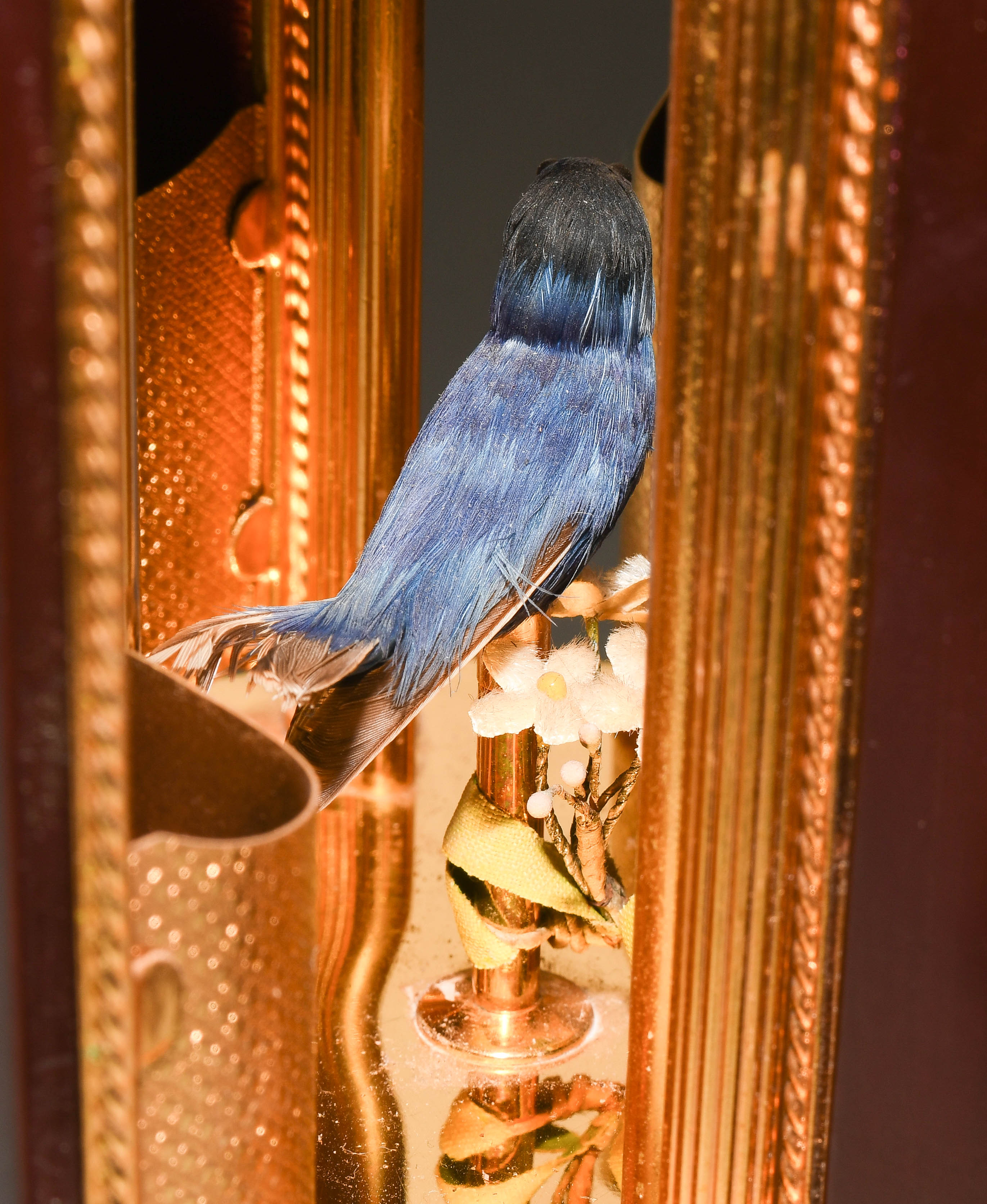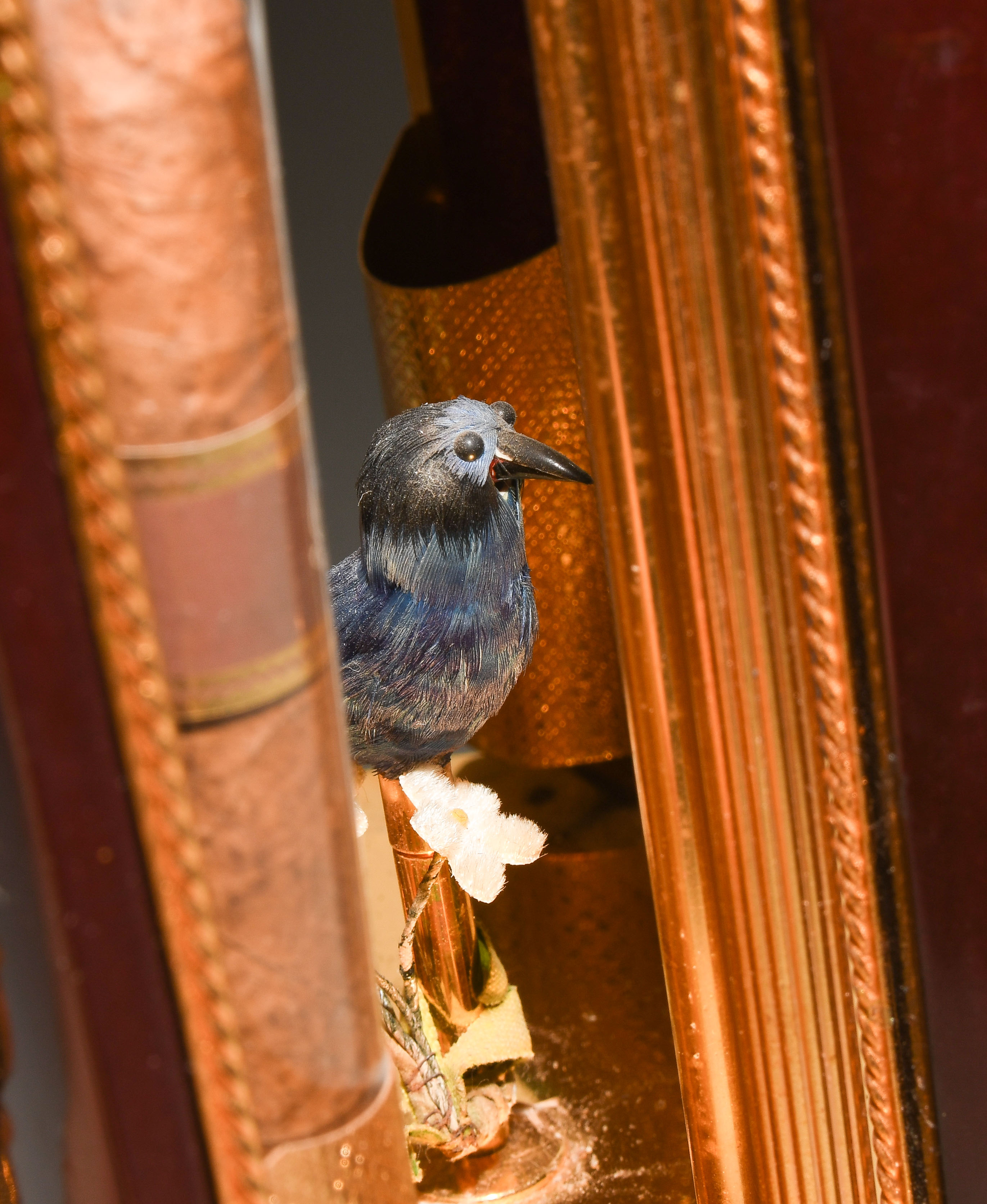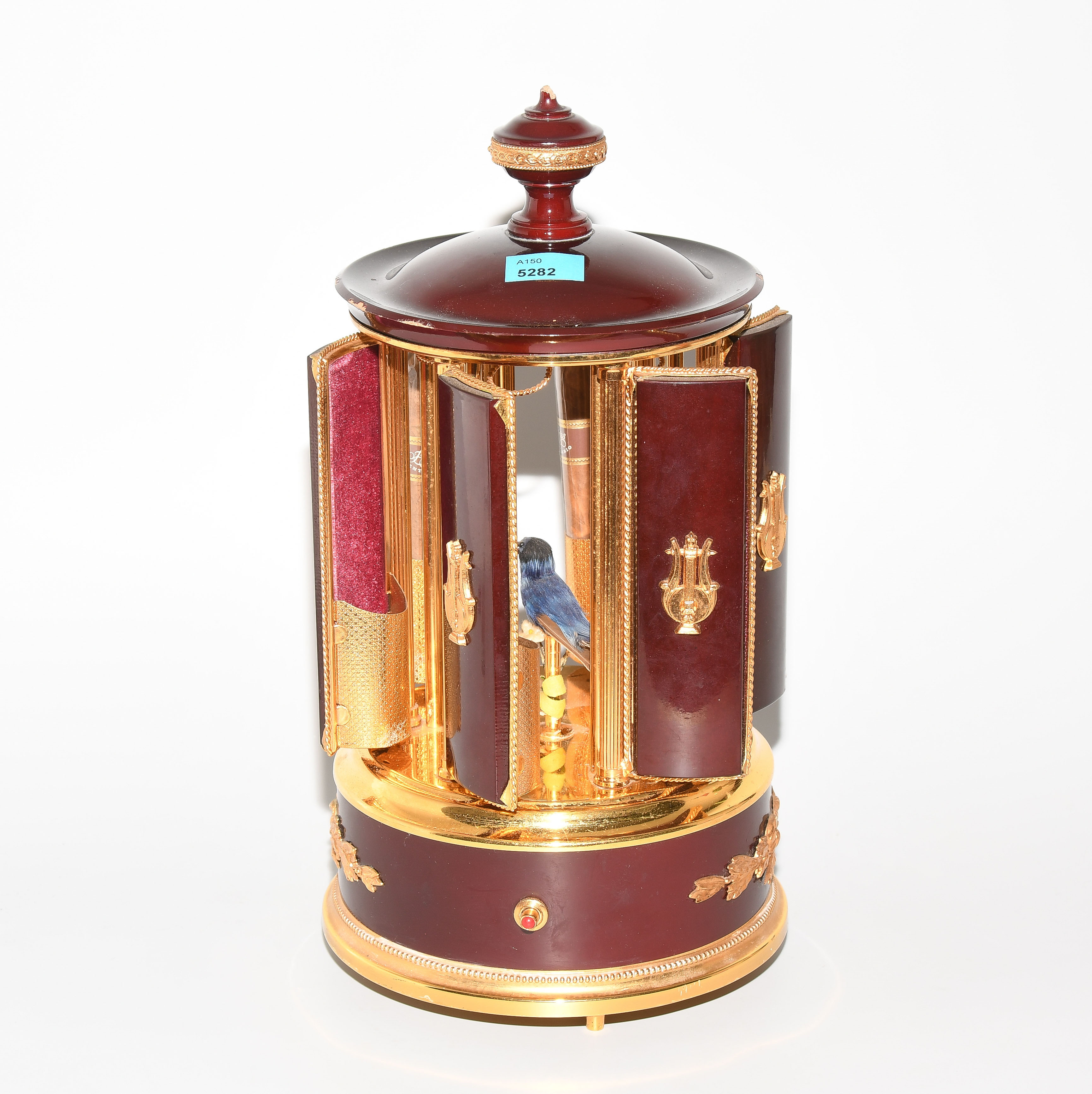 Schweiz, St.Croix, 20.Jh. Metall/Holz, lackiert. 6 Türchen mit Depot für Zigaretten. In der Mitte gefiederter Singvogel. Im Sockel Mechanik und Reuge-Werk. H 31 cm.
