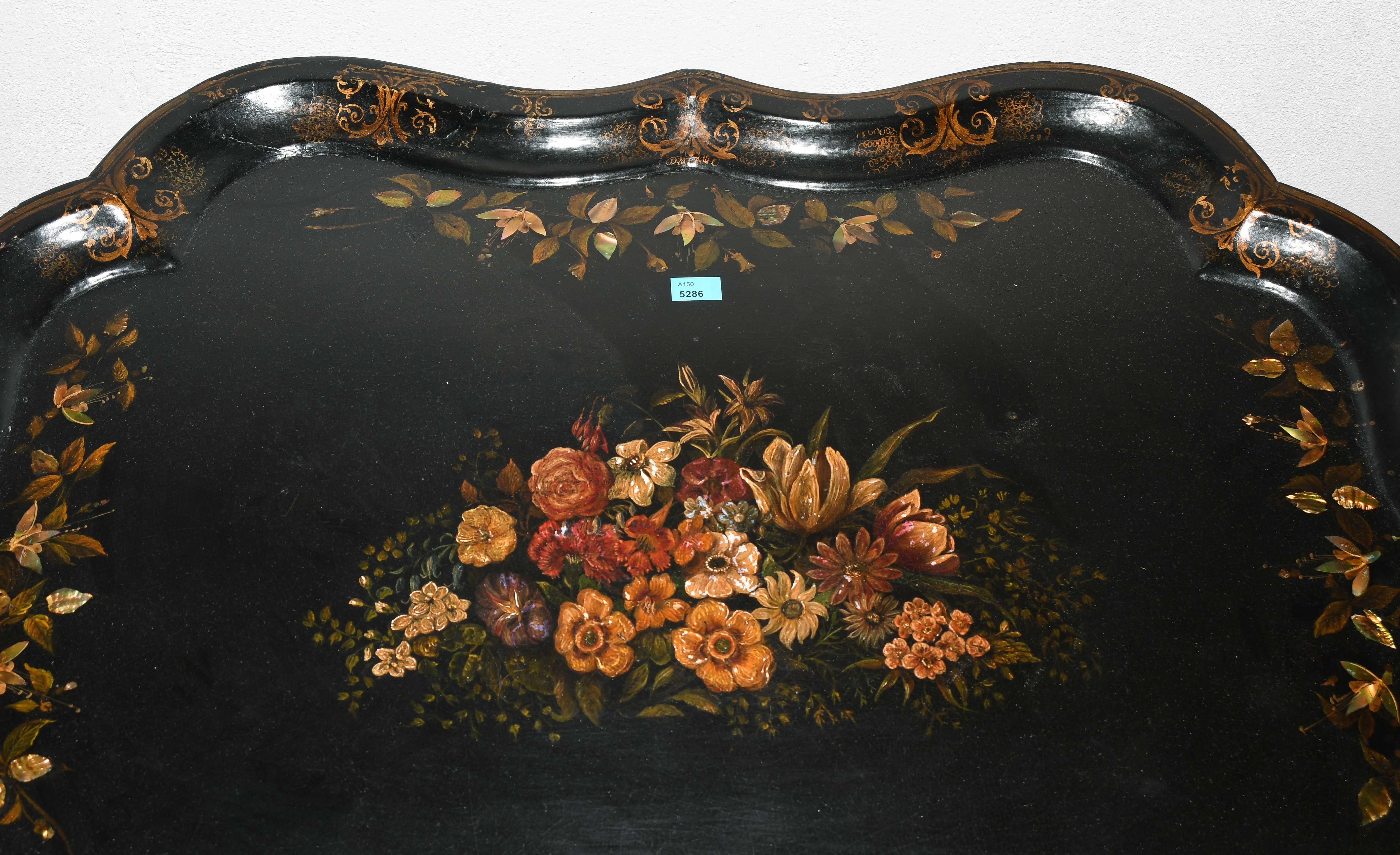 Um 1900. Metall. Geschwungene Rechteckform. Schwarzer Fond mit polychromer Blumenmalerei und Perlmutteinlagen. L 80 cm. Auf gedrechseltem und dunkel gebeiztem Holzgestell. H 52 cm.