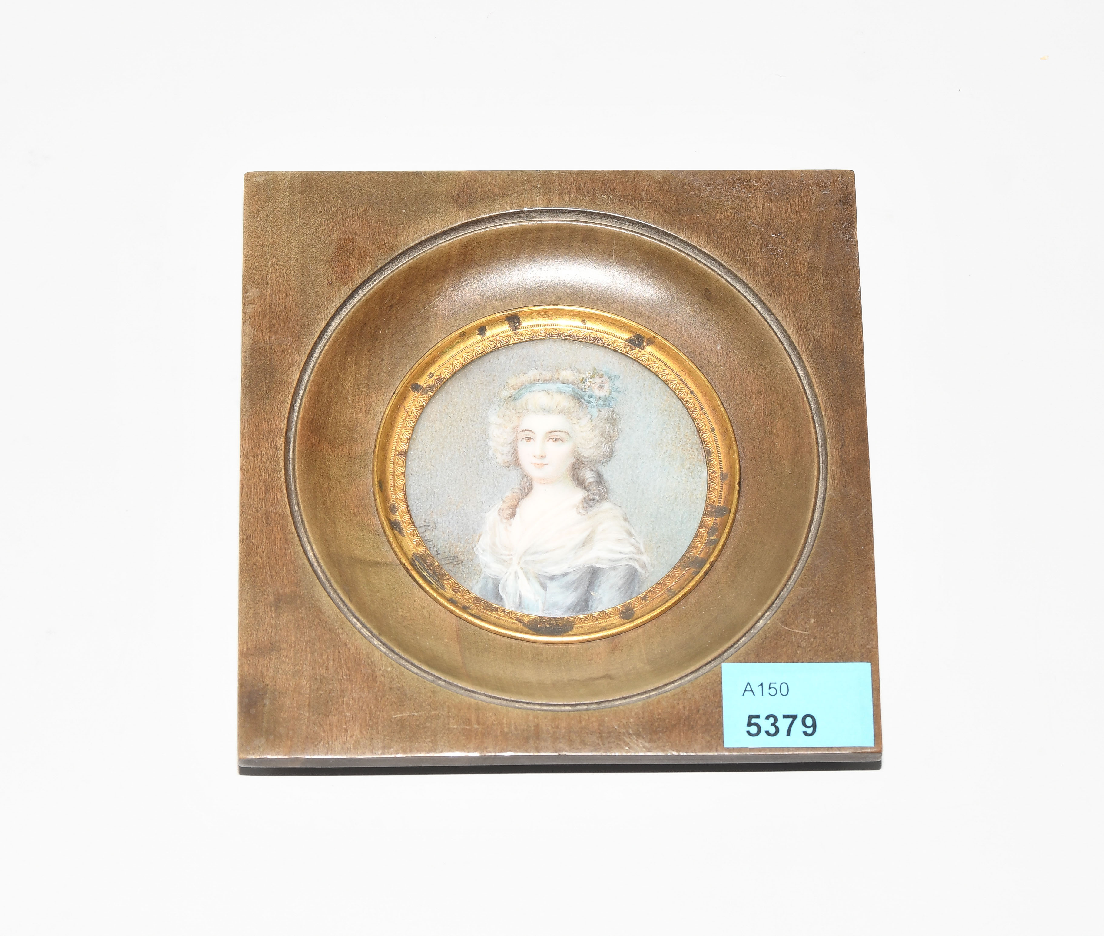 19.Jh. Gouachemalerei auf Elfenbein, rund. Bezeichnet: "Revillo". Junge Dame in blauem Kleid und üppiger Puderfrisur. Gerahmt. 11x11 cm.