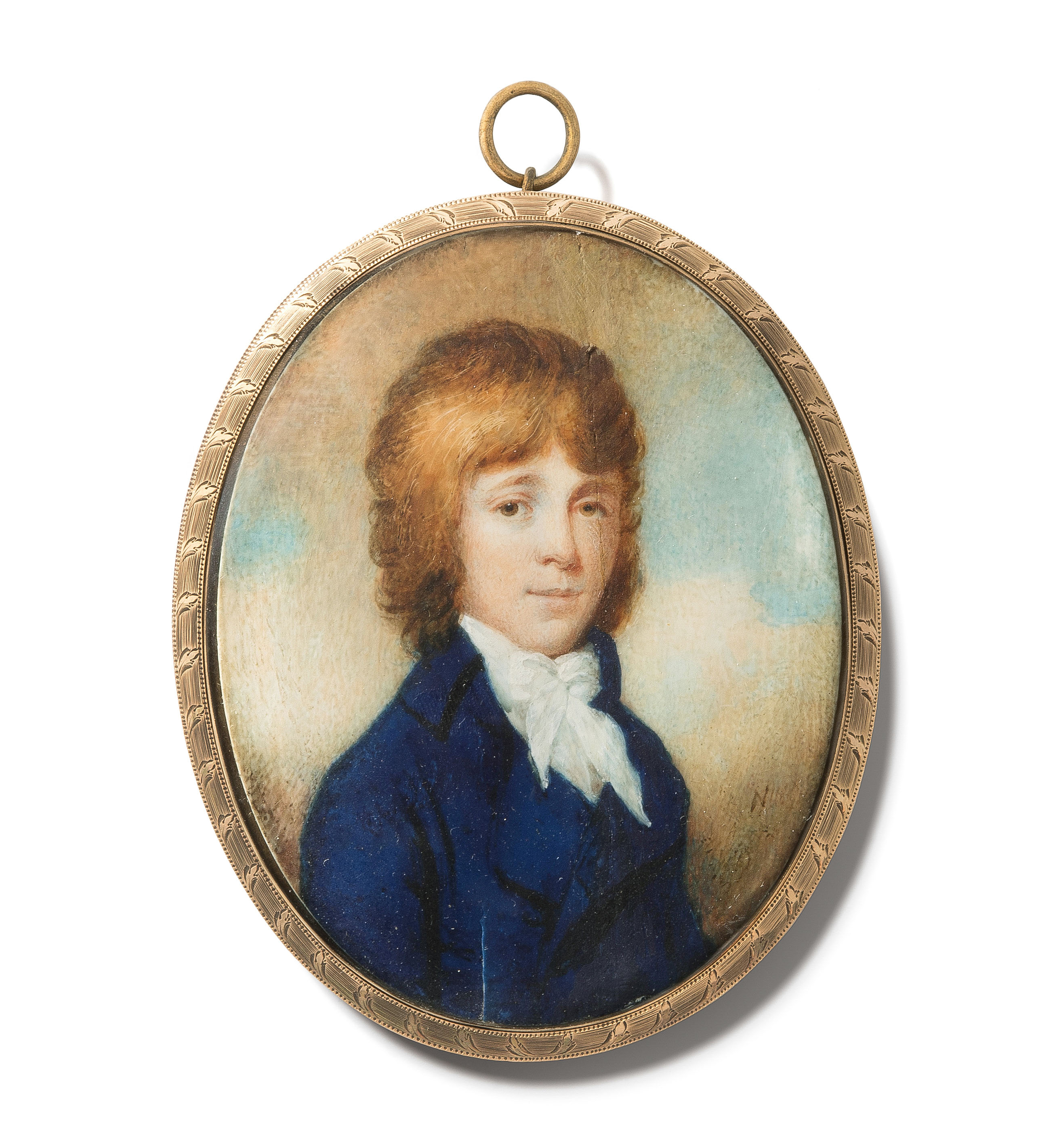 Um 1800. Gouache/Aquarell auf Elfenbein, oval. Junge mit rotem Haar, gekleidet in blauem Rock und weisser Halsbinde vor Himmelshintergrund. Rückseite verglast. Rechts bez.: N. 6,7x8,6 cm. Gefasst.