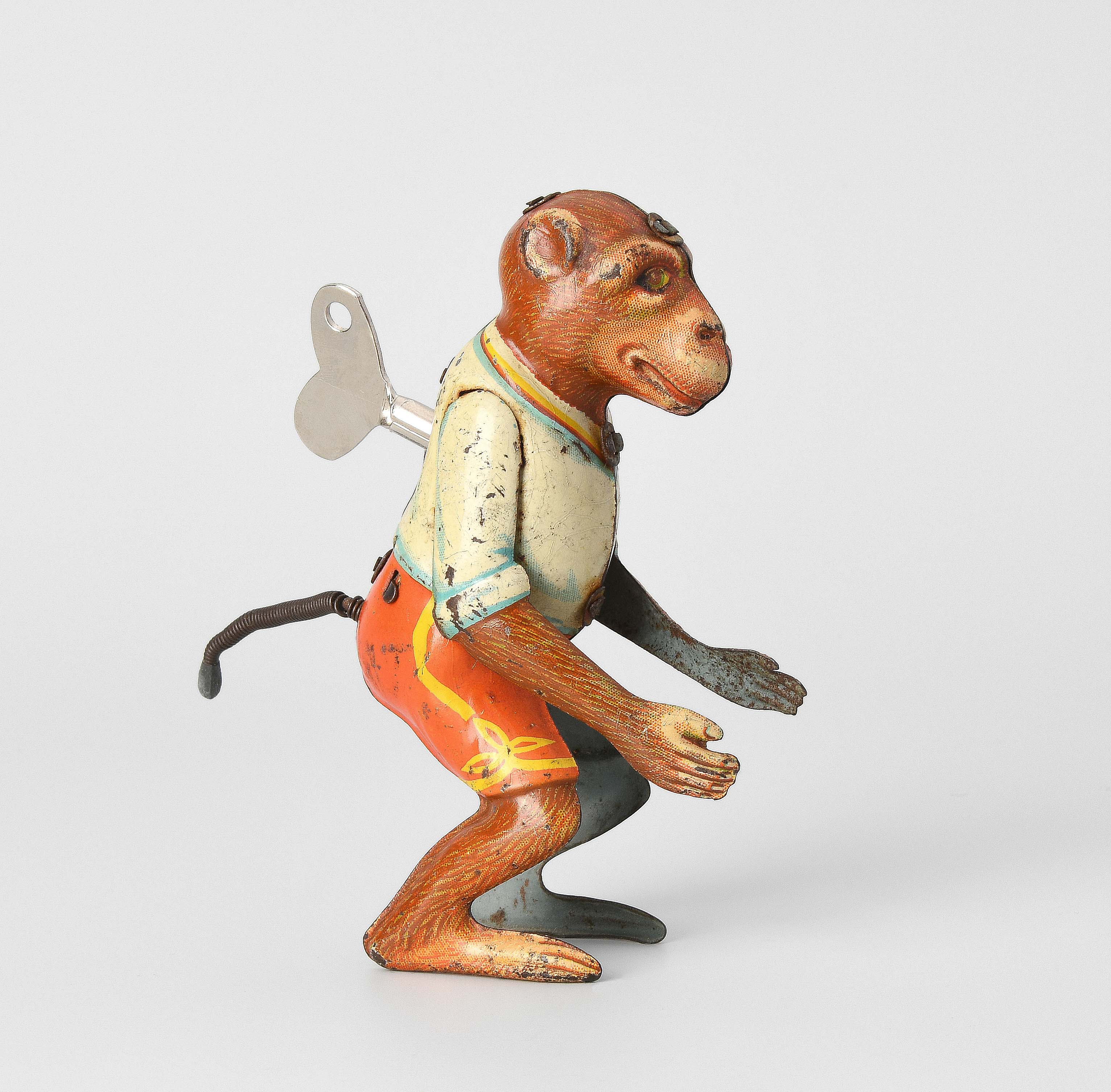 Deutscher Hersteller, um 1930. Metallblech, farbig lithographiert. Zirkusaffe mit roter Hose und weissem Hemd. Uhrwerkantrieb. Schlüssel assortiert. H 11,5 cm.
