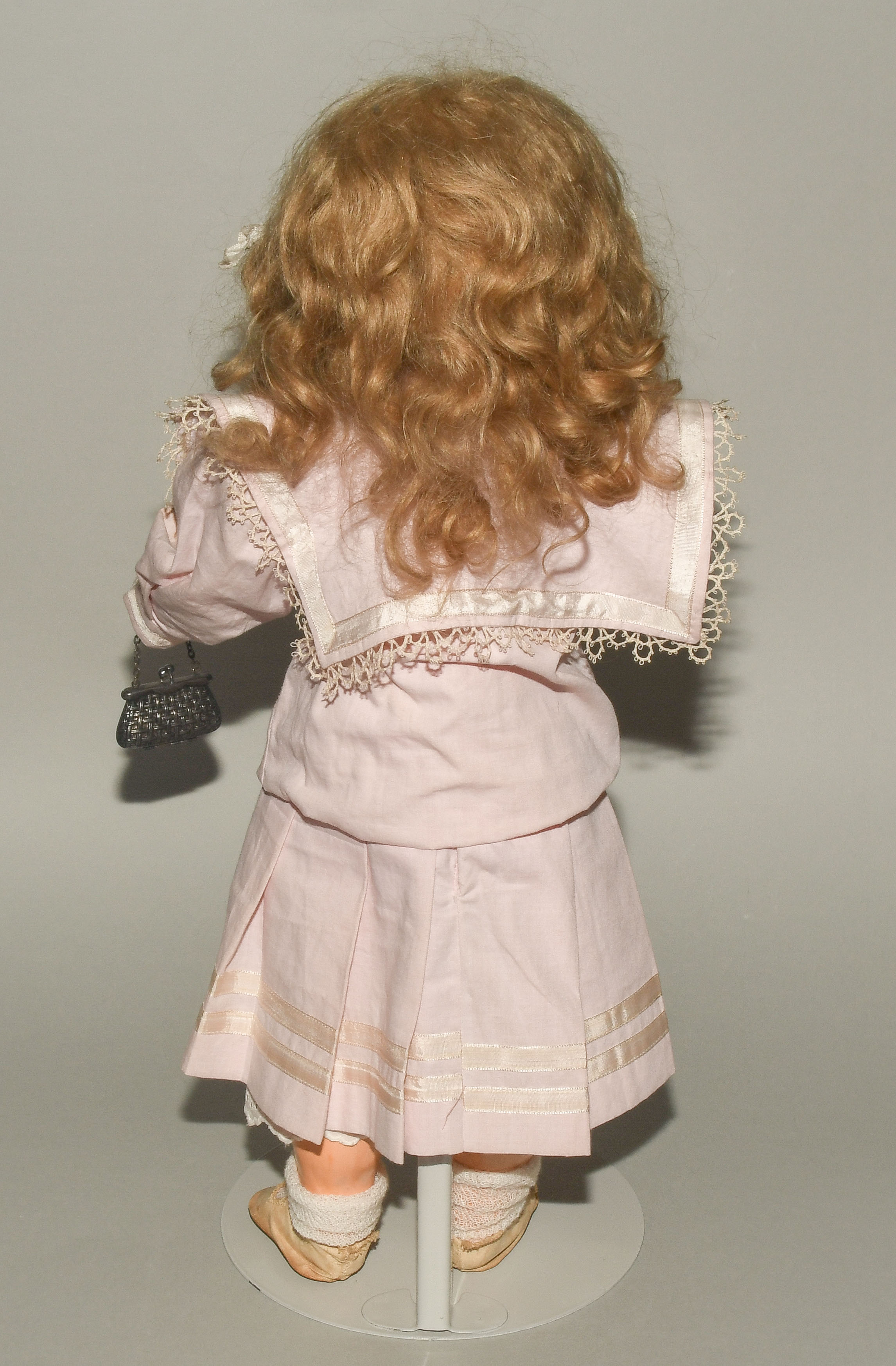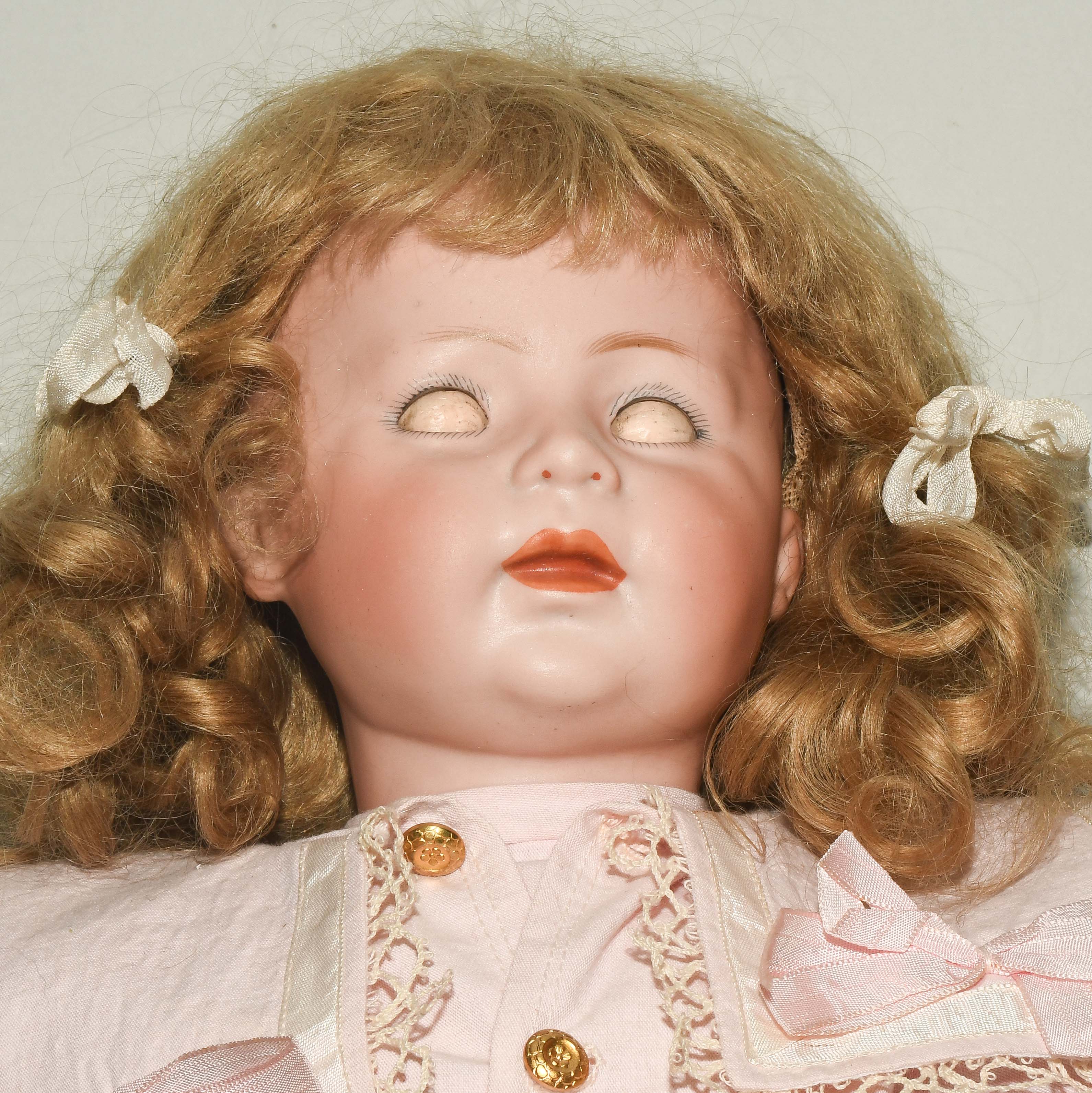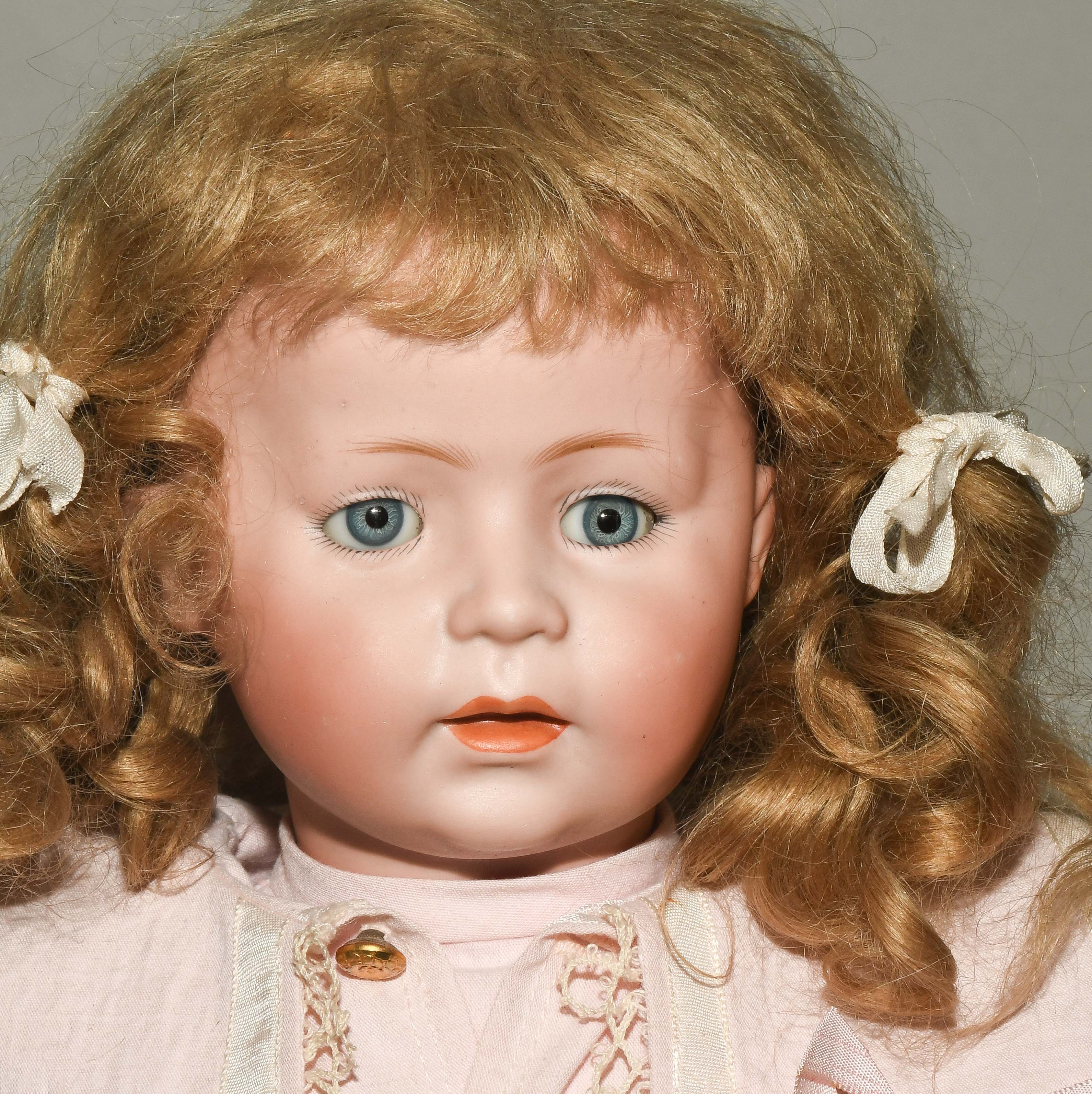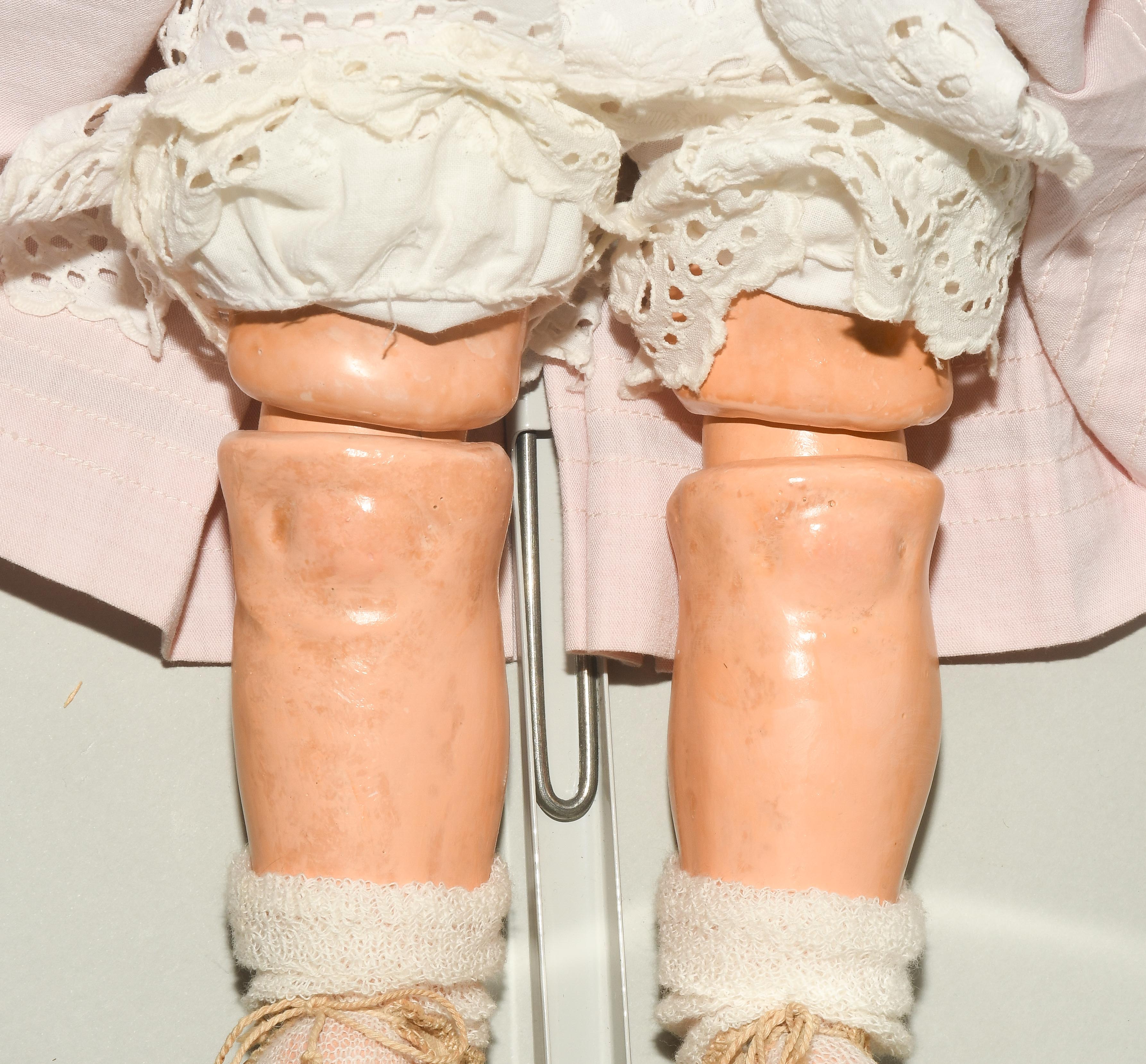 Deutschland, um 1920. Kurbelkopf mit Schlafaugen und offen-geschlossenem Mund aus Biscuit-Porzellan. Halsmarke: "1488, Simon & Halbig, 8 1/2". Gelenkkörper aus Masse. Dunkelblonde Mohairperücke. Bekleidung im alten Stil. H 46 cm.