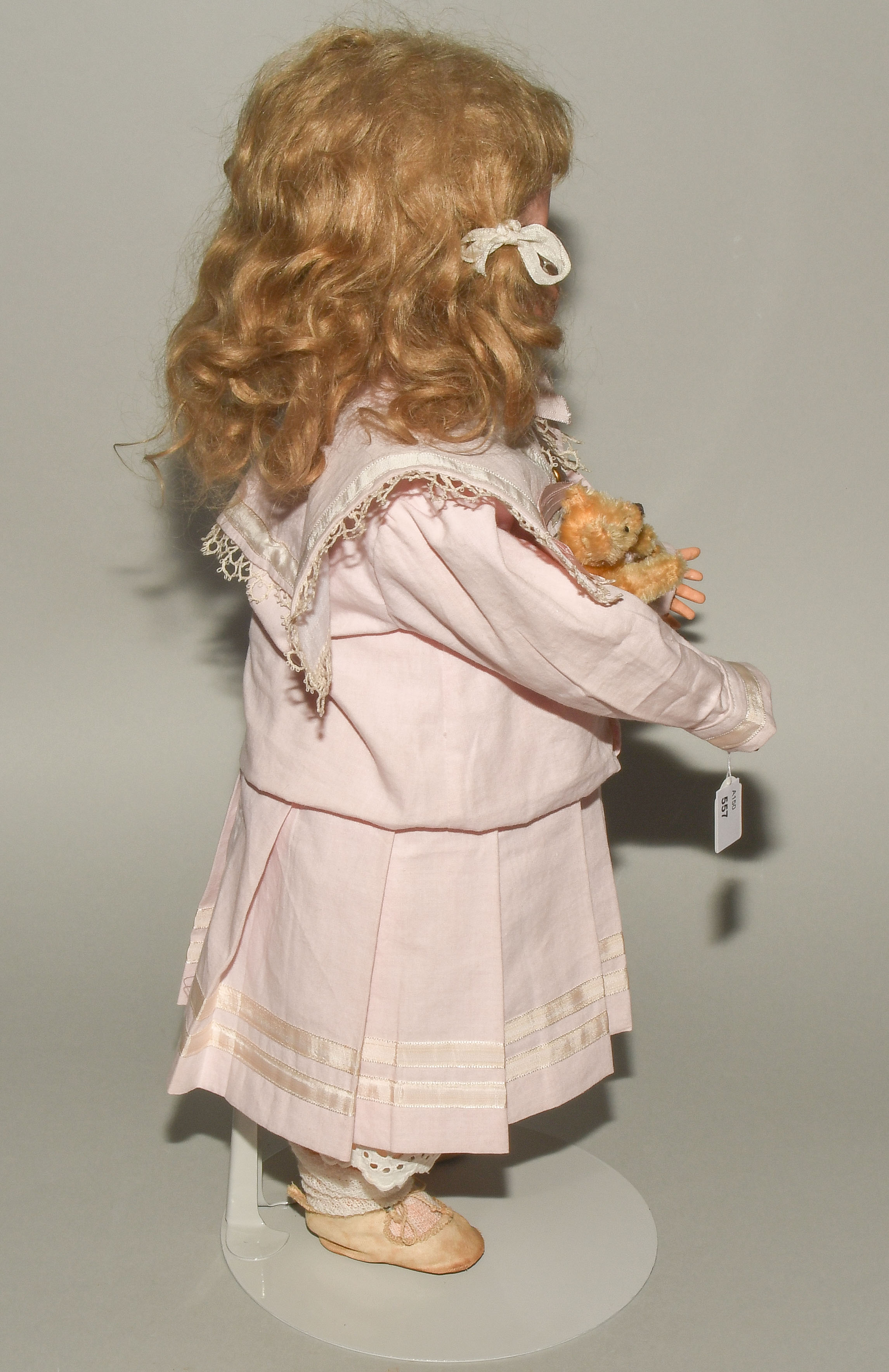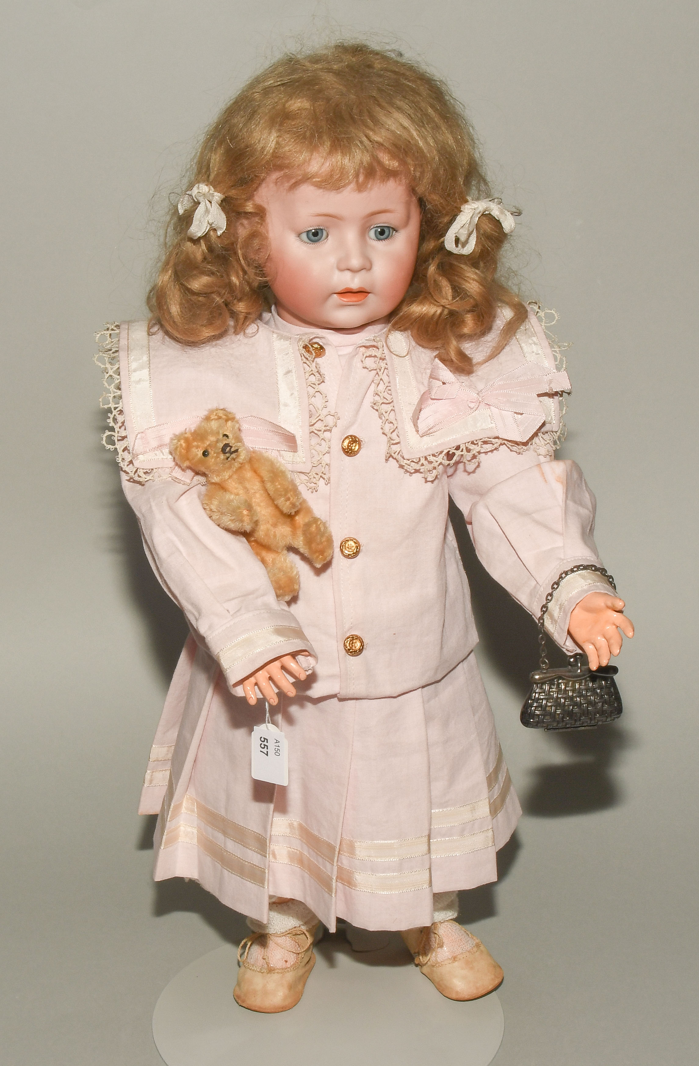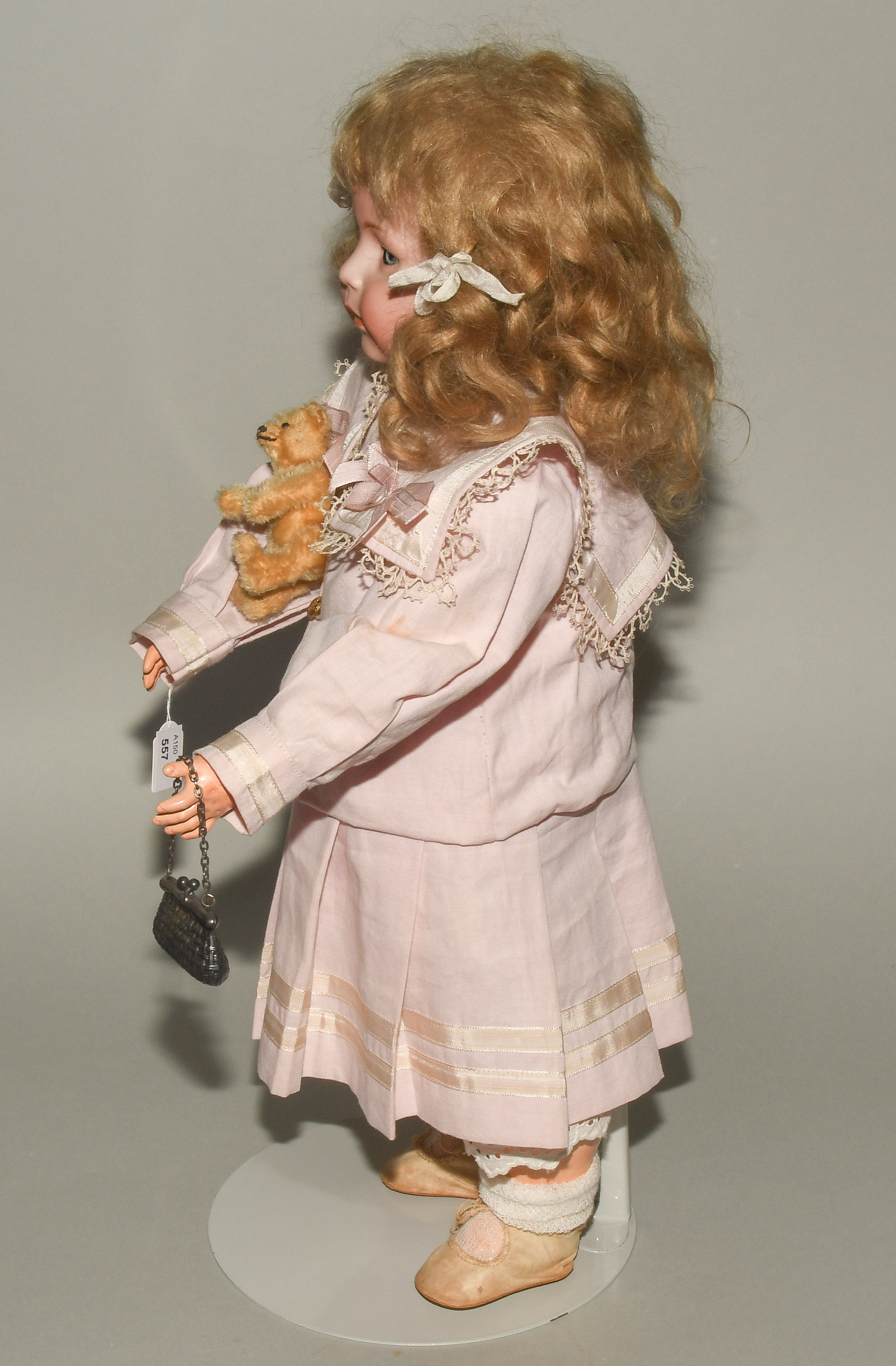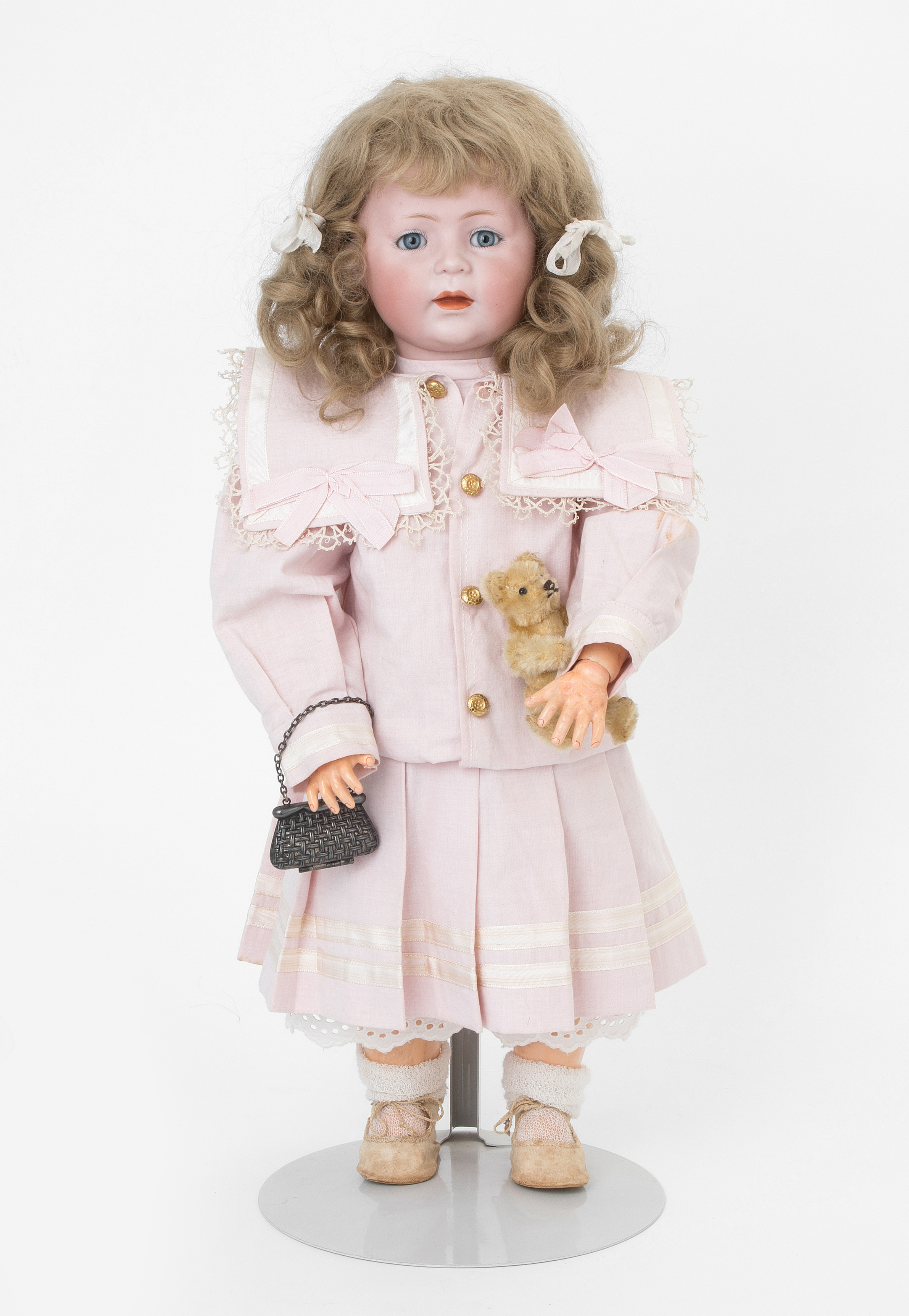 Deutschland, um 1920. Kurbelkopf mit Schlafaugen und offen-geschlossenem Mund aus Biscuit-Porzellan. Halsmarke: "1488, Simon & Halbig, 8 1/2". Gelenkkörper aus Masse. Dunkelblonde Mohairperücke. Bekleidung im alten Stil. H 46 cm.