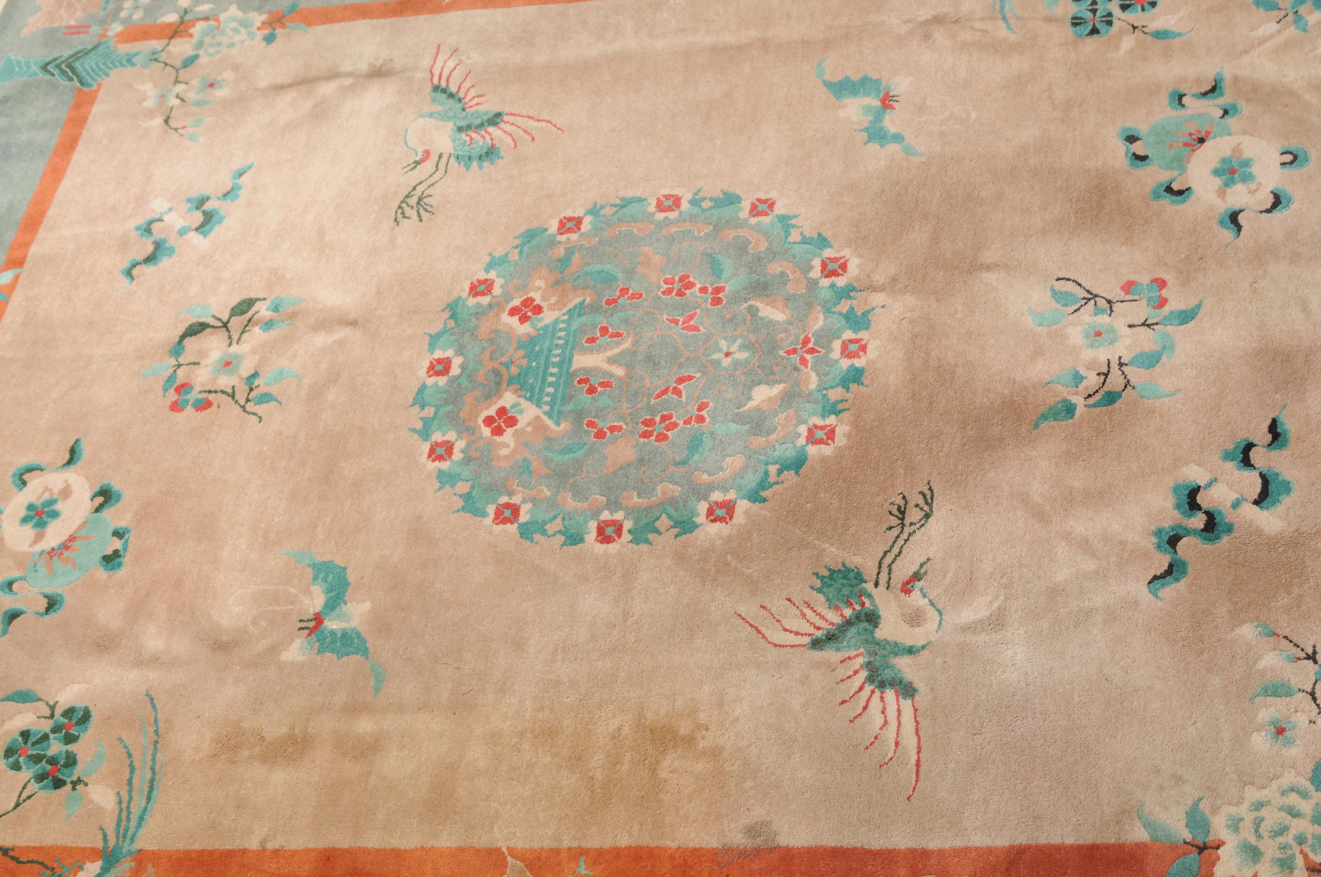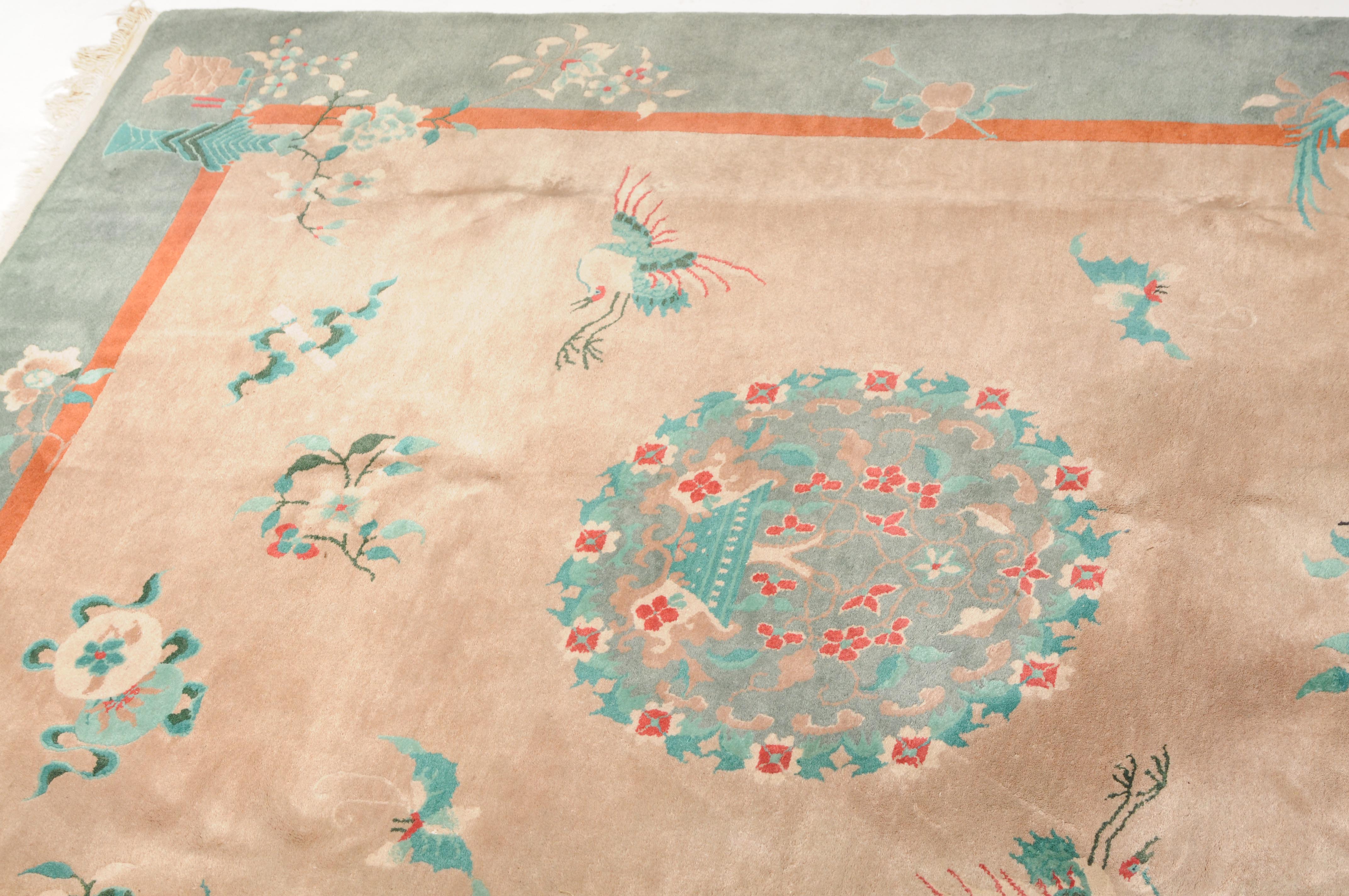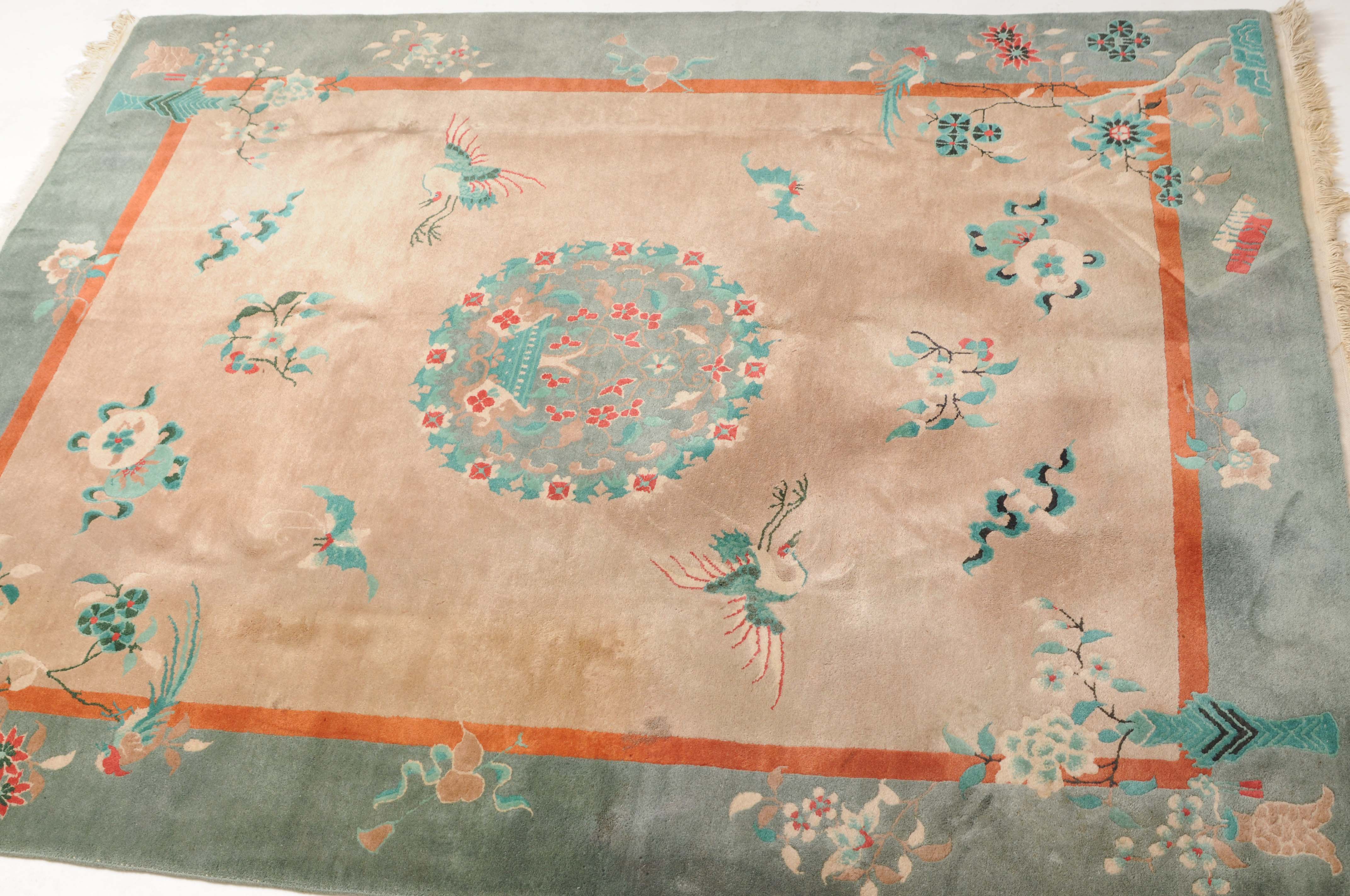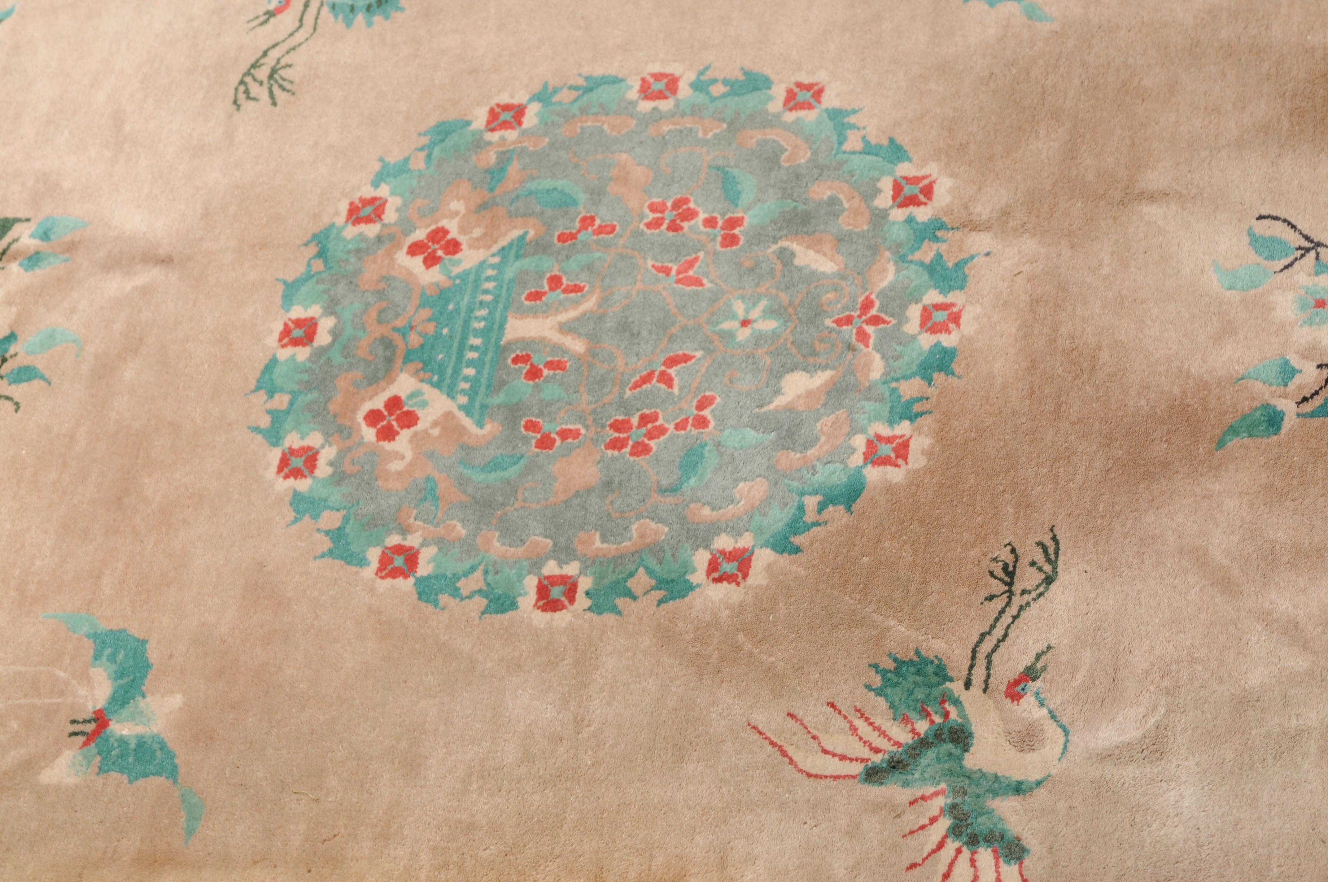 Wohl China, um 1950. Im rosaroten Feld ruht ein mit einer Vase verziertes dekoratives Rundmedaillon, flankiert von Kranichen, Schmetterlingen, Blütenranken und weiteren chinesischen Glückssymbolen. Die grüne Bordüre ist mit blumengefüllten Vasen und dekorativen Blütenranken belegt. Fleckig. Gute Erhaltung. 200x245 cm (ft. 6.6.x8.1).
