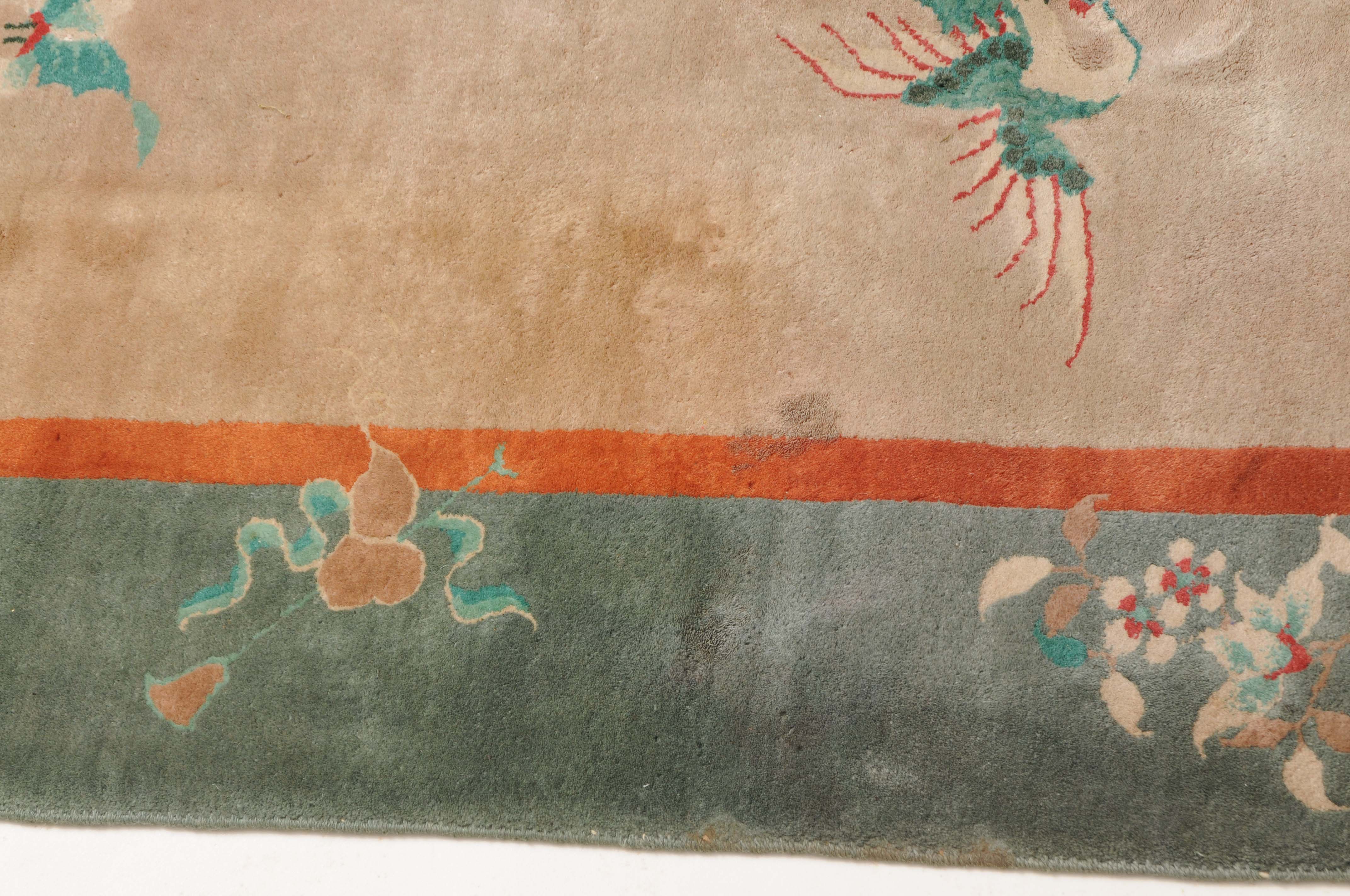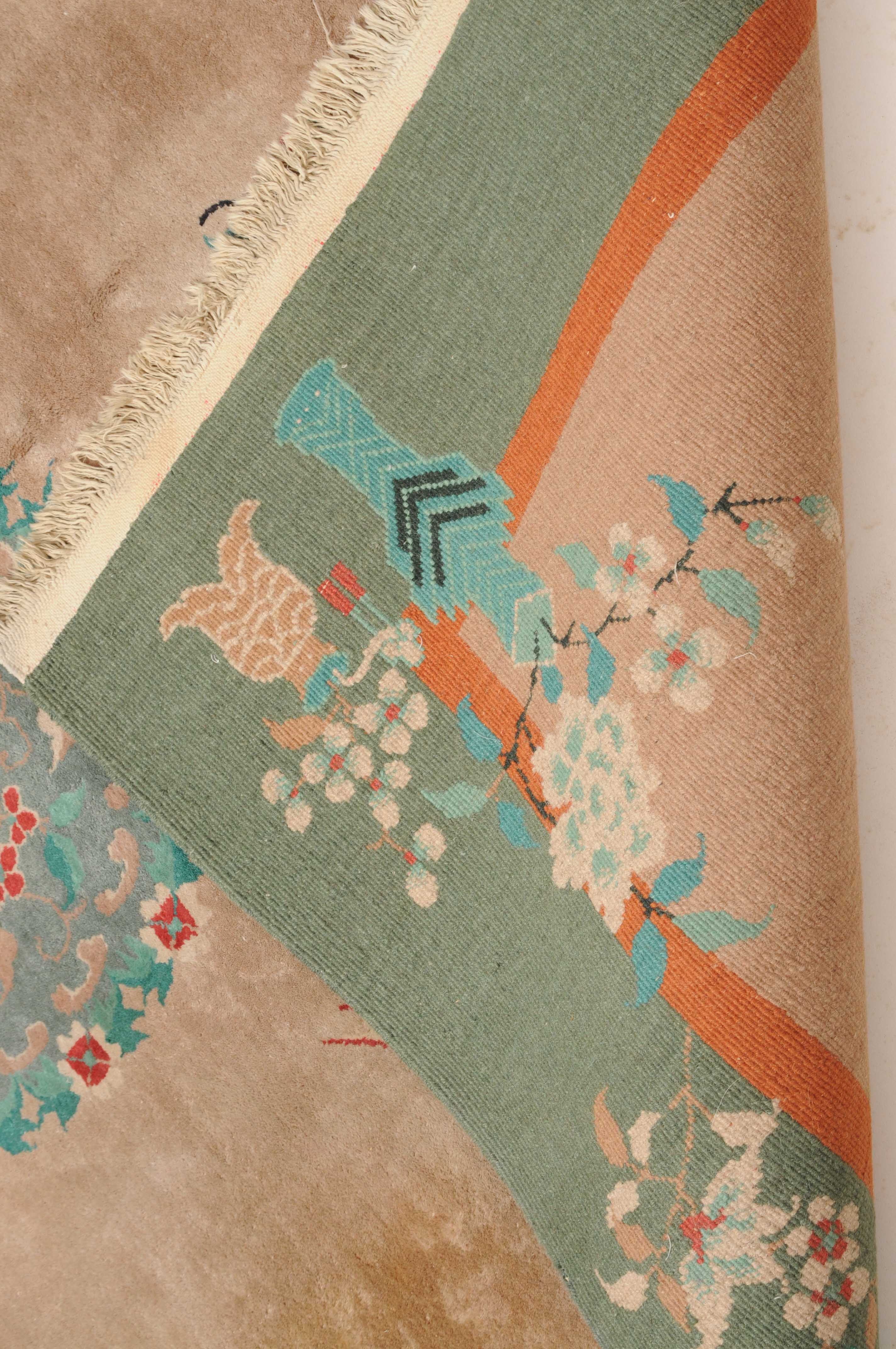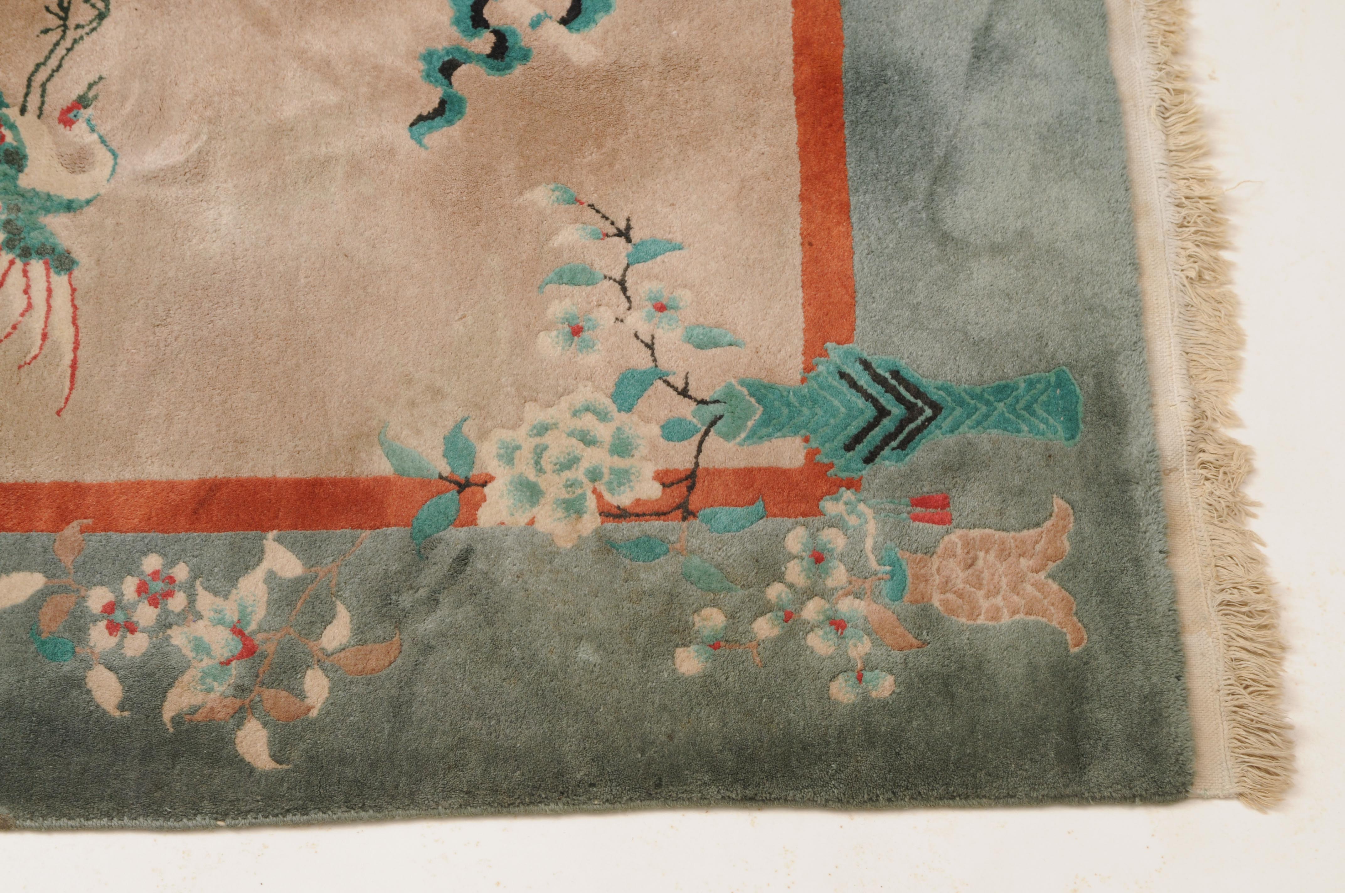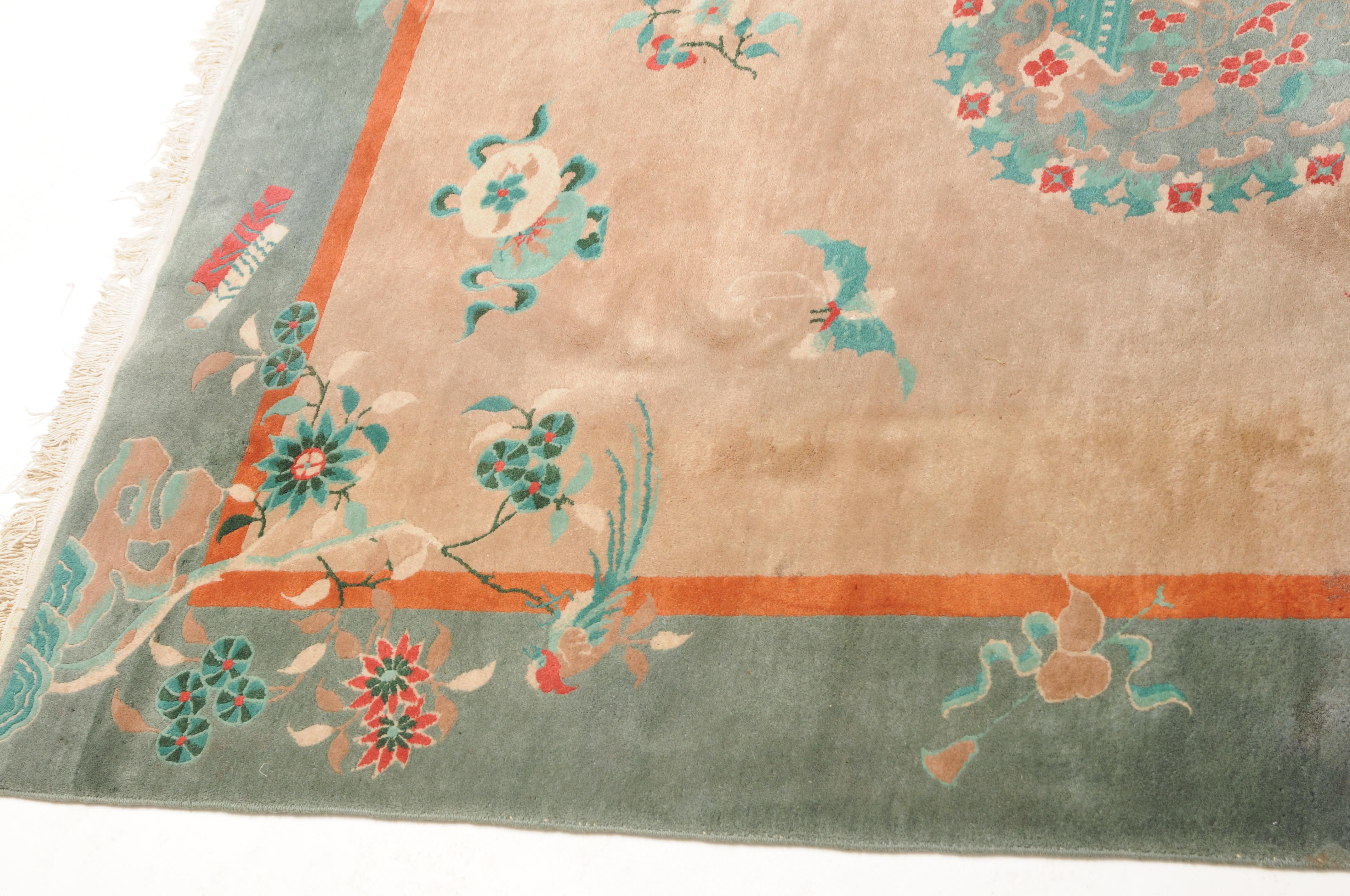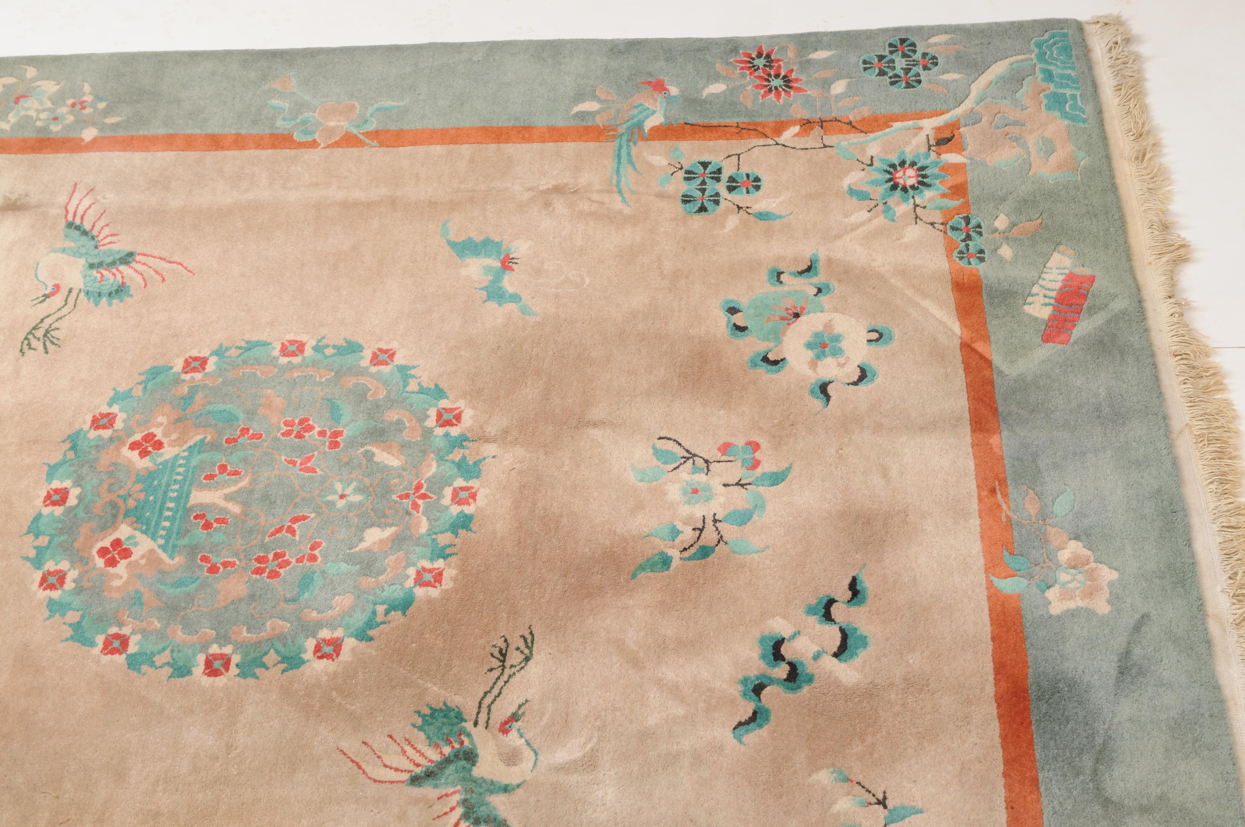 Wohl China, um 1950. Im rosaroten Feld ruht ein mit einer Vase verziertes dekoratives Rundmedaillon, flankiert von Kranichen, Schmetterlingen, Blütenranken und weiteren chinesischen Glückssymbolen. Die grüne Bordüre ist mit blumengefüllten Vasen und dekorativen Blütenranken belegt. Fleckig. Gute Erhaltung. 200x245 cm (ft. 6.6.x8.1).