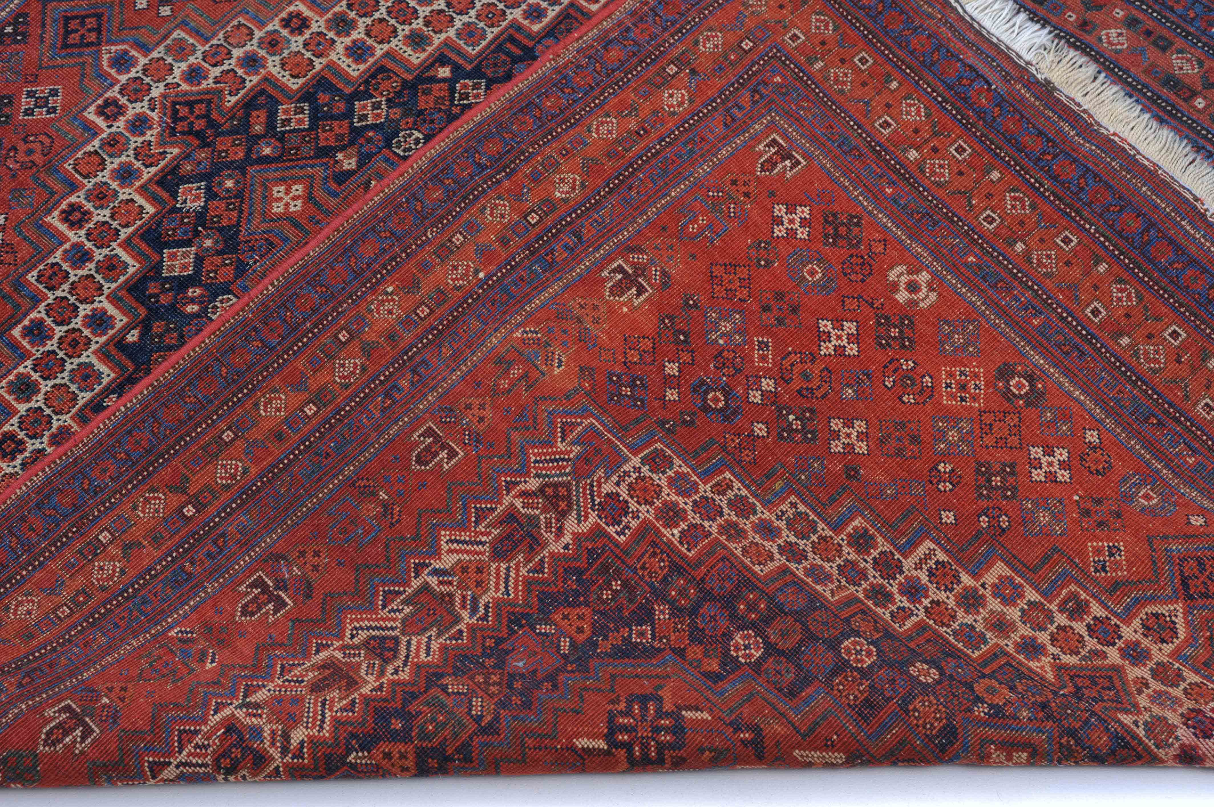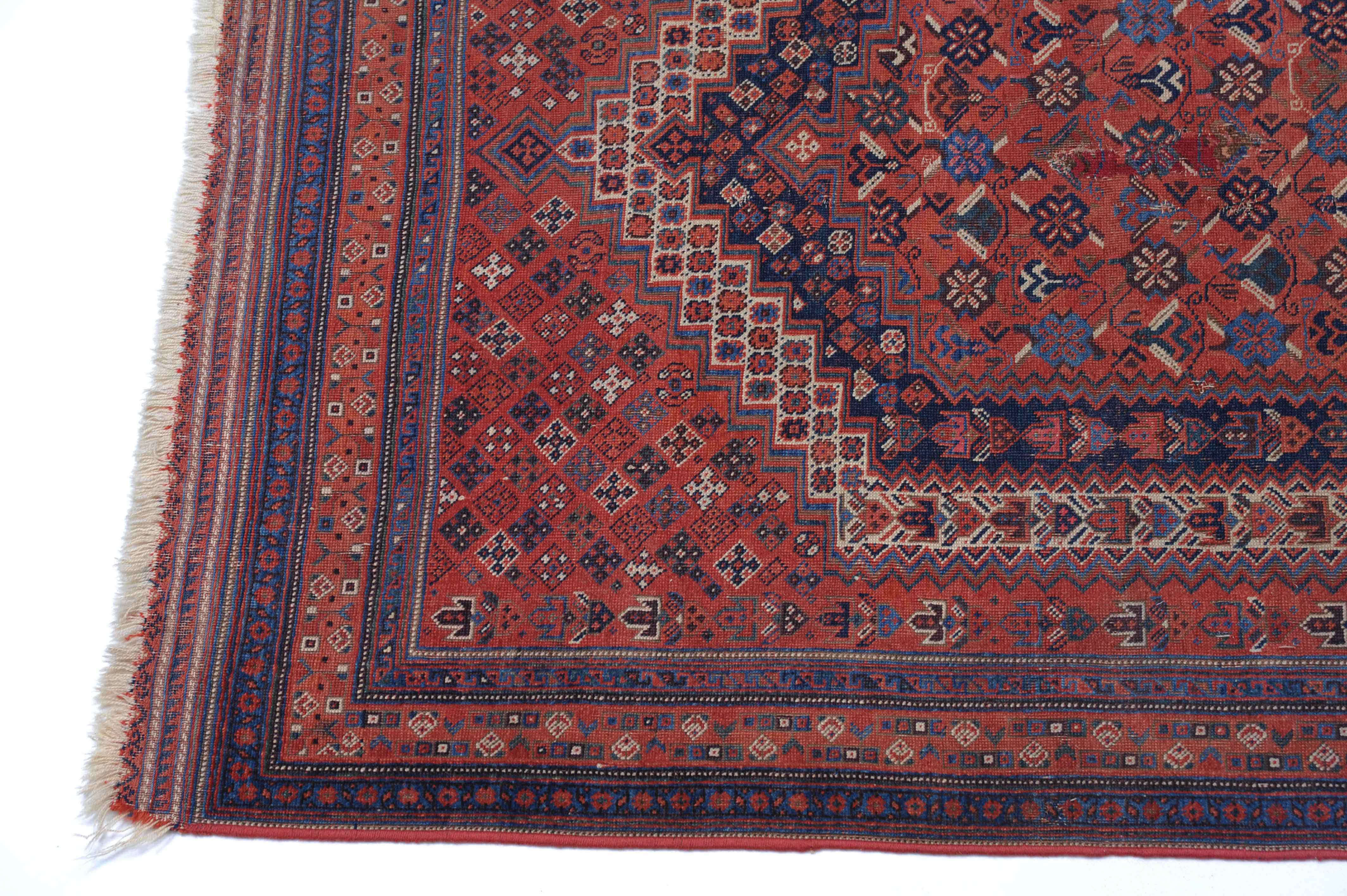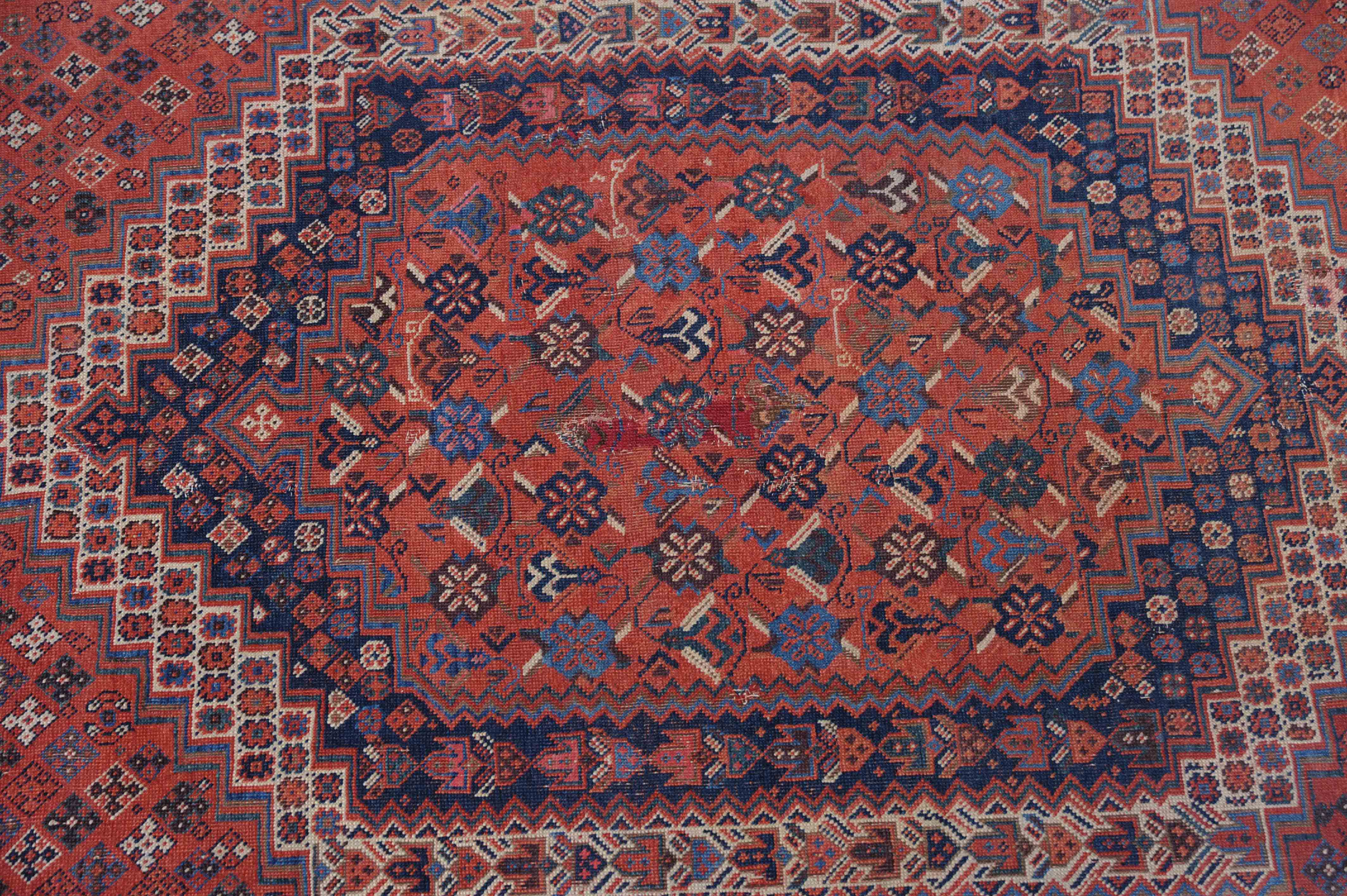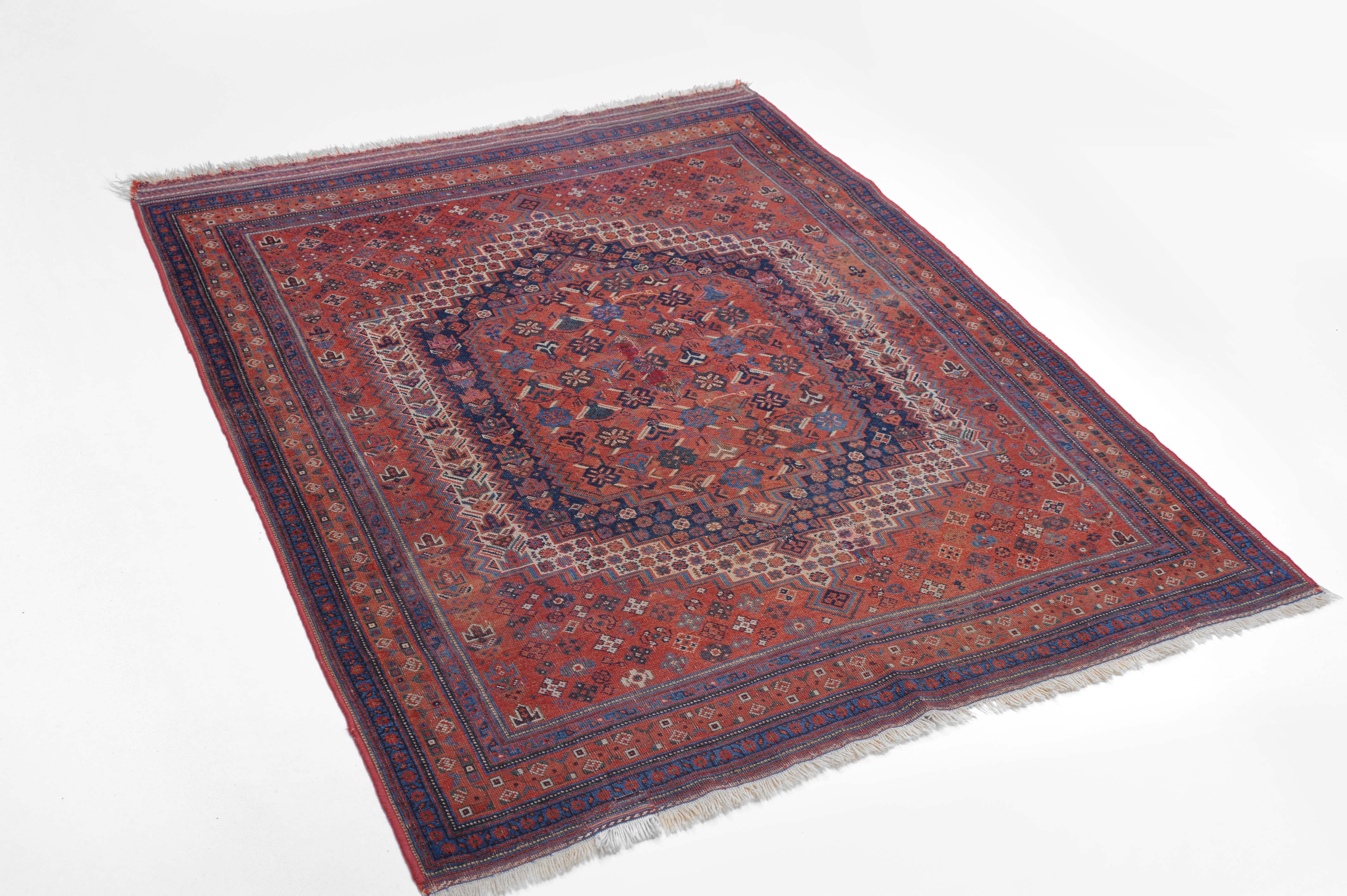 S-Persien, um 1900. Auf rotem Grund liegen 3 ineinander getreppte Hexagone, die mit einer Vielfalt von Blüten und dekorativen Afshar-Elementen verziert sind. 2 hellblaue Nebenbordüren umgeben die braunrote, mit fein gezeichneten Blüten und Ranken belegte Bordüre. Reparierte Stelle in der Mitte des Teppichs. Gute Erhaltung. 120x163 cm (ft. 4x5.4).