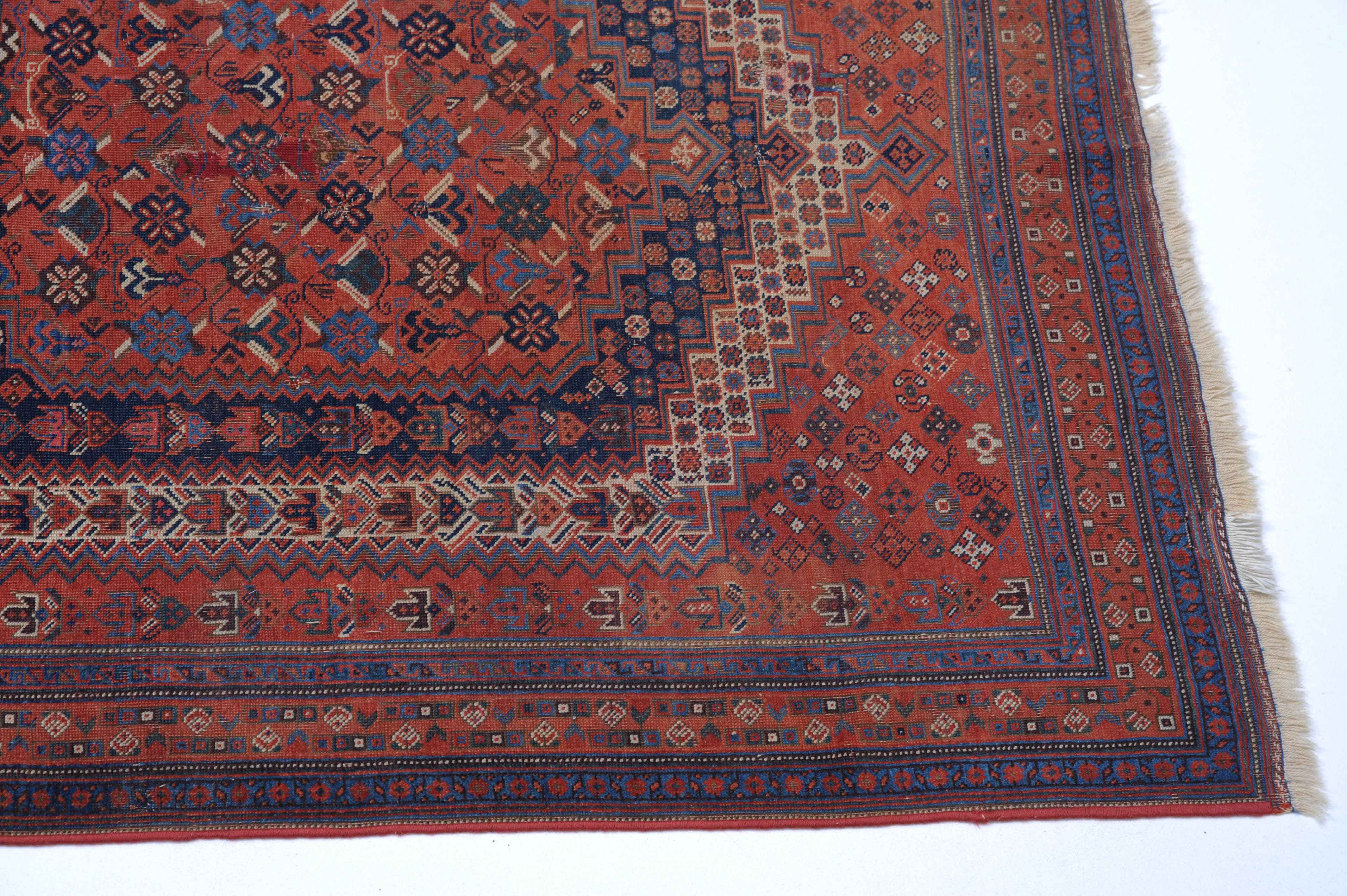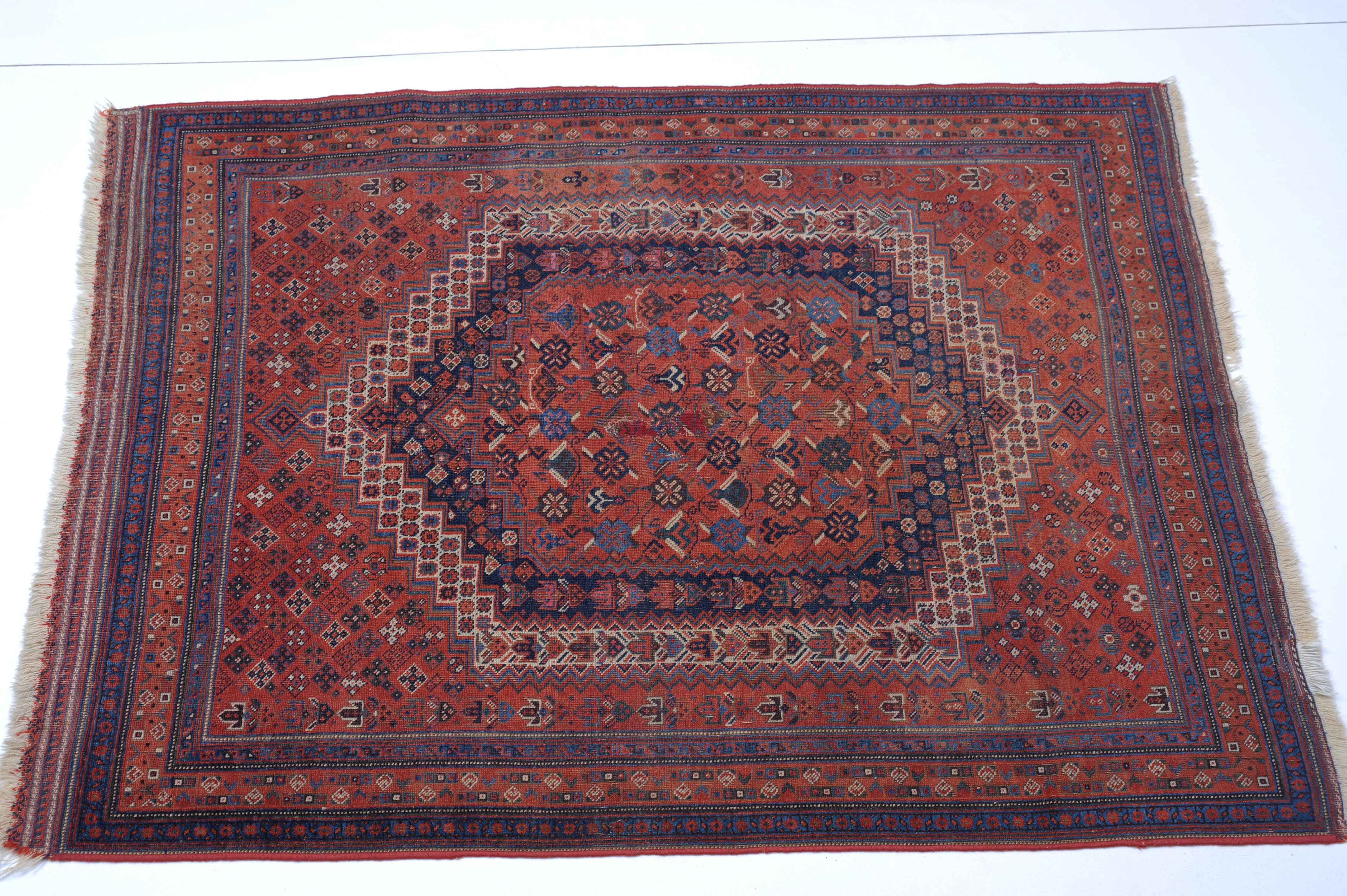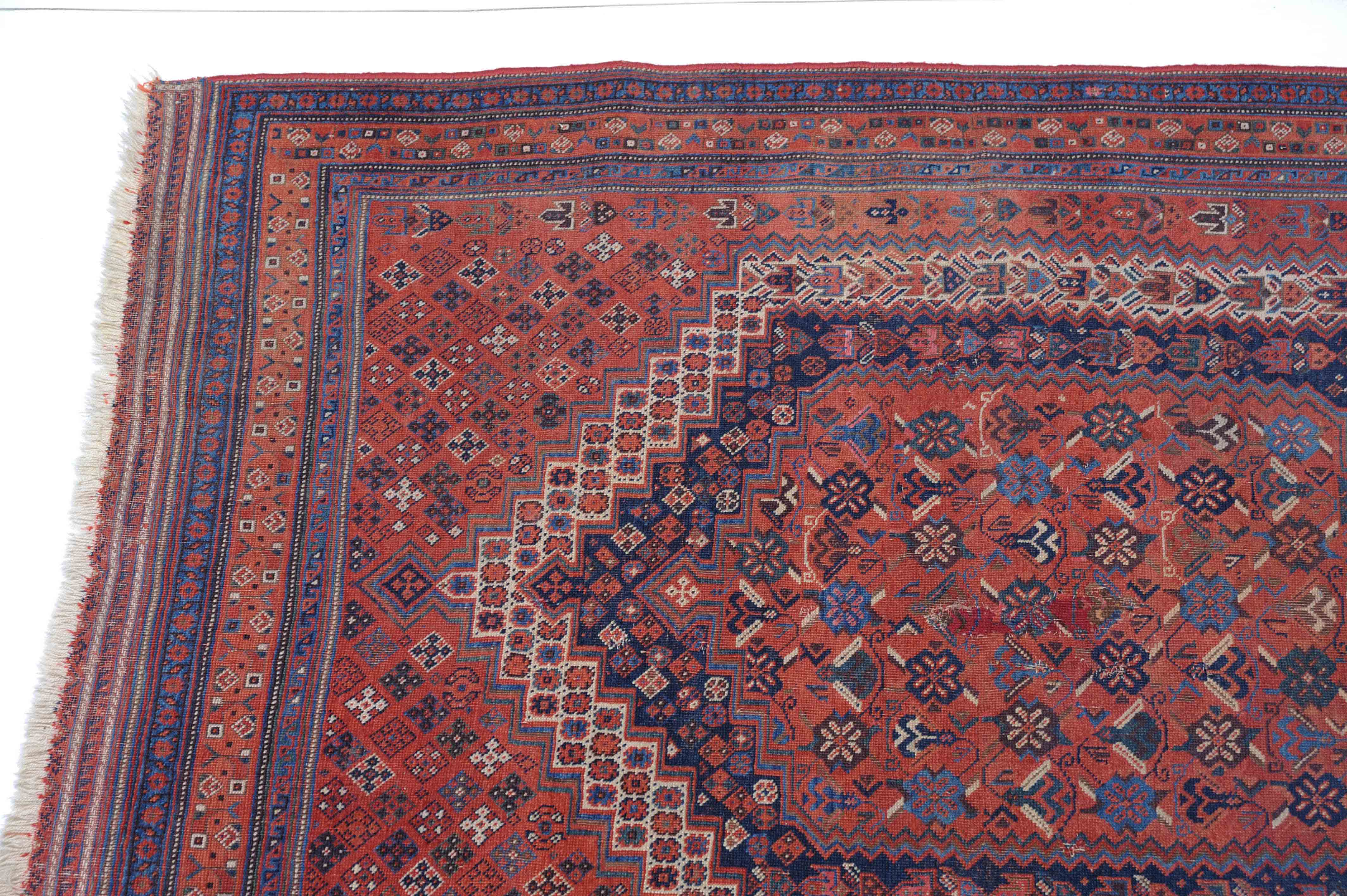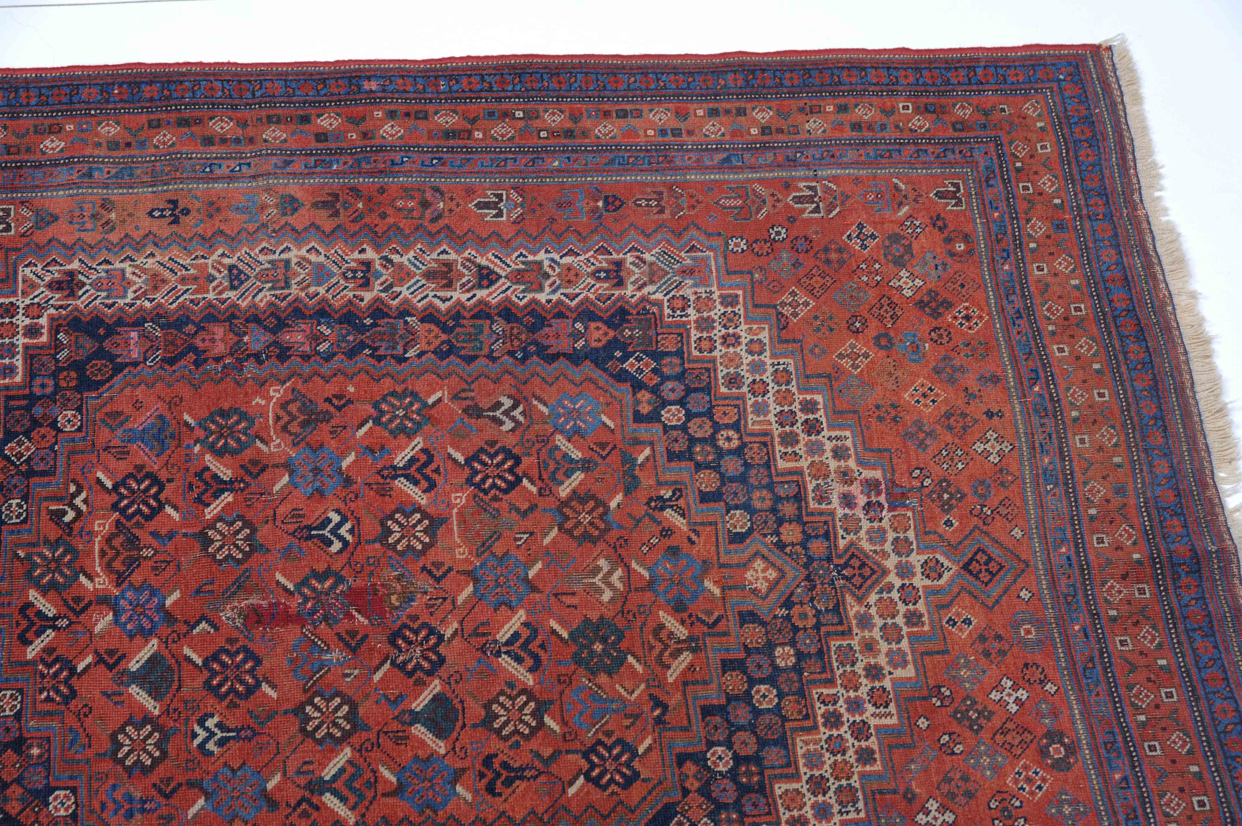 S-Persien, um 1900. Auf rotem Grund liegen 3 ineinander getreppte Hexagone, die mit einer Vielfalt von Blüten und dekorativen Afshar-Elementen verziert sind. 2 hellblaue Nebenbordüren umgeben die braunrote, mit fein gezeichneten Blüten und Ranken belegte Bordüre. Reparierte Stelle in der Mitte des Teppichs. Gute Erhaltung. 120x163 cm (ft. 4x5.4).