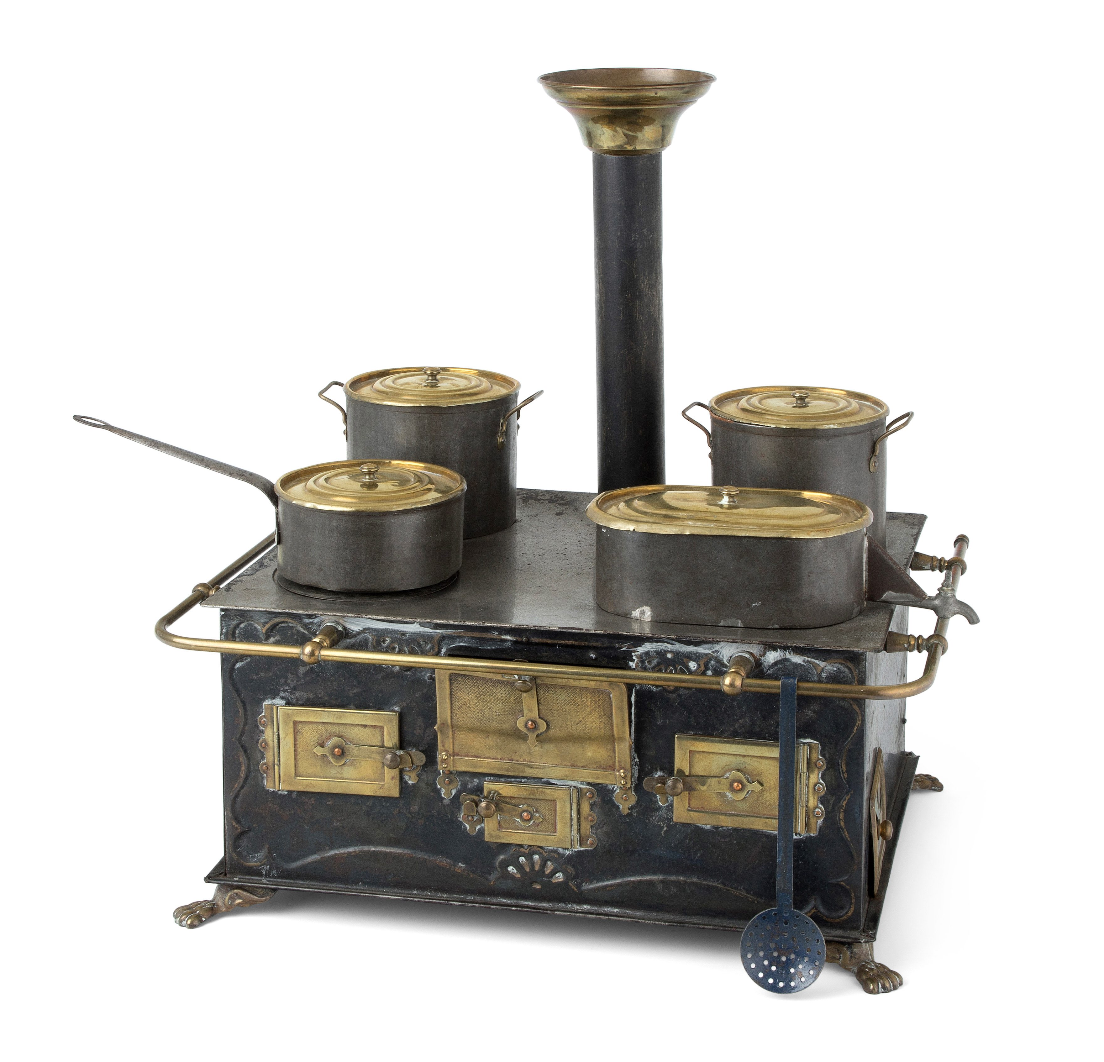 Gebr. Bing, Nürnberg, um 1900. Rechteckiger Korpus aus geprägtem Schwarzblech mit Eisenplatte. Türchen, Stange und Löwenfüsse aus Messing. 4 Kochstellen und Kamin. Originales Topfset aus Weissmetall mit Messingdeckeln. Pfanne, 2 Töpfe und Wasserschiff. Mit Brenner. 35x26,5x40 cm.