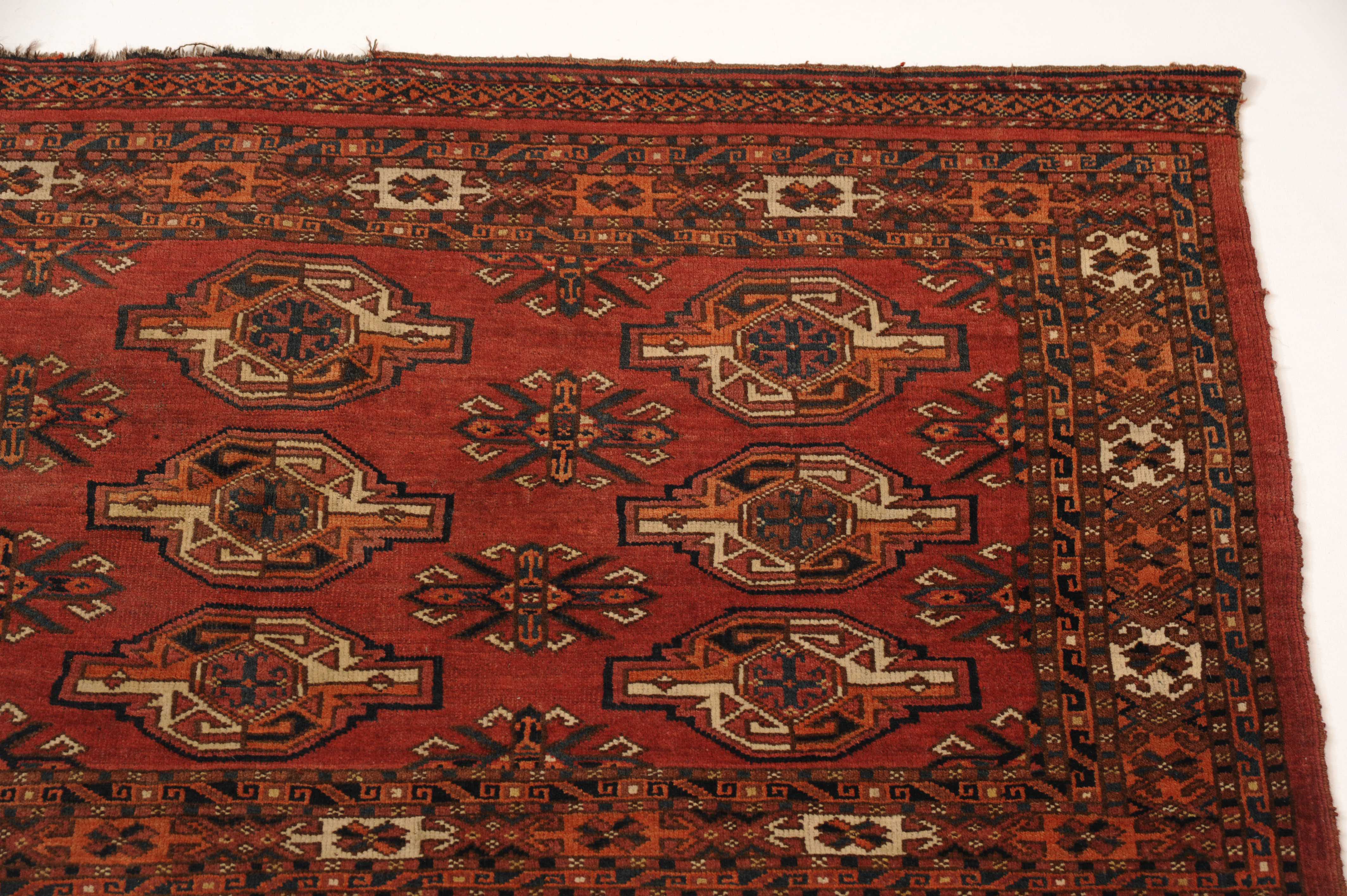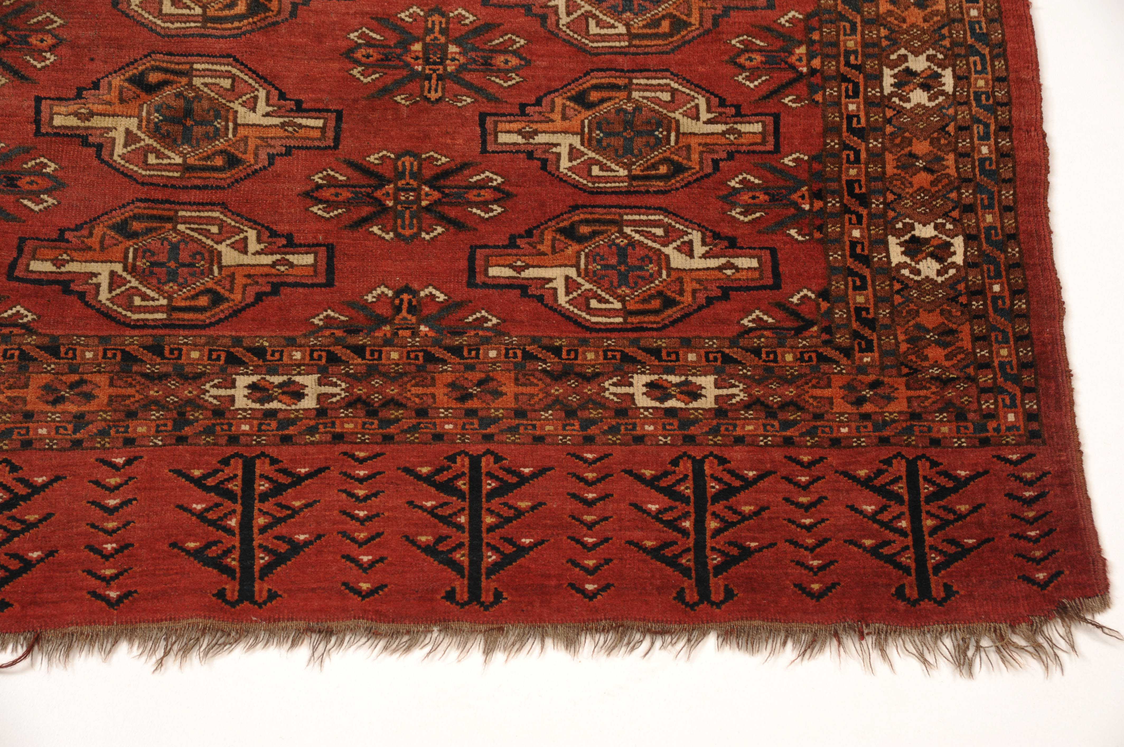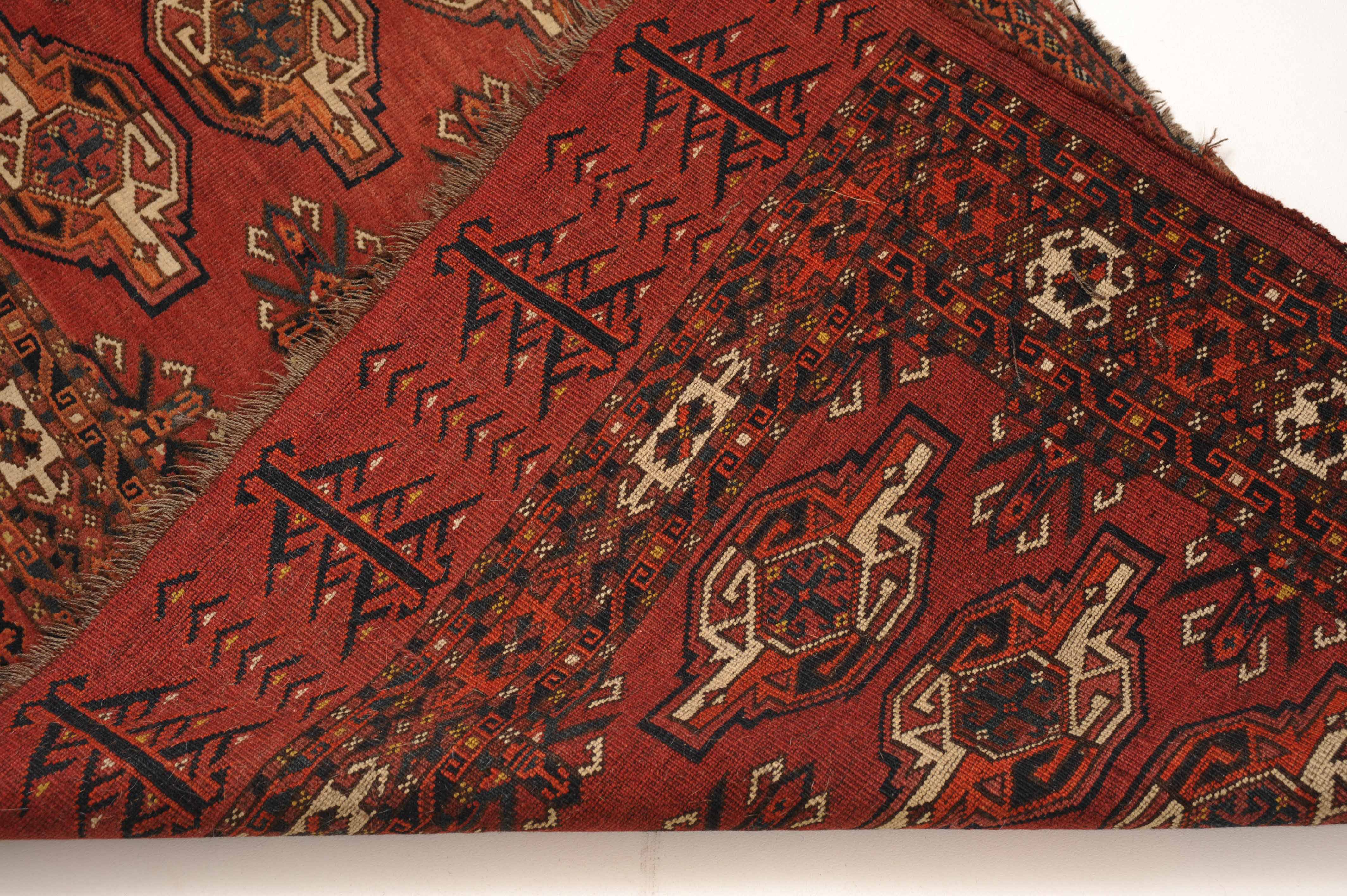 S-Turkmenistan, um 1910. Auf braunrotem Grund liegen 3 Reihen vertikal angelegter Ersari-Göls, flankiert von 2 Reihen mit sekundären Göls. An die Kotschanak-Hauptbordüre grenzt eine mit effektvollen Lebensbäumen belegte Schürze. Gute Erhaltung. 85x144 cm (ft. 2.8x4.8).