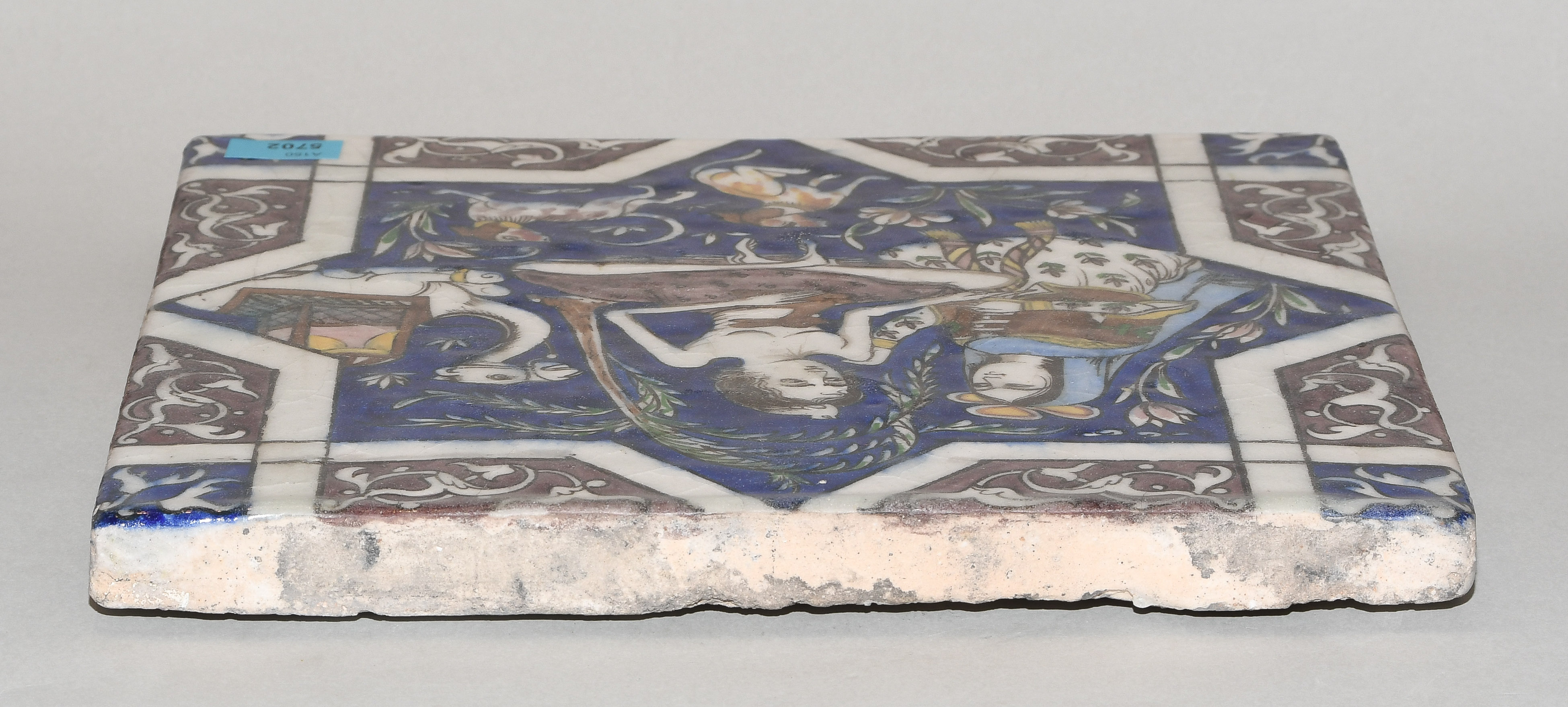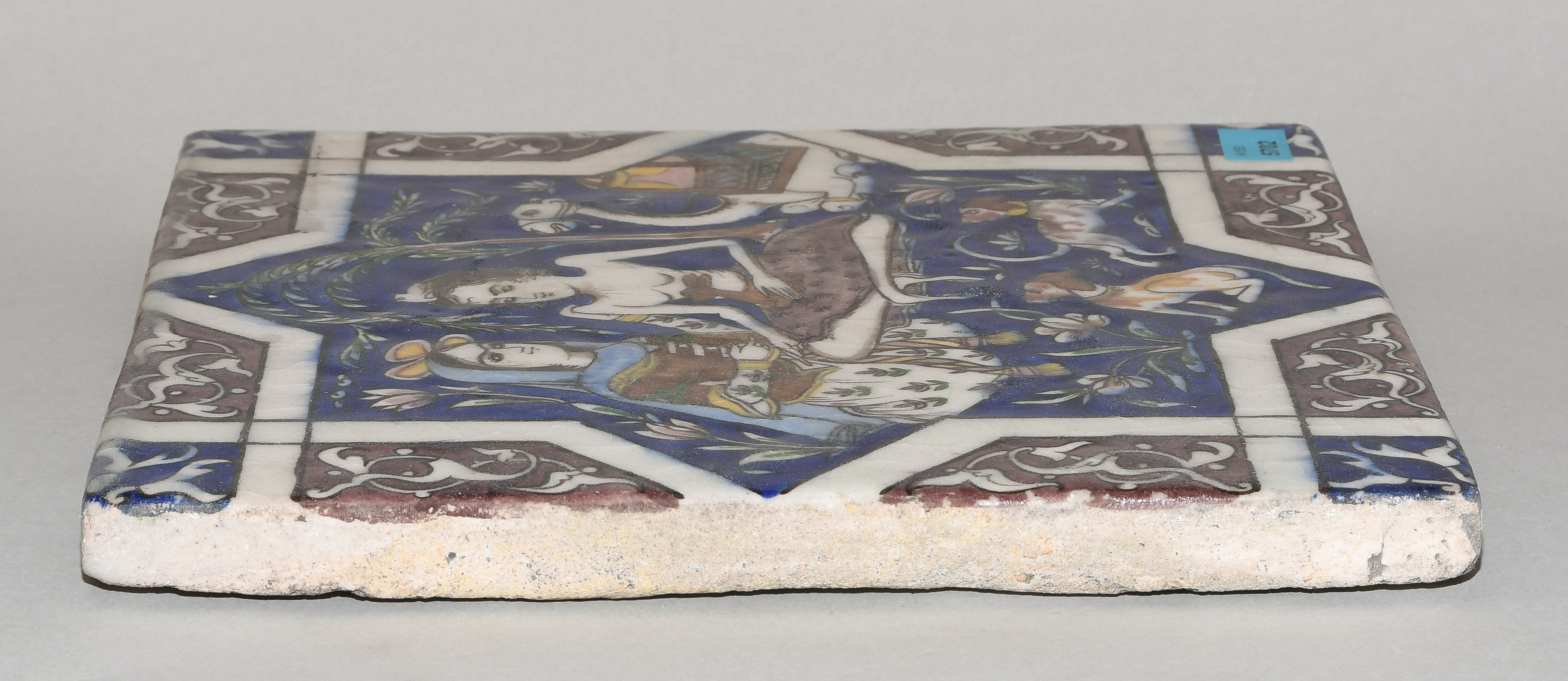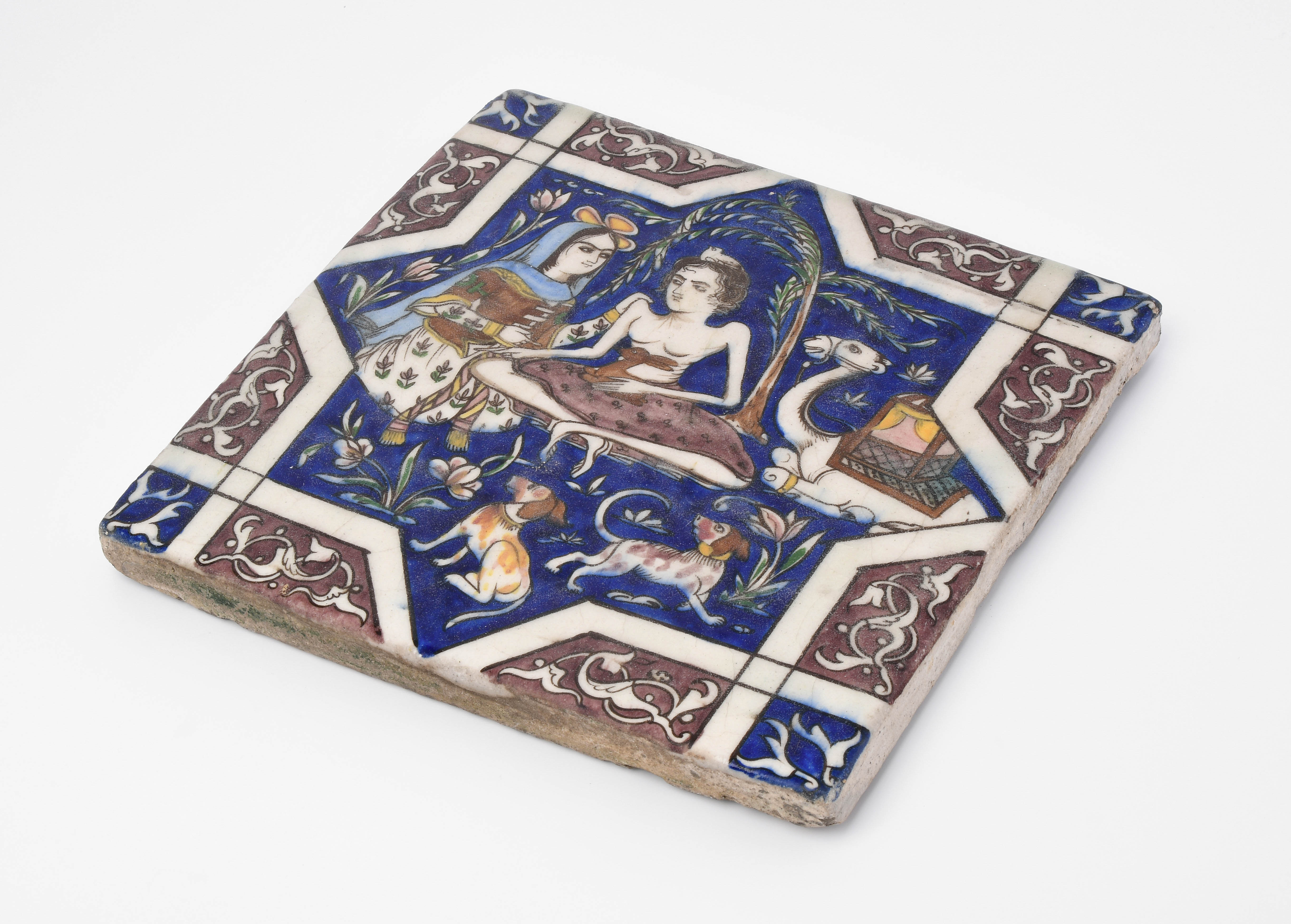 Qajar, 19.Jh. Keramik. Polychromer Figurendekor. 25,5x25,5 cm.