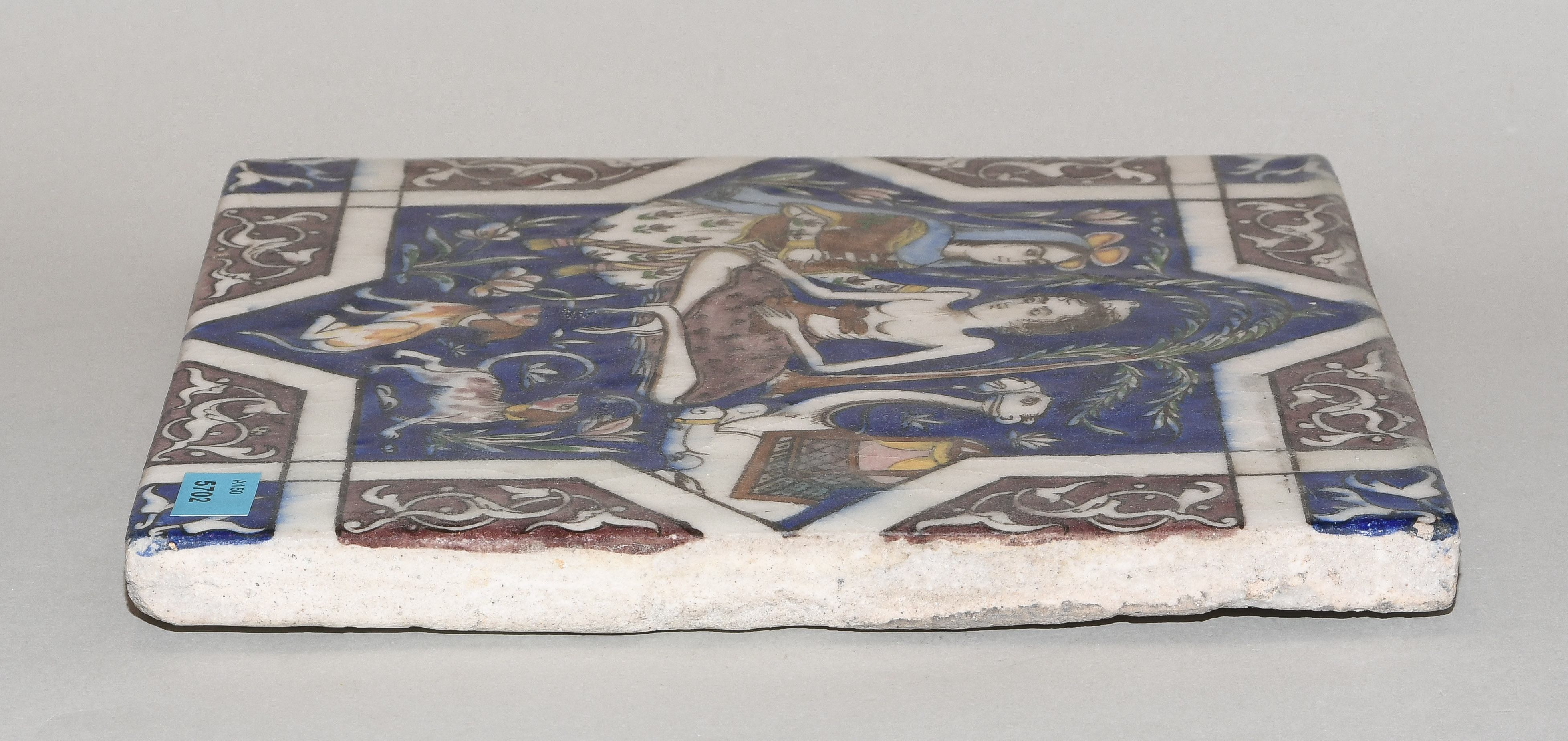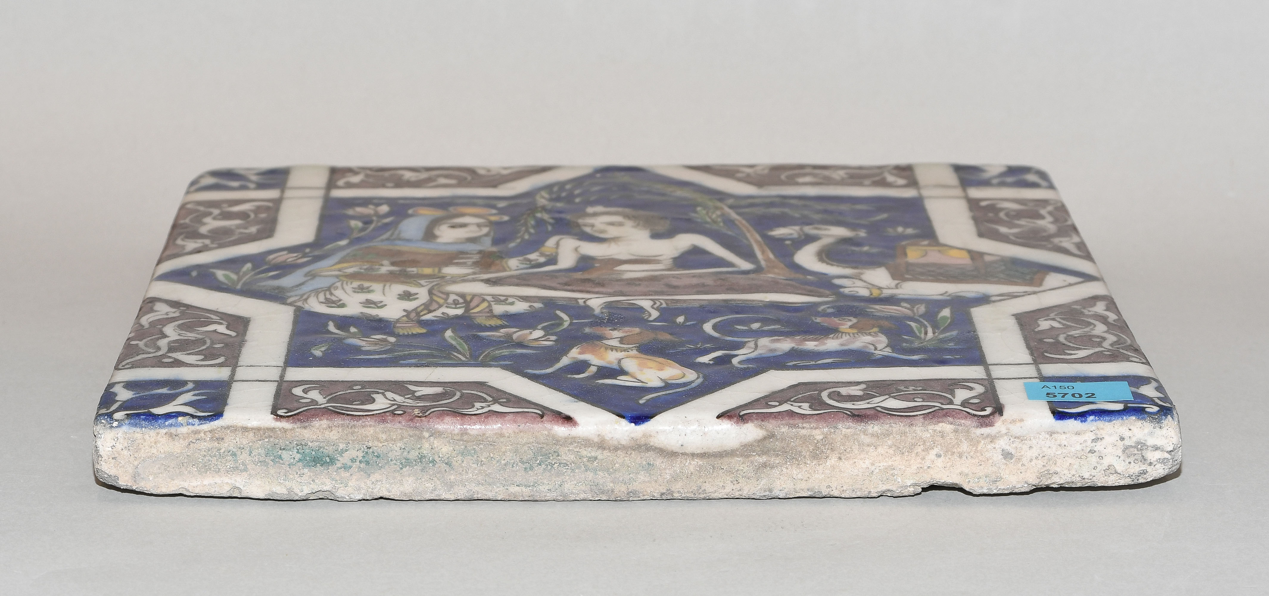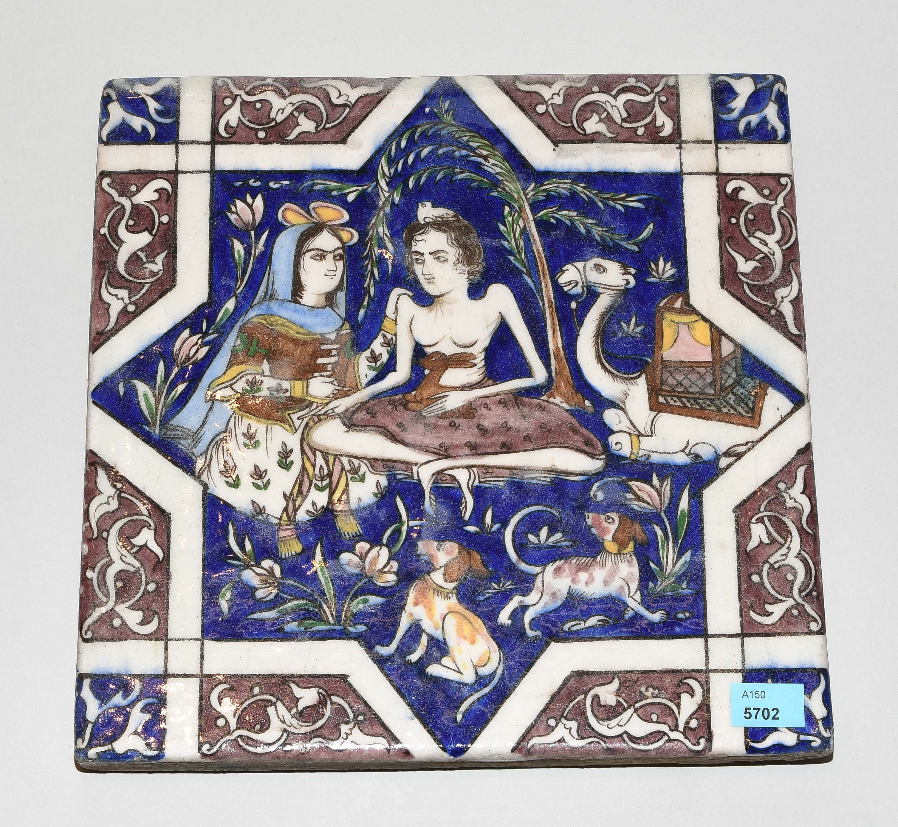 Qajar, 19.Jh. Keramik. Polychromer Figurendekor. 25,5x25,5 cm.