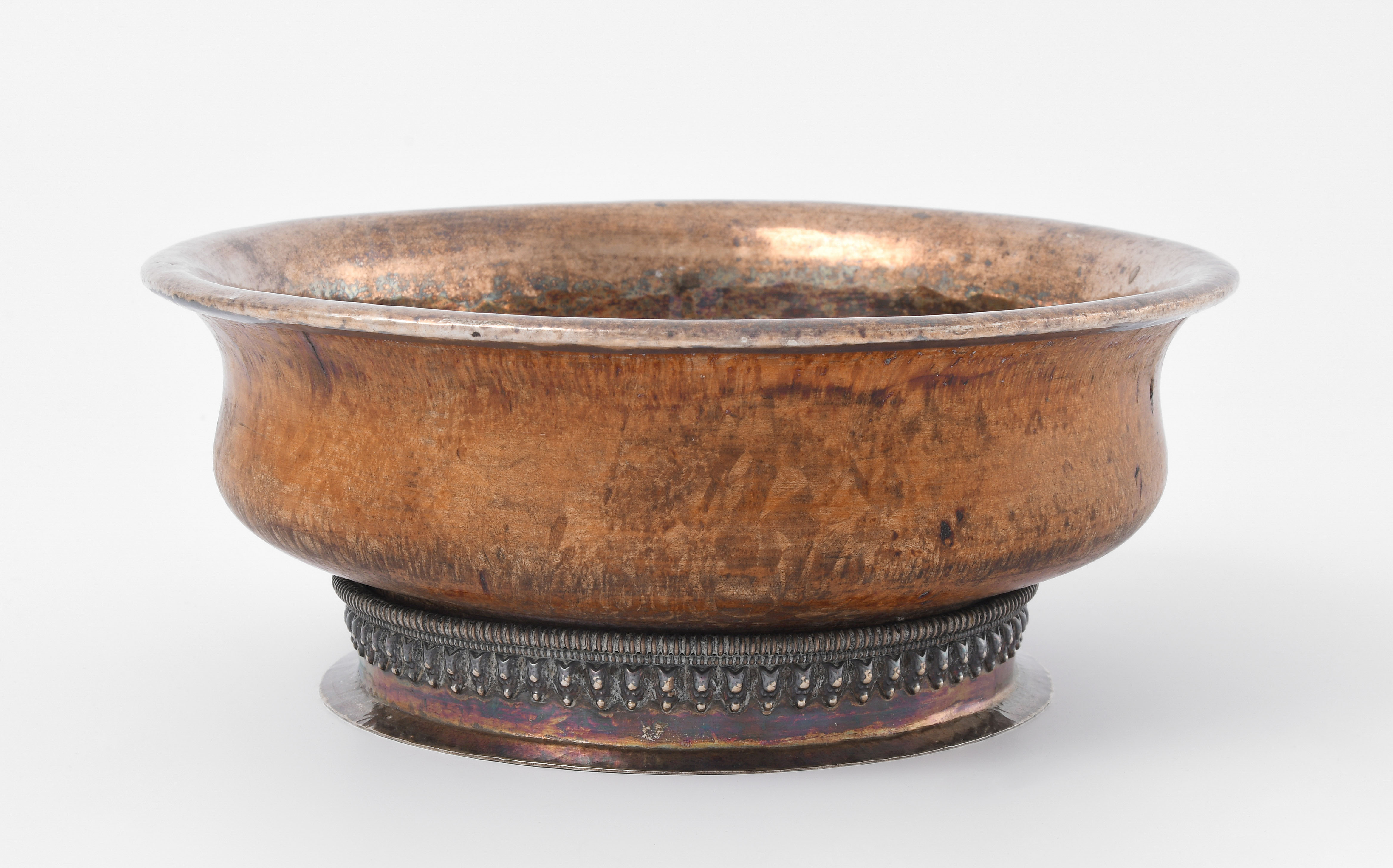 Tibet, 19./20.Jh. Wurzelholz, eingefasst und ausgekleidet mit Silberblech. Riss. H 7,5, Ø 18,5 cm.