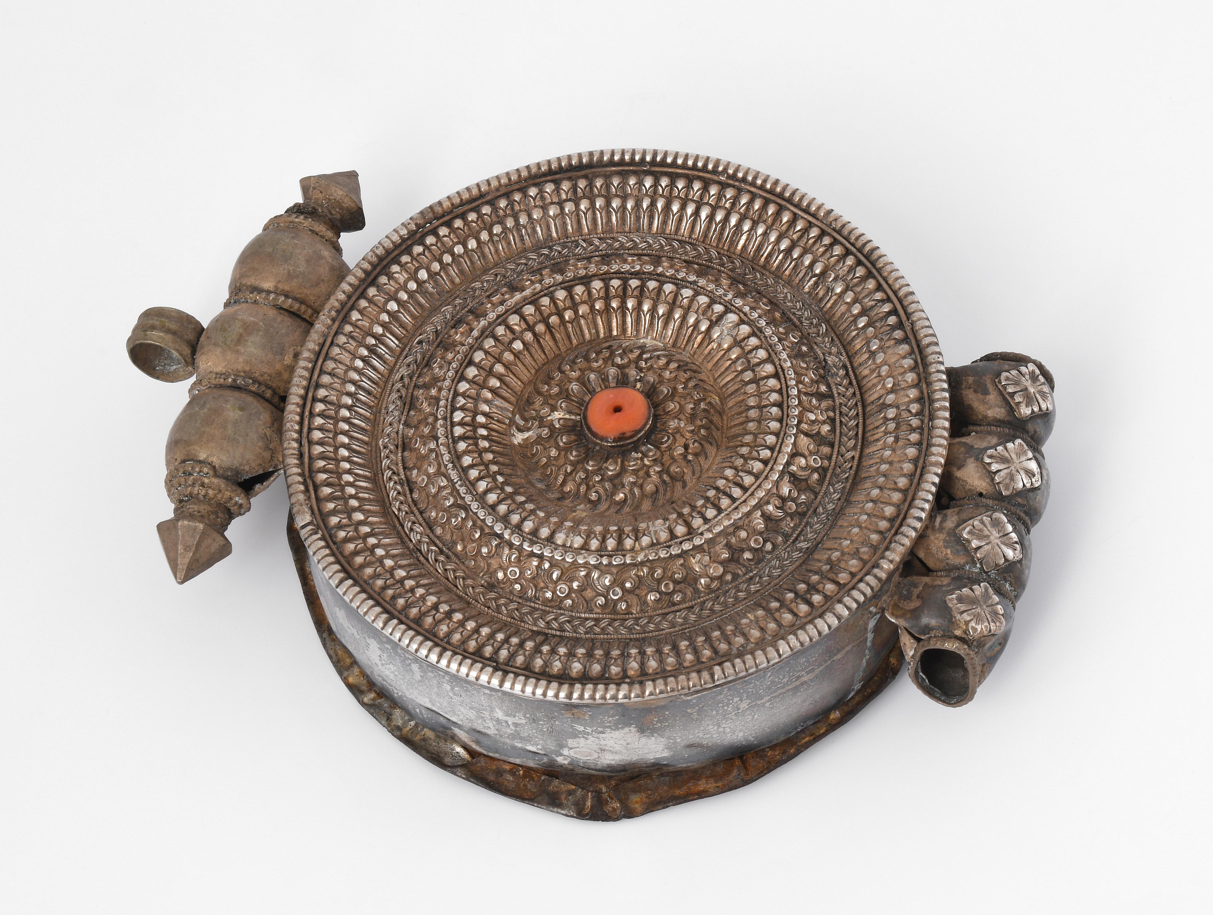 Tibet. Metall, versilbert. Rundes Kästchen mit Stülpdeckel. In der Mitte kleine, eingelegte Korallenperlen. L 14 cm.