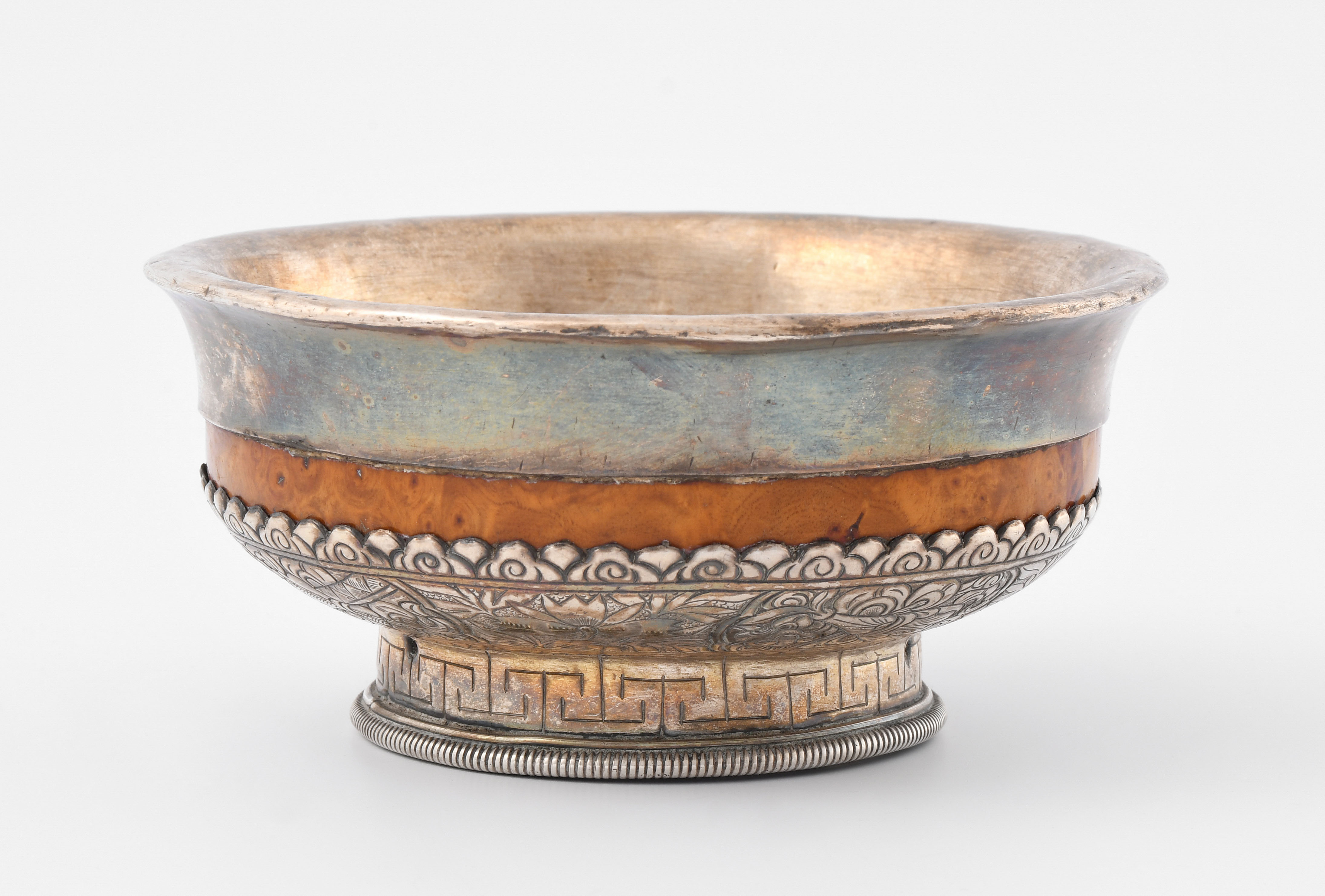 Tibet, 19./20.Jh. Wurzelholz, eingefasst und ausgekleidet mit Silberblech. H 5,3, Ø 11,5 cm. - Schadstellen.