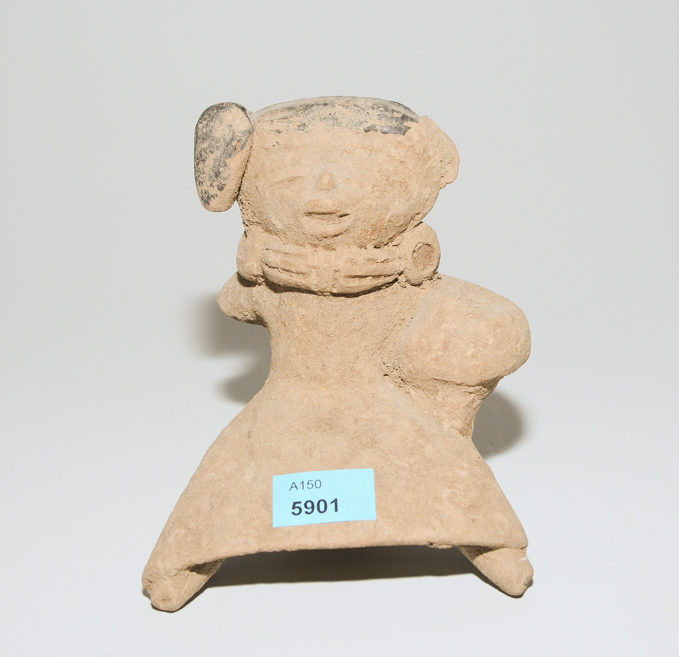 Mexico, Veracruz, ca. 300–900 n.C. Brauner Ton, Frisur mit Chapopote-Bemalung. Sitzende Figur, Gefäss haltend. H 11 cm.