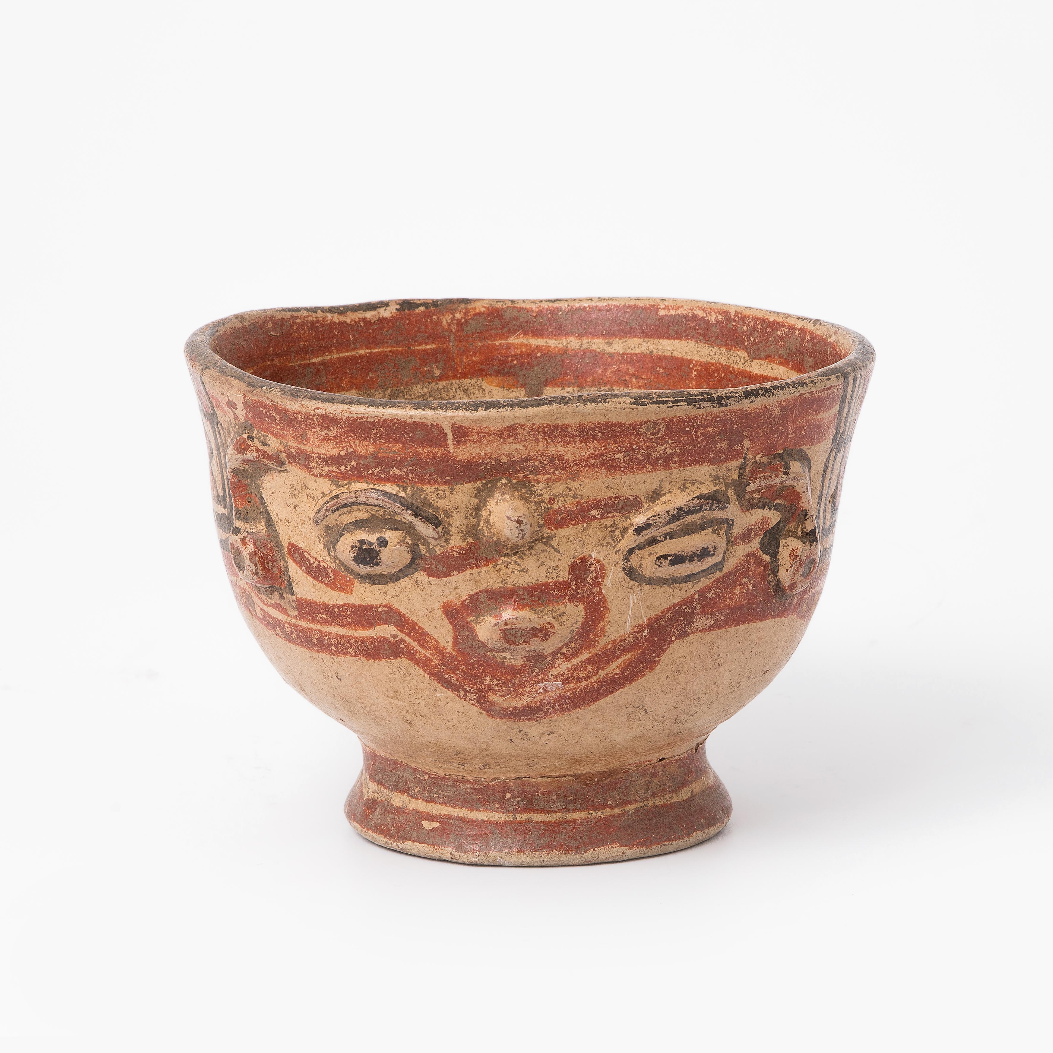 Guanacaste / Nicoya, 1000–1500 n.C. Ton, cremefarben, rot und schwarz bemalt. Schale auf Standring mit Gesicht. H 9, D 12,5 cm.