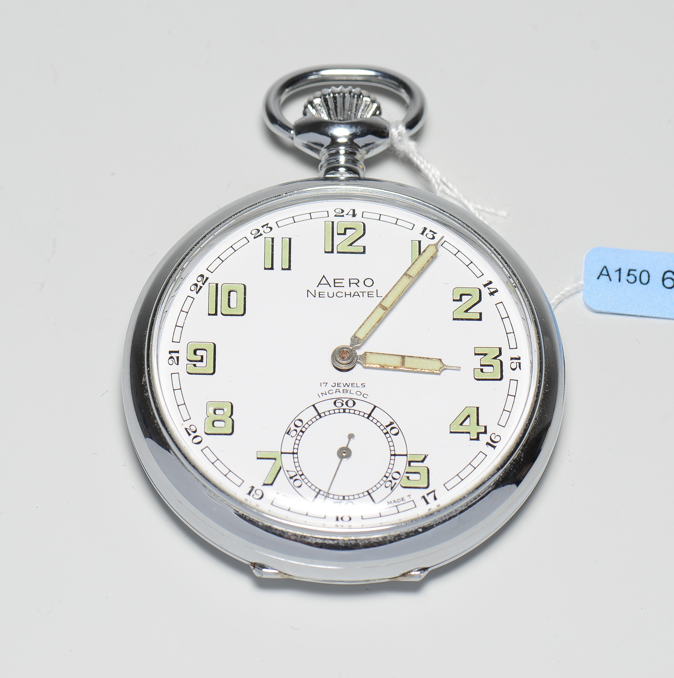 Runde, mechanische Taschenuhr 60er Jahre mit Handaufzug in Stahlgehäuse. Boden gedrückt, Unitas Werk signiert, D 50 mm. Weisses Emailzifferblatt mit grünen, arabischen Stundenzahlen, Minutenindizes. Grüne Lancetten-Zeiger, kleine Sekundenanzeige bei 6 Uhr, Krone und Bügel bei 12 Uhr. Gebrauchsspuren.