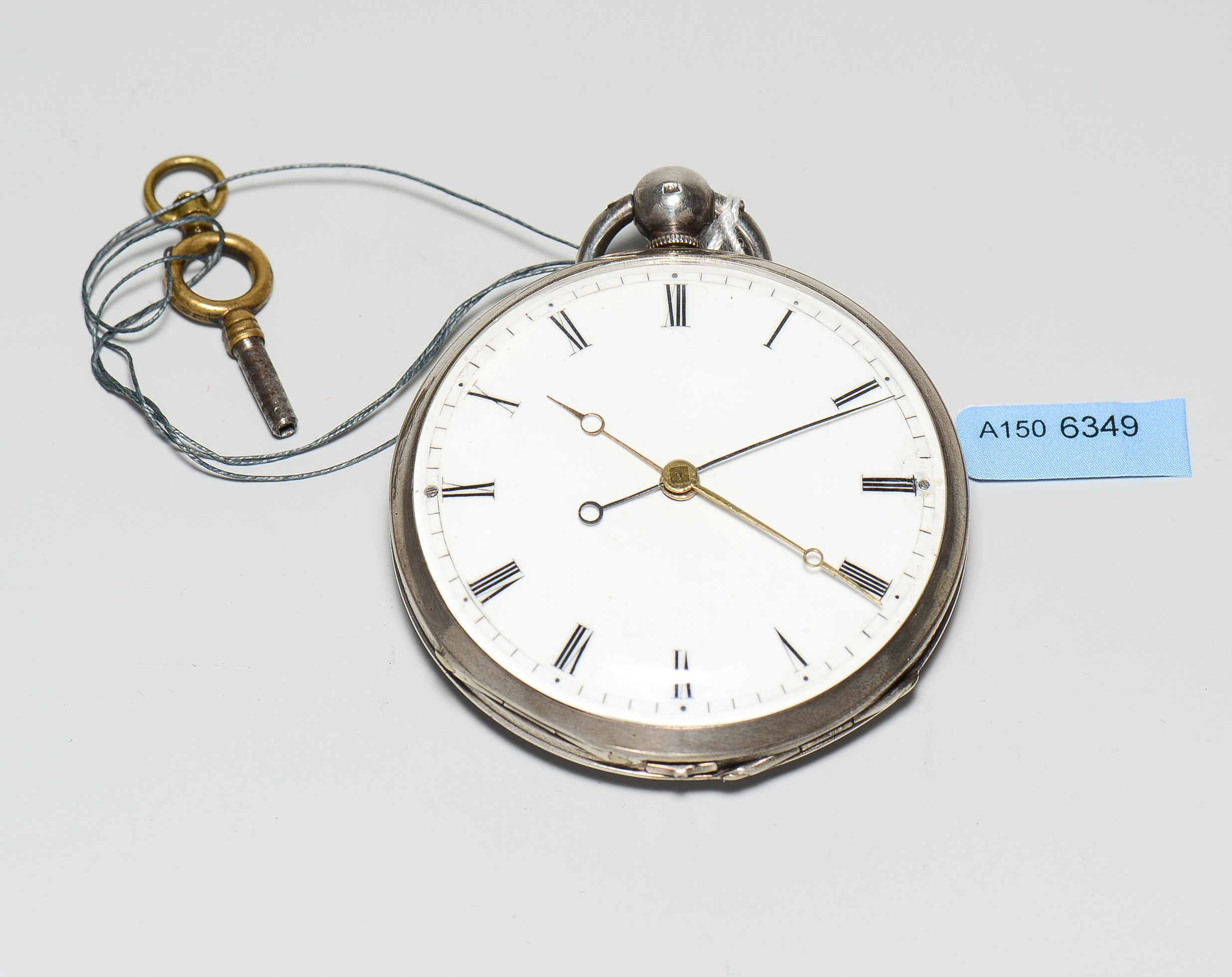 Runde, mechanische Taschenuhr um 1900 mit Schlüsselaufzug in Stahlgehäuse. Rückendeckel guillochiert, Boden gedrückt, Werkdeckel mit Aufzugslöchern, D 52 mm. Weisses Emailzifferblatt mit schwarzen, römischen Stundenzahlen, Minutenindizes. Goldfarbene Breguet-Zeiger, zentraler Sekundenzeiger, Krone und Bügel bei 12 Uhr, Schieber für den Sekundenzeiger bei 6 Uhr. Schlüssel beigegeben. Gebrauchsspuren.