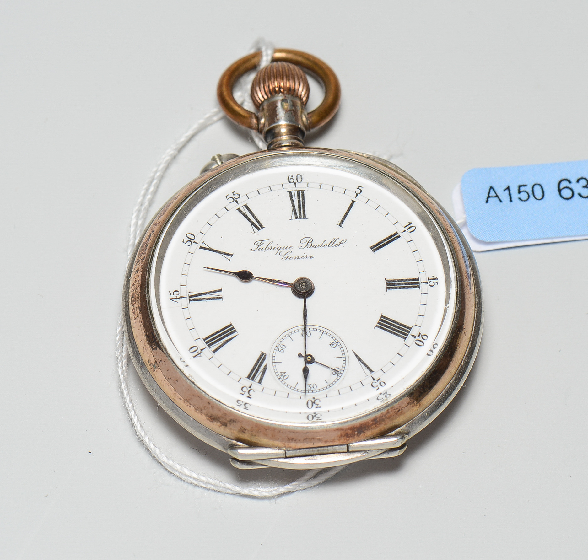 Runde, kleine, mechanische Taschenuhr um 1900 mit Handaufzug in Silbergehäuse. Rückendeckel guillochiert mit zentralem Medaillon, Boden gedrückt, Werknummer 283334, Gehäusenummer 324859, D 53 mm. Weisses Emailzifferblatt mit schwarzen, römischen Stundenzahlen, schwarze, arabische Minutenzahlen und -indizes. Gebläute Birnen-Zeiger, kleine Sekundenanzeige bei 6 Uhr, Krone und Bügel bei 12 Uhr, Drücker für die Zeiteinstellung bei 11 Uhr. Gebrauchsspuren. Zu revidieren.