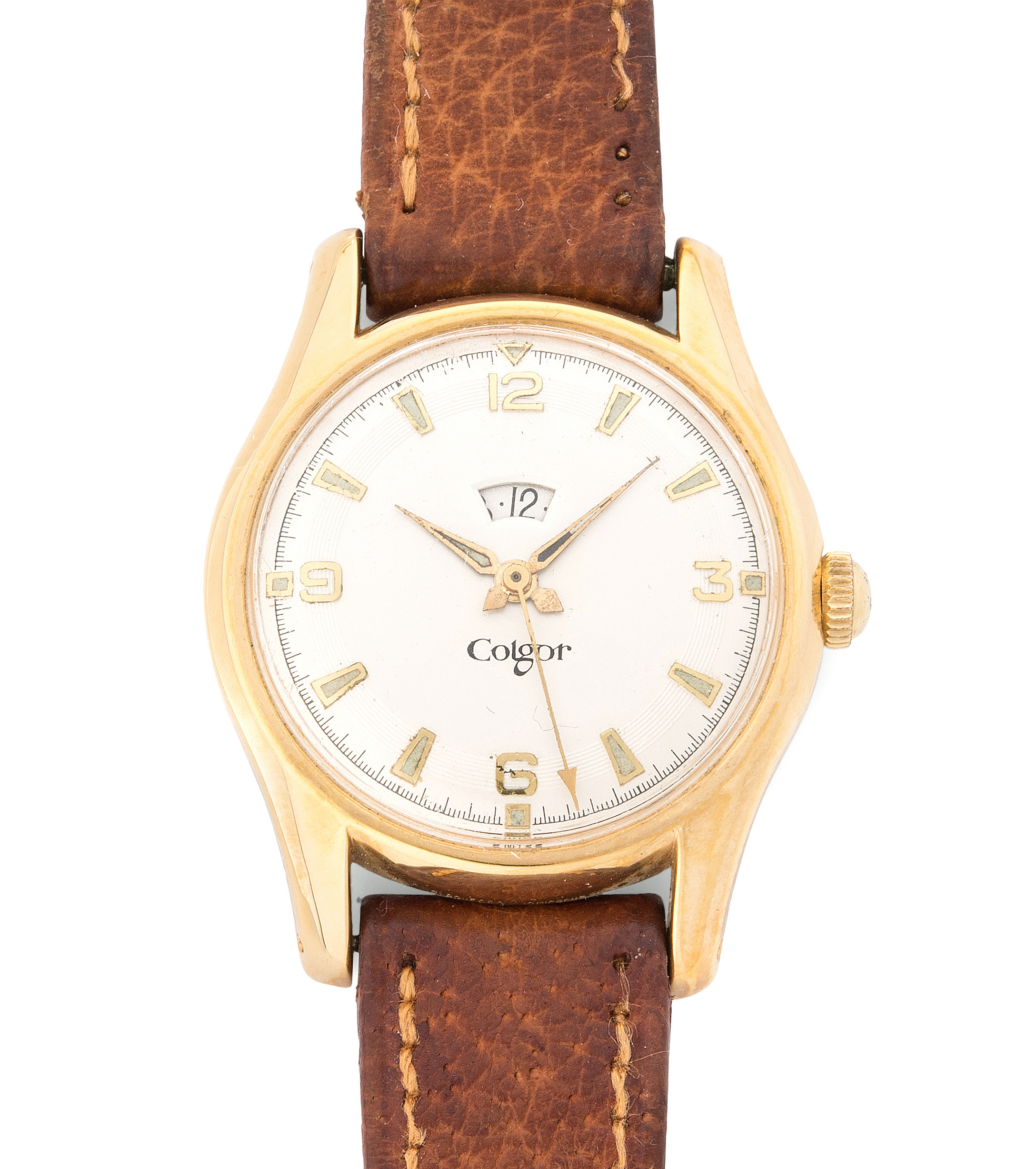Runde, automatische Armbanduhr um 1948 in vergoldetem Stahlgehäuse. Boden verschraubt, Kaliber 699, Referenznummer 5343, D 33 mm. Cremefarbenes Zifferblatt mit aufgesetzten, goldfarbenen, arabischen Stundenzahlen und -indizes, schwarze Minuten-, Sekundenindizes. Goldfarbene Fantasie-Zeiger, zentraler Sekundenzeiger, Gangreserve bei 12 Uhr, Krone bei 3 Uhr. Hellbraunes Lederarmband mit Dornschliesse. Gebrauchsspuren.