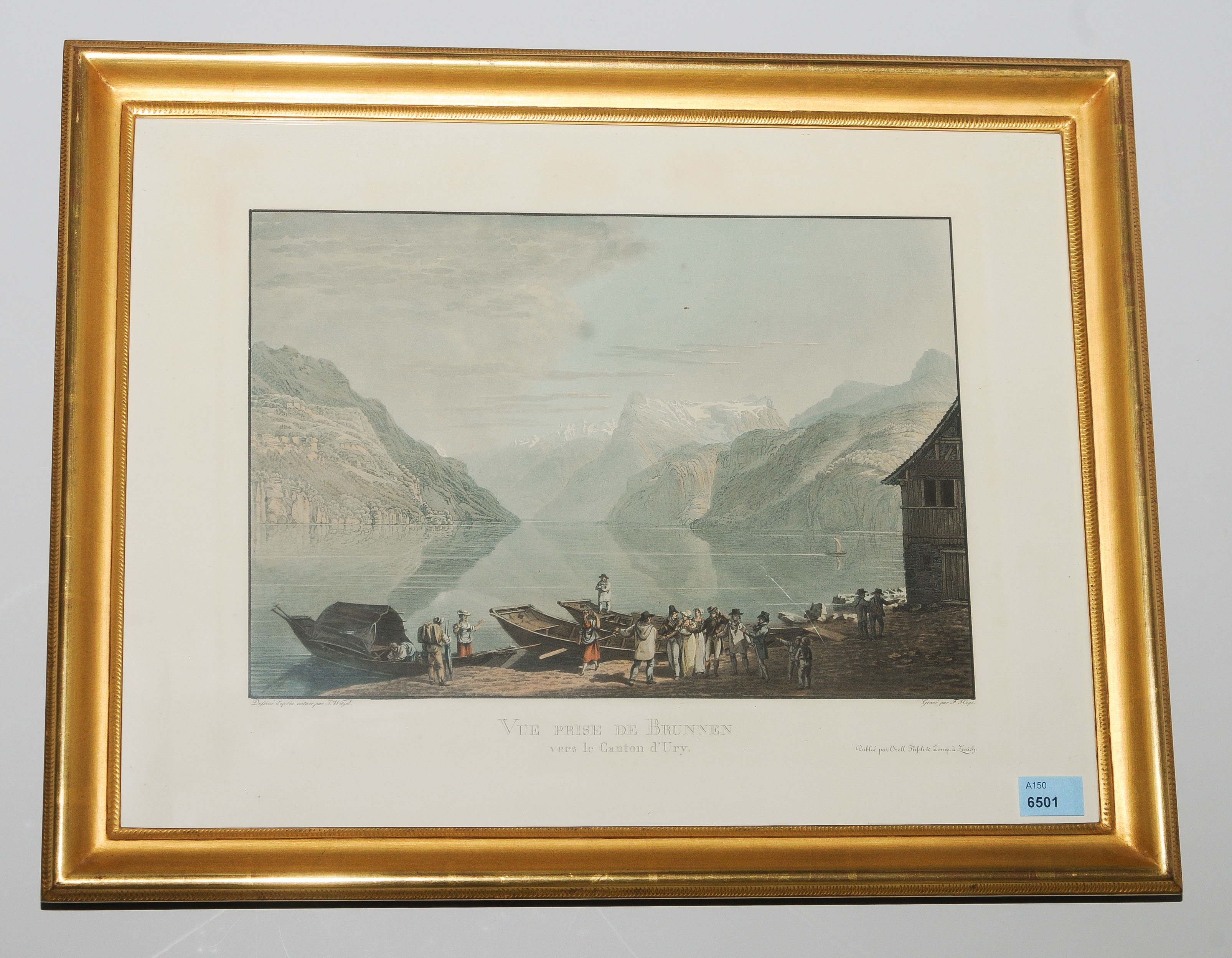 "Vue prise de Brunnen vers le Canton d'Ury". Kol. Aquatinta von F. Hegi nach J.J. Wetzel. Hrsg. v. Orell Füssli & Co., um 1819. 19,4x27,8 cm. Gerahmt.