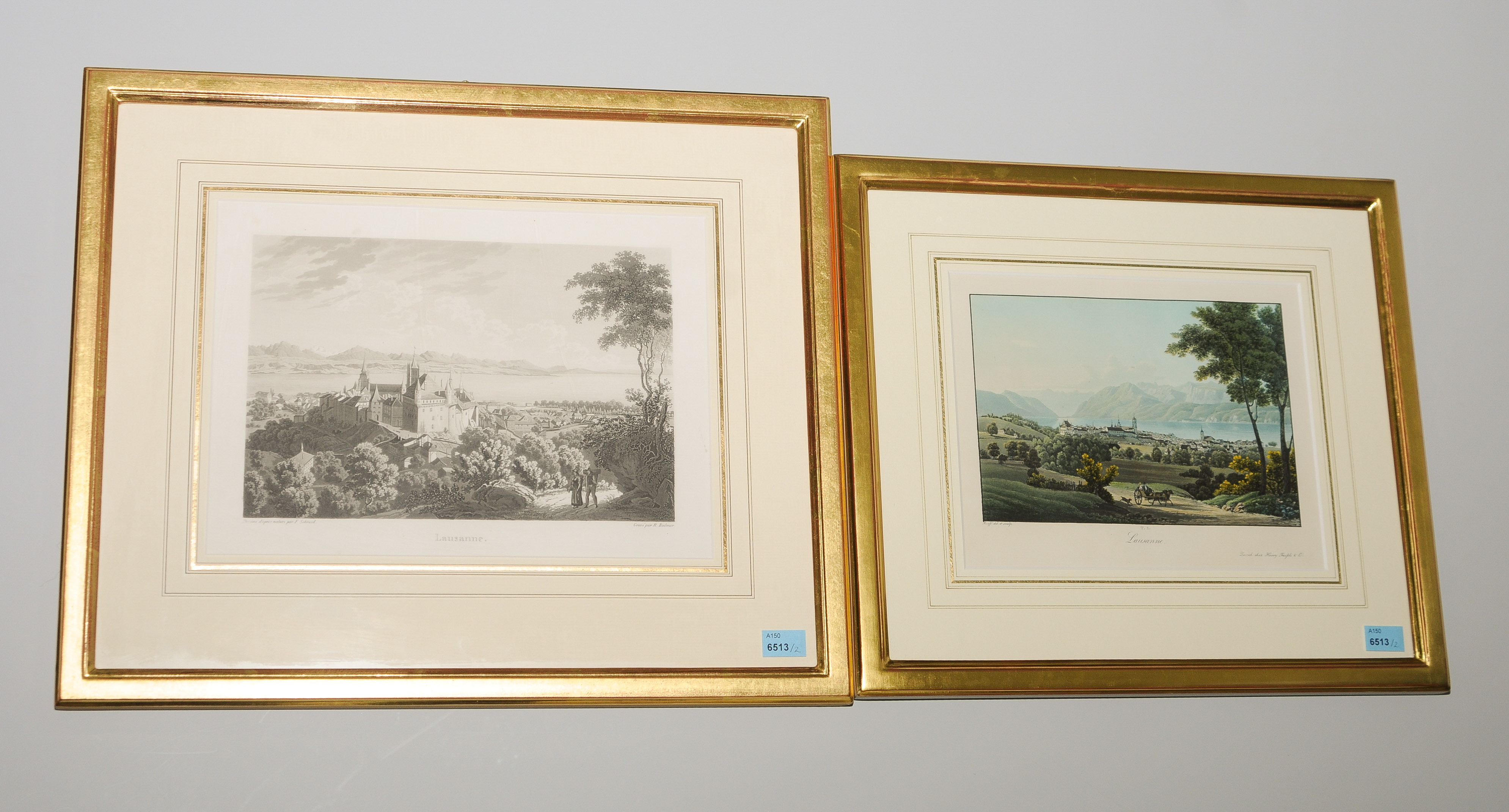 "Lausanne". Kol. Aquatinta von Joh. Ruff. Hrsg. v. Henry Füssli & Co., um 1840. 13,8x19,8 cm. Gerahmt. BEIGEGEBEN: "Lausanne". Aquatinta von R. Bodmer nach F. Schmid, um 1835. 16,3x24 cm. Gerahmt. Zus. 2 Bll.