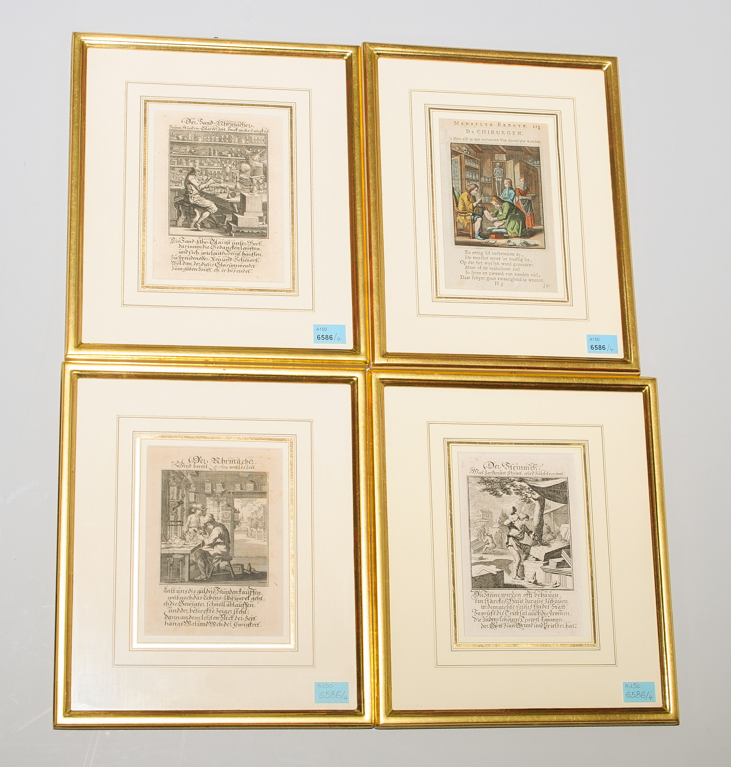 "Der Uhrmacher", "Der Sand-Uhrmacher" und "Der Steinmetz". 3 Kupferstiche, von Joh. Ch. Weigel, um 1698. Je ca. 8,5x7,8 cm. Beigegeben: "De Chirurgyn". Kol. Kupferstich, von J. und C. Luiken, um 1718. Je ca. 8,6x7,3 cm. Alle Bll. gerahmt.