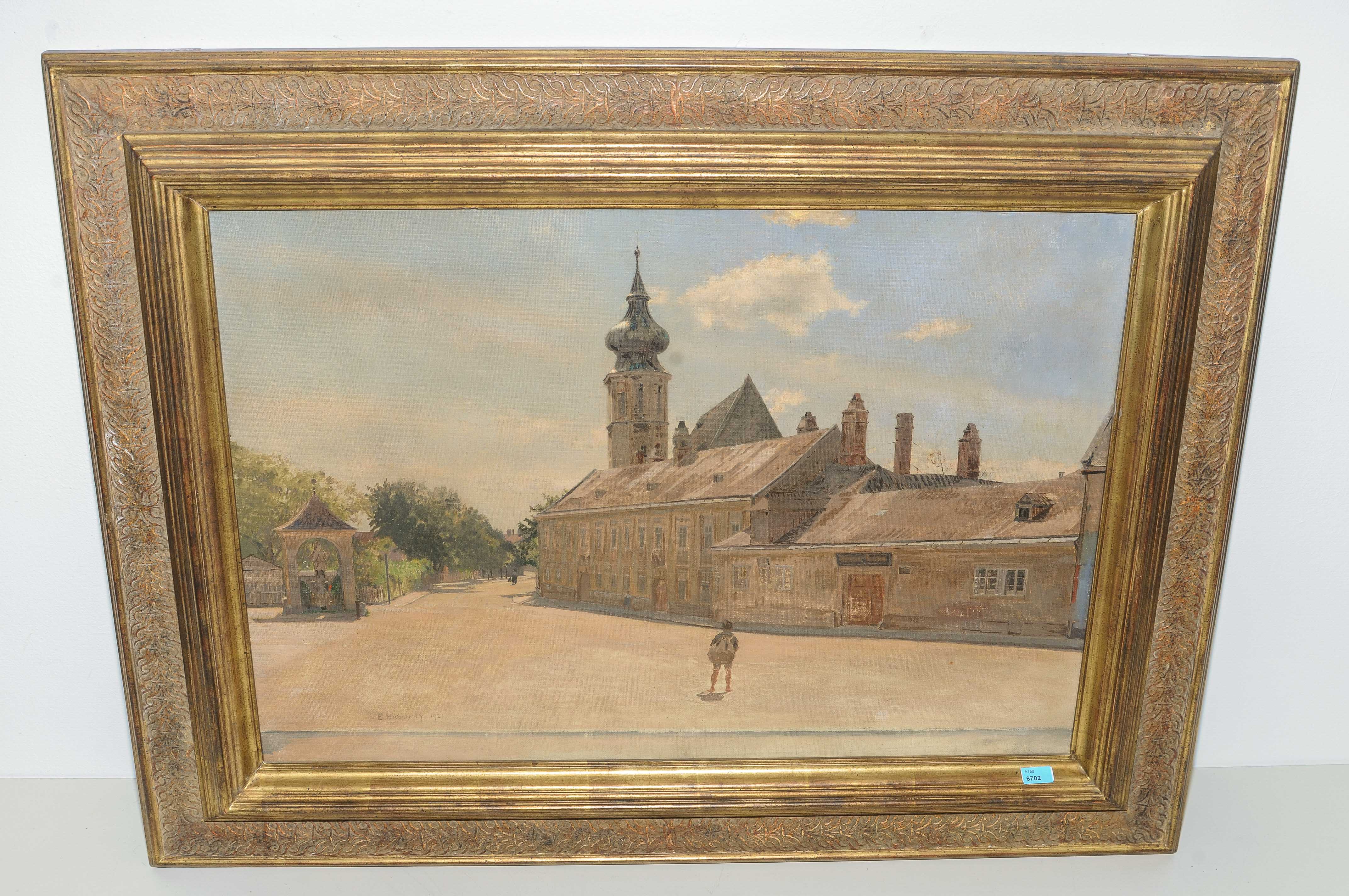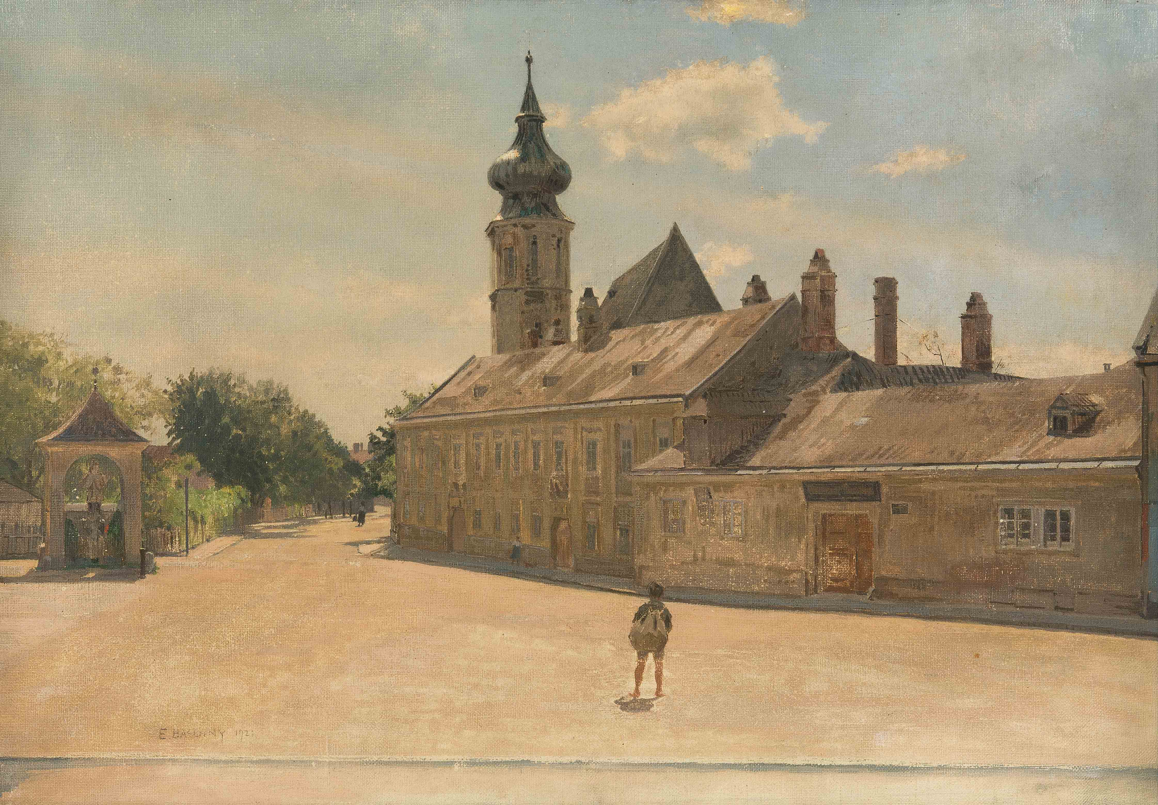 Pfarrkirche in Grinzing. 1921. Öl auf Leinwand. Unten links signiert und datiert. 47,3x68,1 cm.
