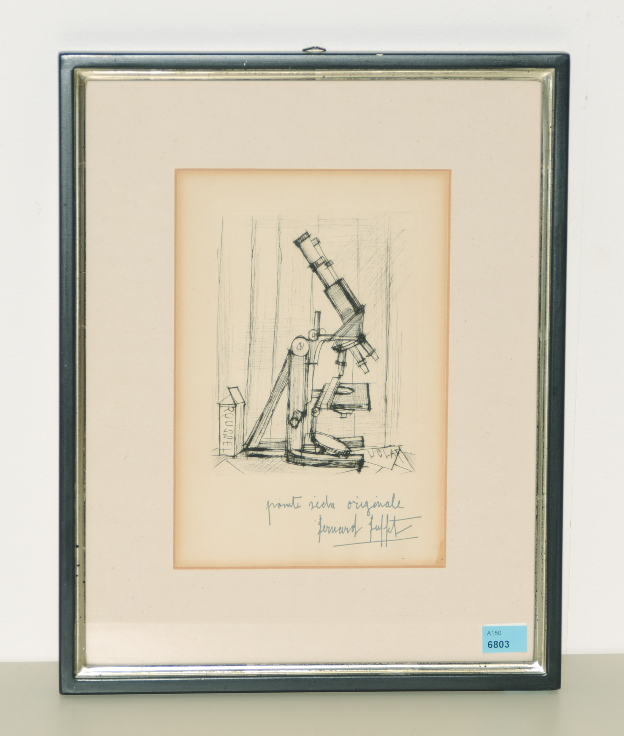 "Le Microscope". 1959. (Glückwunschkarte von Roussel-Uclaf für 1960). Radierung. Unten rechts im Druck bezeichnet und signiert. Lichtmass 21,5x14,5 cm. Gerahmt.