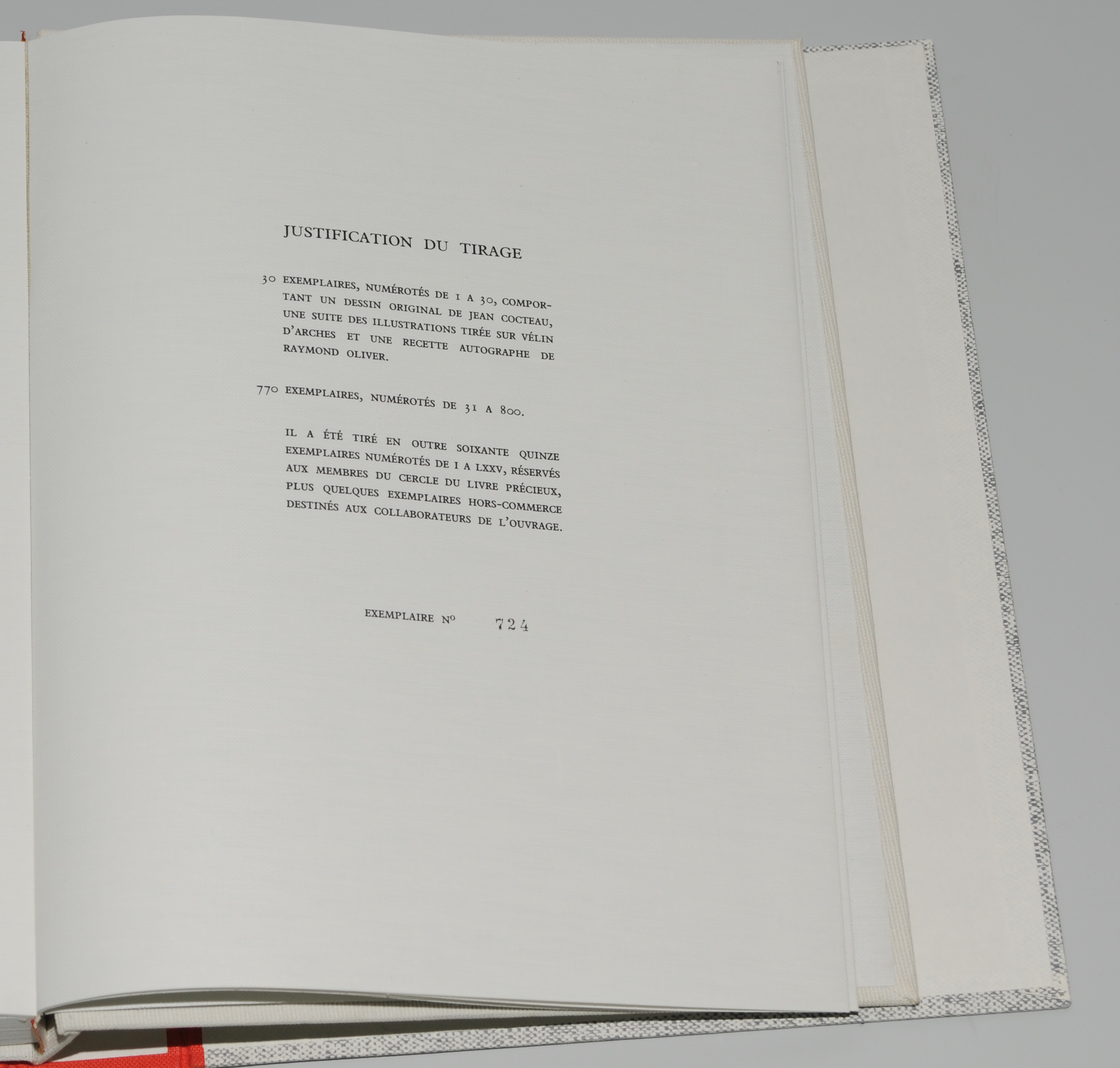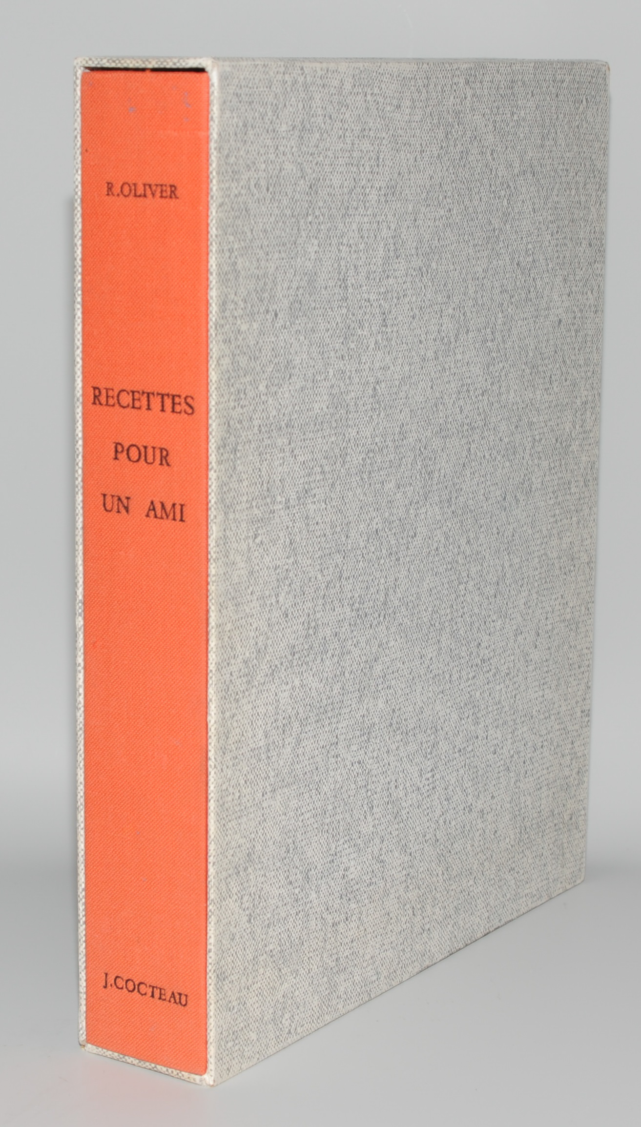 "Recettes pour un ami". Oliver (Raymond). Préface et illustrations de Jean Cocteau. Introduction de Emmanuel Berl. Paris, Giraudoux 1964. Kl. 4°, 123 S. Eins von 770 Ex. (GA 800). Leinenband in Halbleinen- Chemise und Schuber.